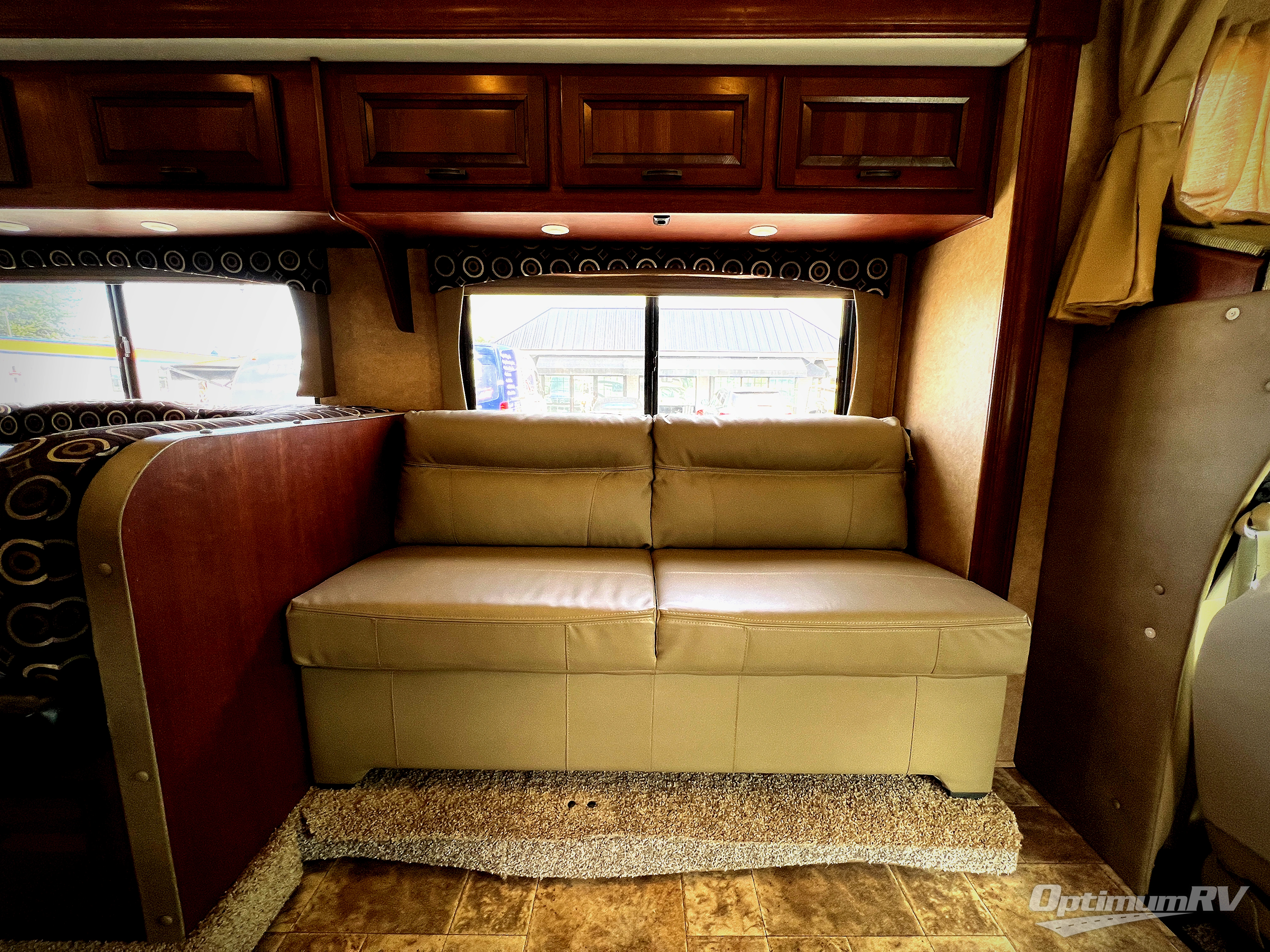 Opposite the kitchen, a slide out has a spacious u-shaped dinette and a 67" sofa, with overhead cabinet storage running the width of the slide.