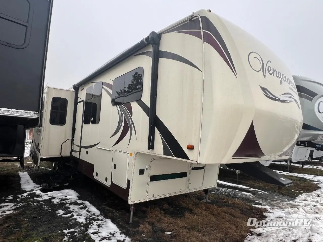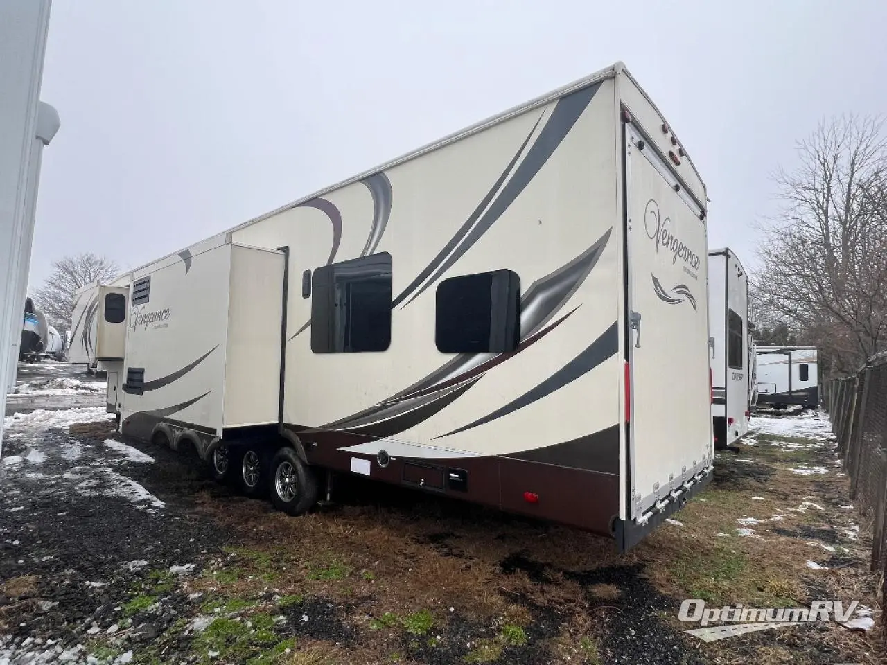 The Vengeance Touring Edition 39R12 toy hauler fifth wheel by Forest River offers triple slides and a large cargo area.