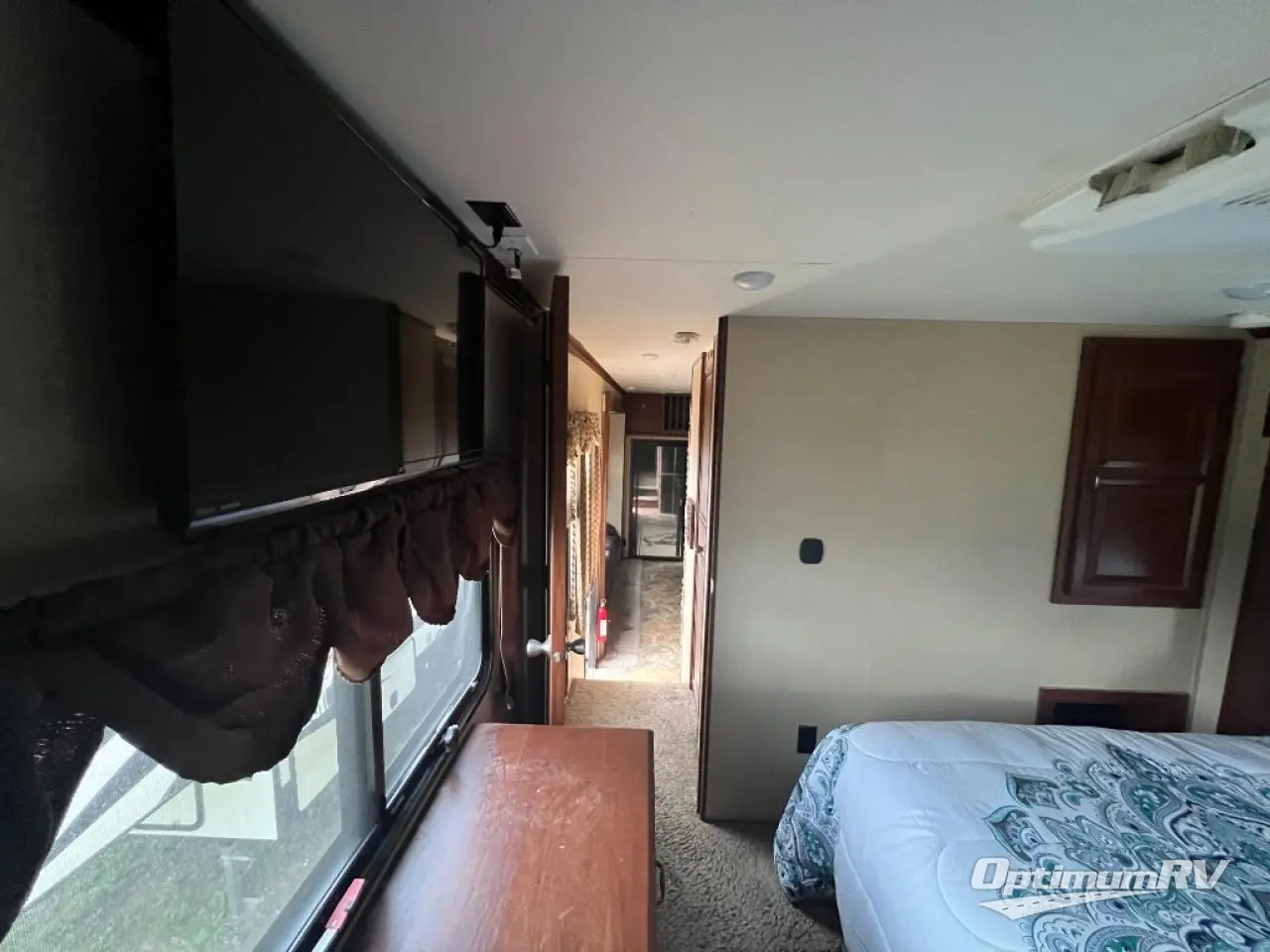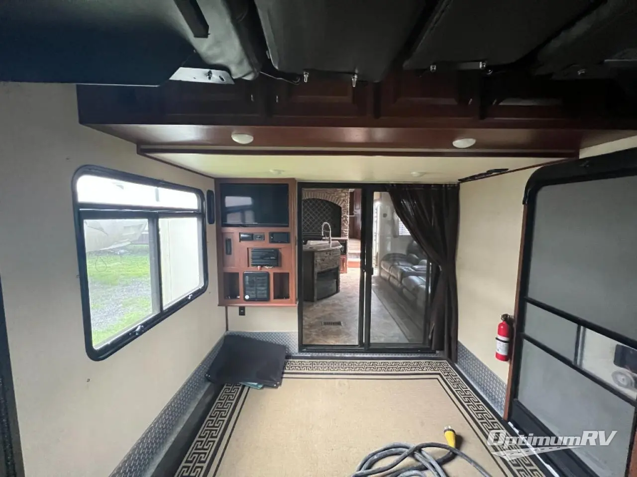 As you proceed toward the rear of the fifth wheel, you will find a loft with a cabinet and TV and entertainment center.