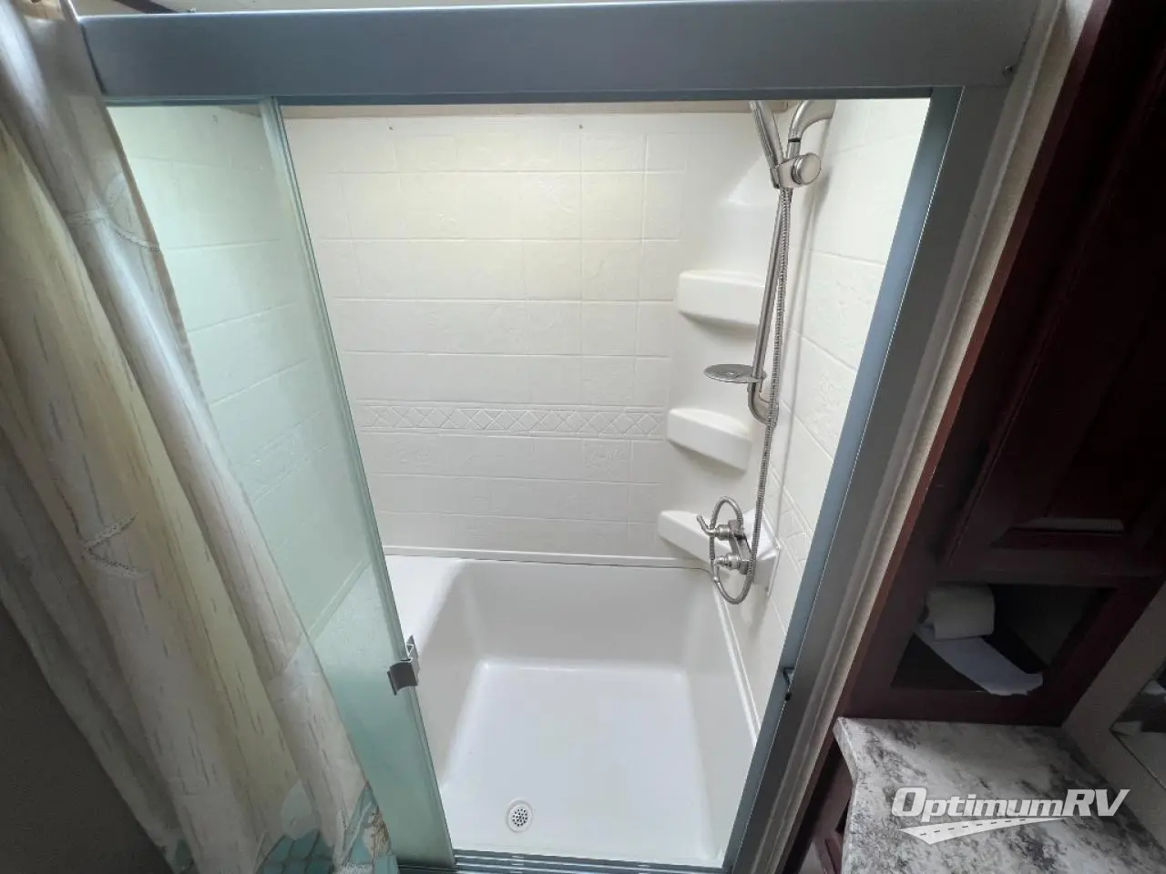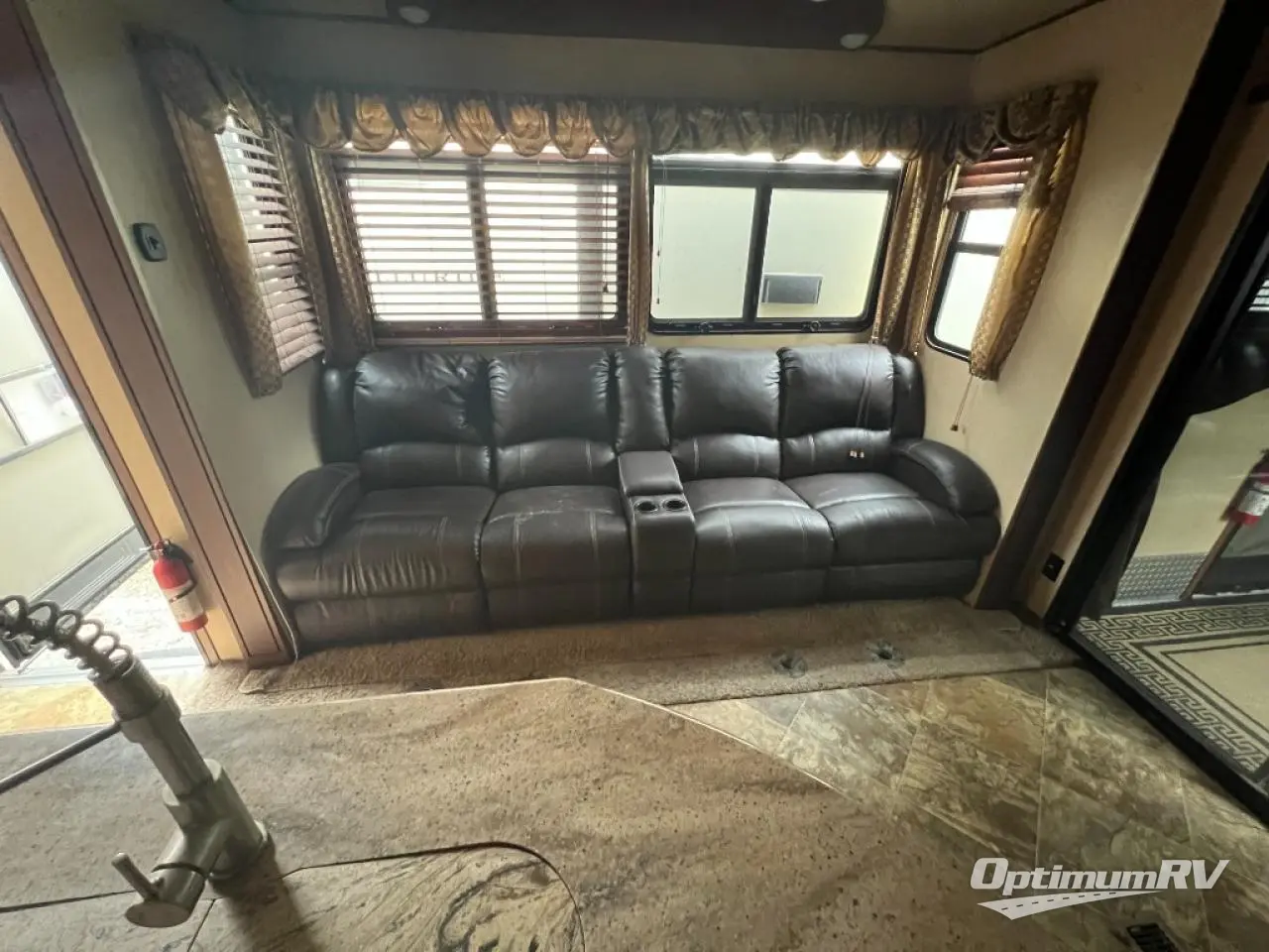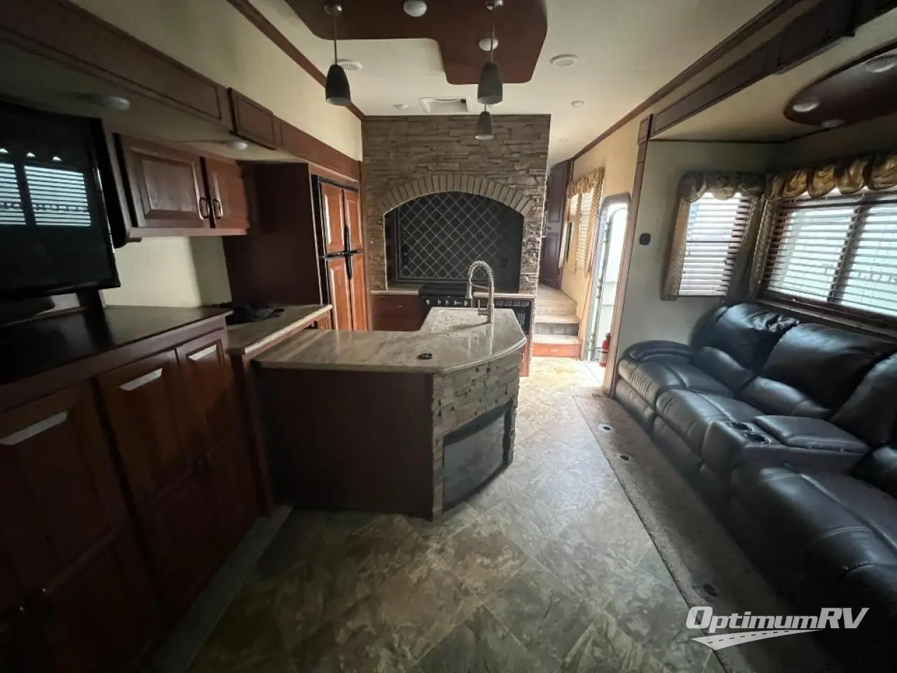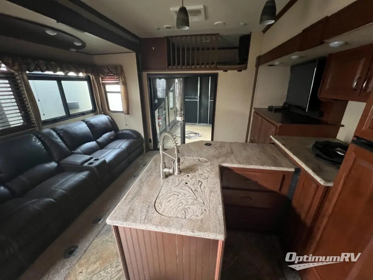 To the left of the entrance, there is a slide with theater seating. The opposite side of the fifth wheel offers a slide with a pantry, entertainment center, and refrigerator. There is plenty of counter space and a double kitchen sink. You will also find a three burner range, and a microwave.