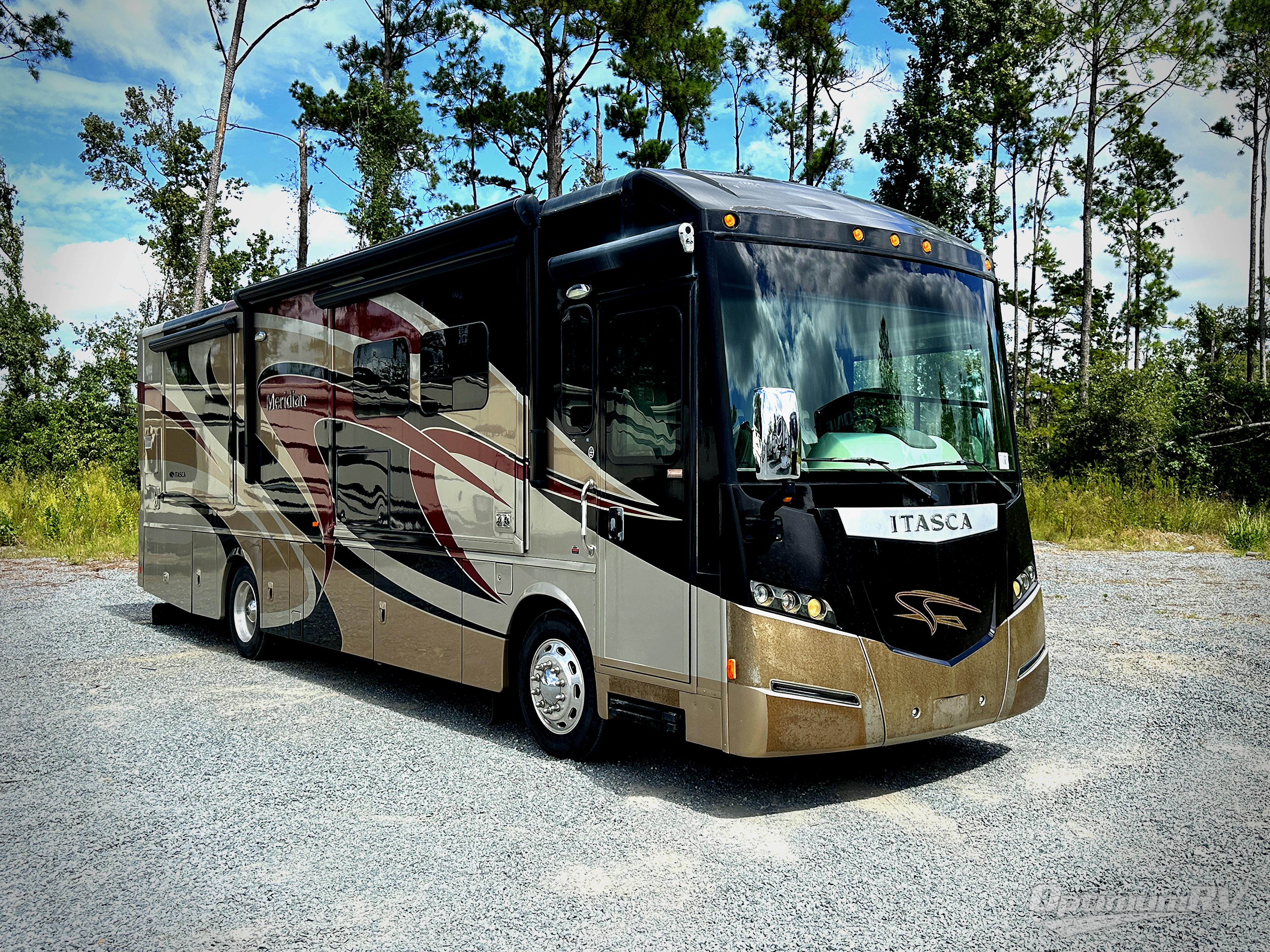 Itasca Meridian Class A Diesel Coach w/Rear Wardrobe/Storage, Slideout Queen Bed w/Nightstands, Sliding Door Between Bedroom & Living Area, Bath w/Shower, Toilet &u Vanity w/Sink, Bedroom Chest of Drawers/Pantry/4 Door Refrig./3 Burner Range/Dbl. Kitchen Sink/Extendable Dining Table & Chairs w/Buffet Full Wall Slideout, Over Cab Storage, Extendable Sectional Comfort Sofa Sleeper and Much More! Avail. Options May Include: King Bed, Residential Refrig., Washer/Dryer, 2 Ottomans.