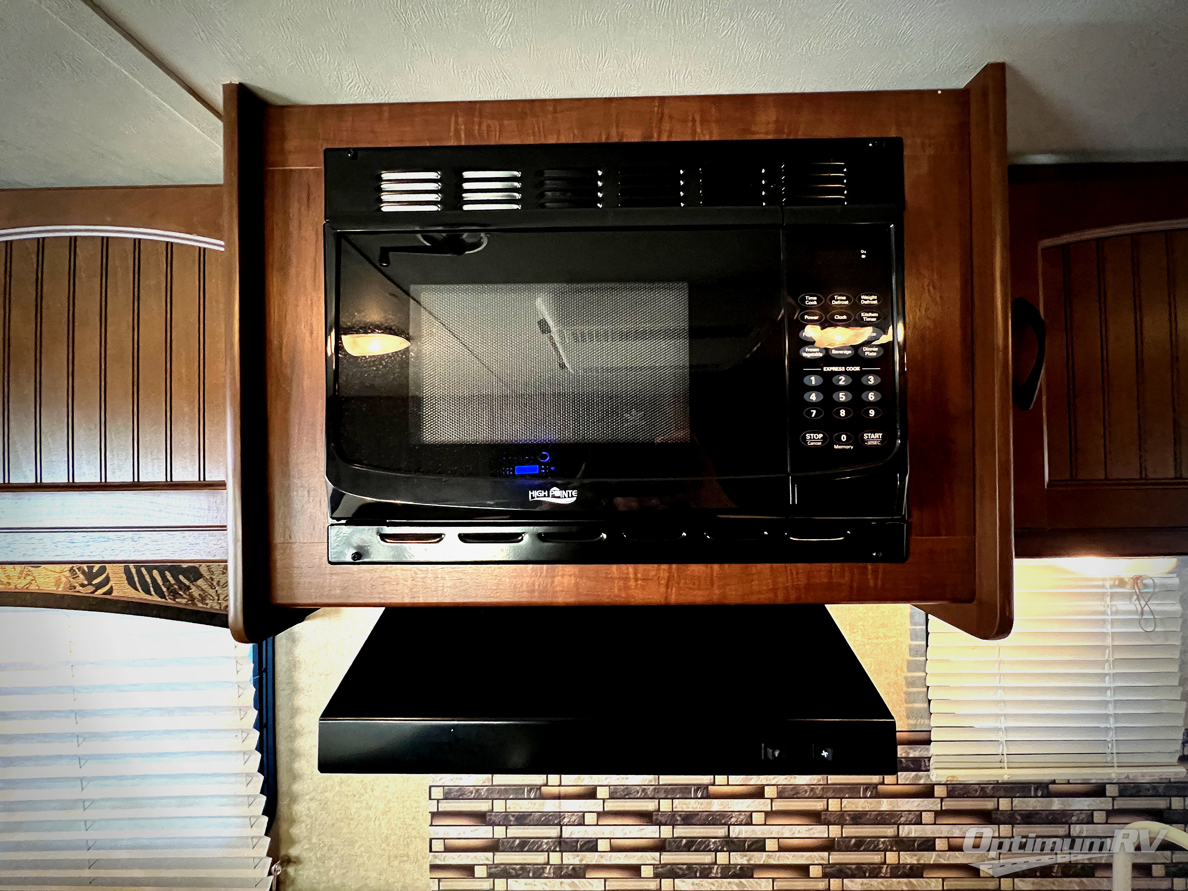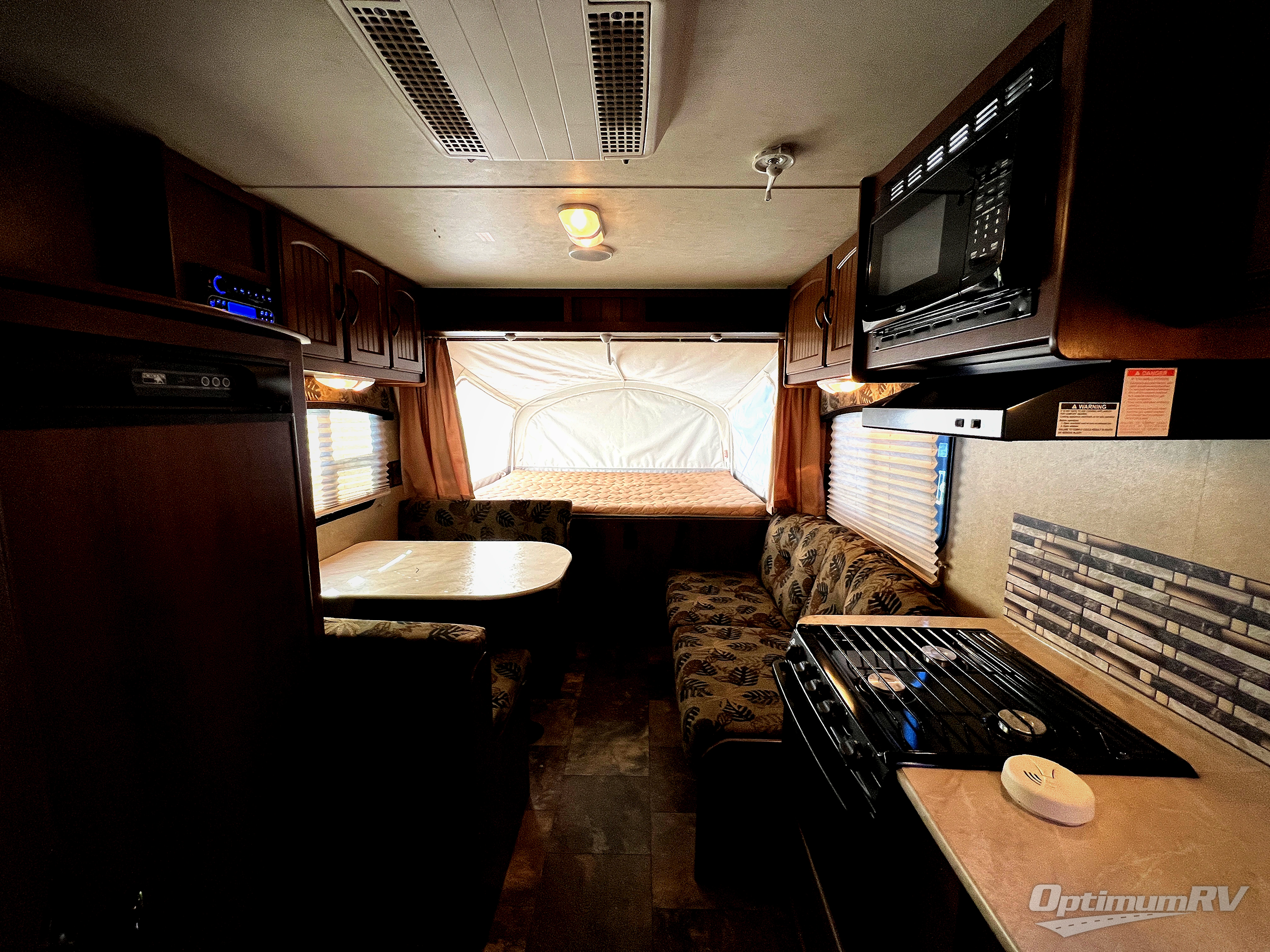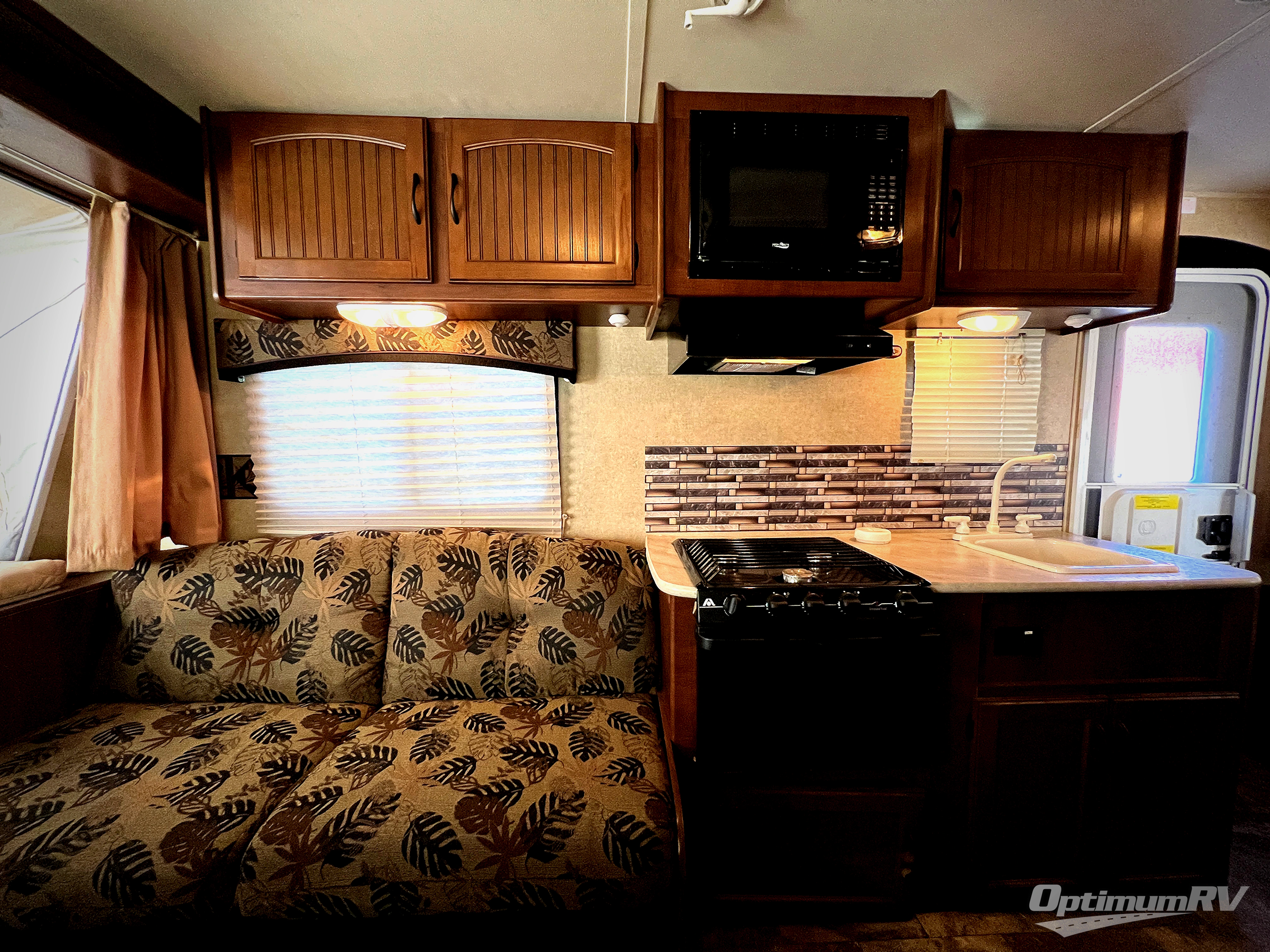 The Jay Feather Ultra Lite 16V travel trailer by Jayco offers a front u-dinette with storage below the dinette. Along one side you will find a sink, three burner range, microwave, and refrigerator.