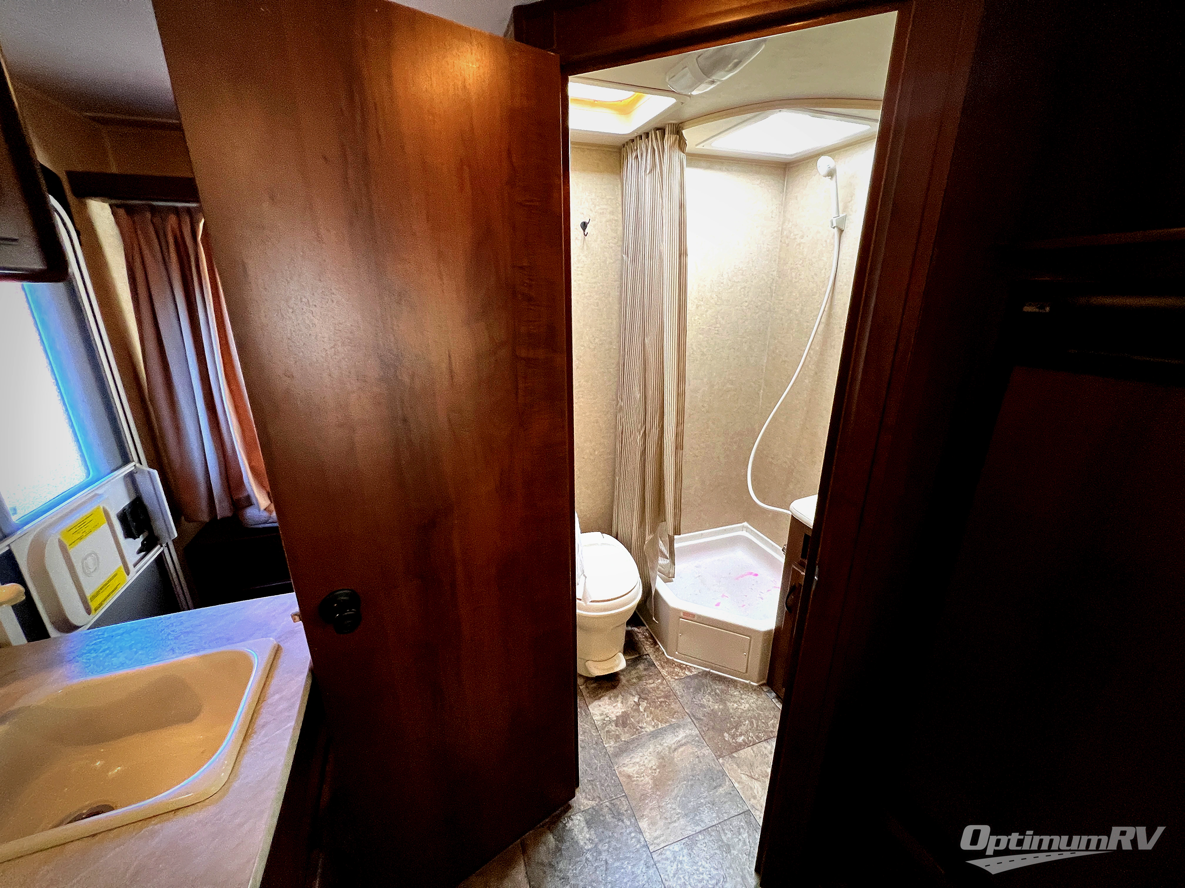 In the rear of the travel trailer, there is a bathroom with a toilet, and tub/shower.