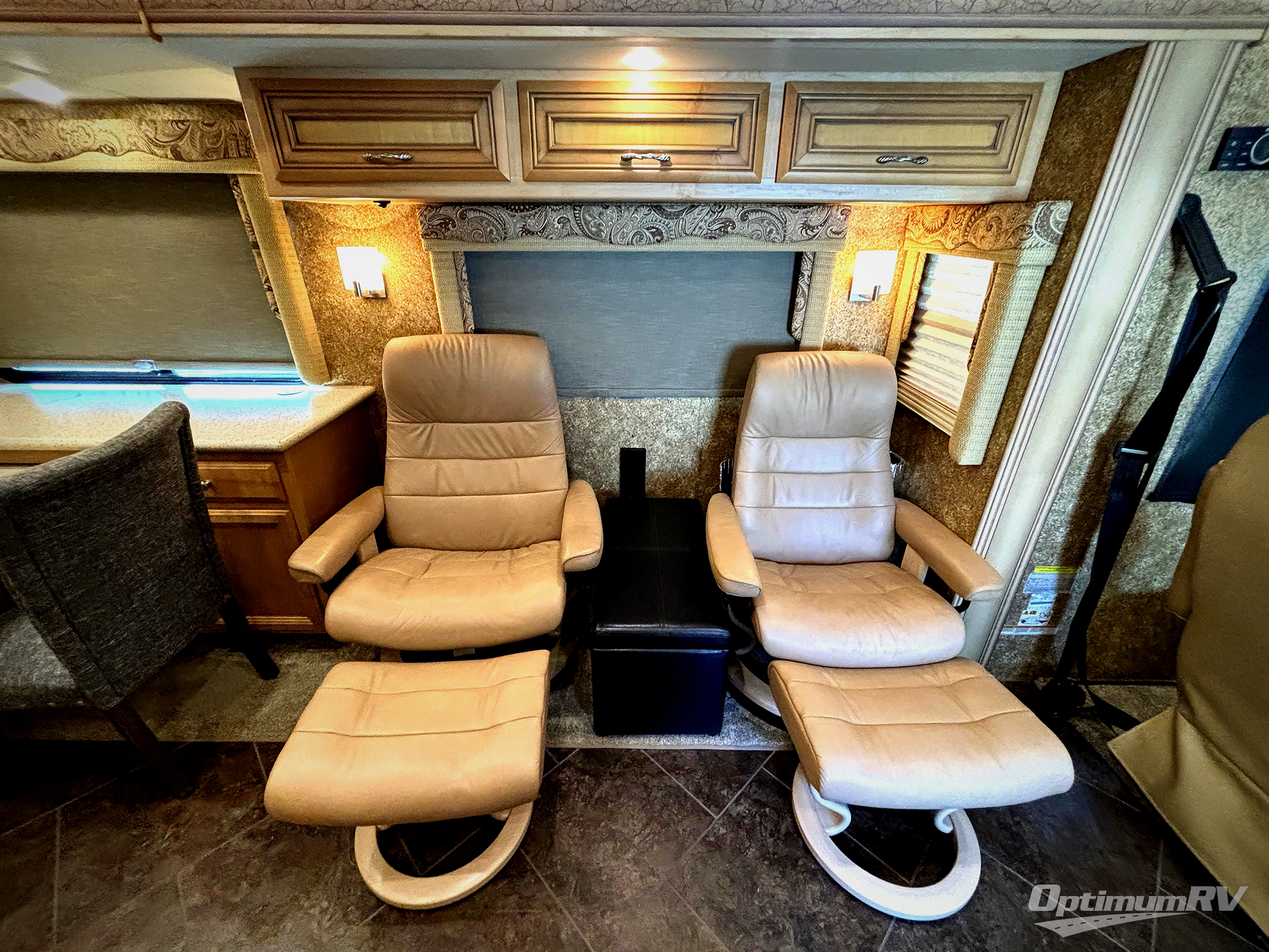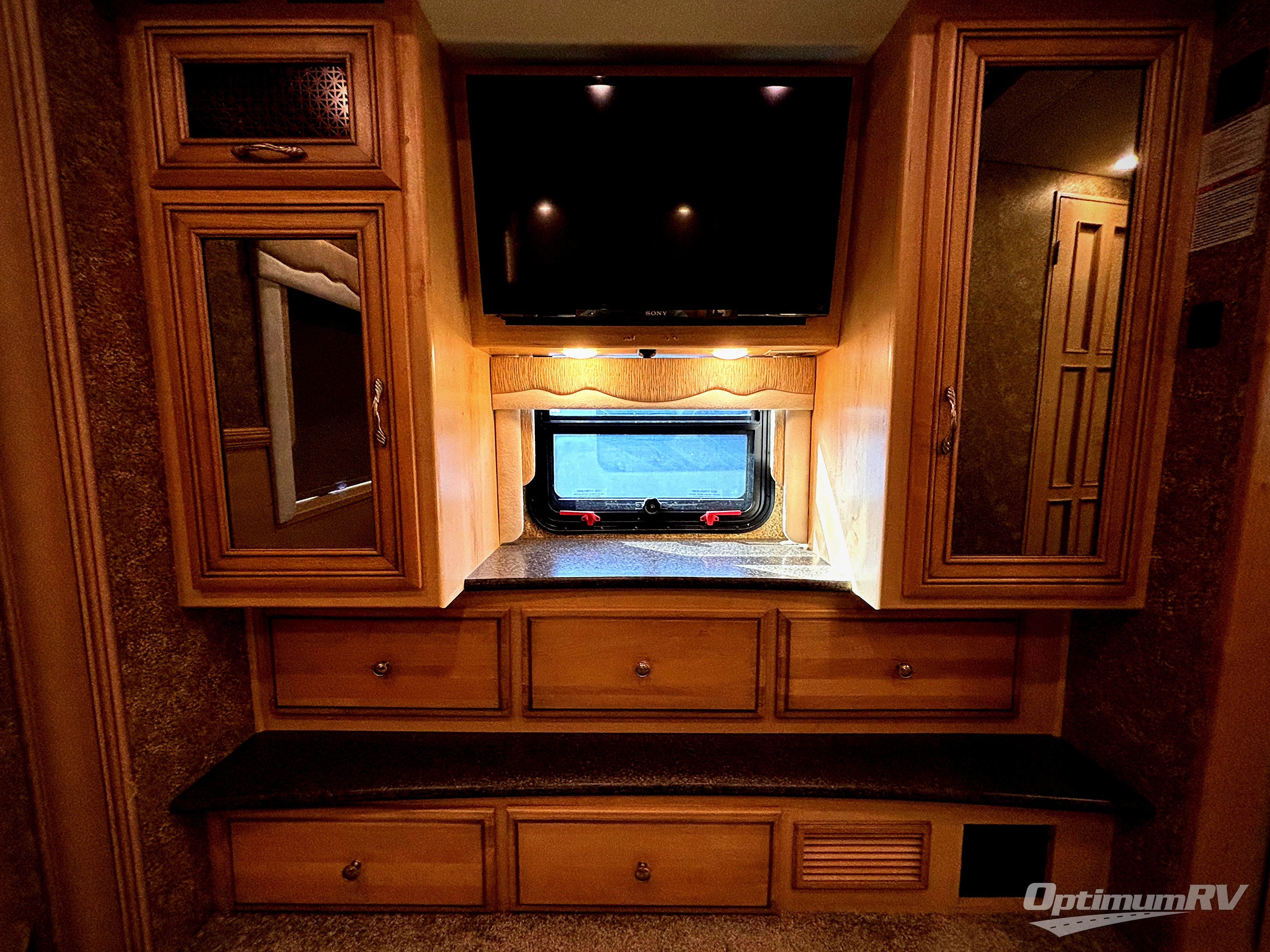 There are plenty of overhead cabinets throughout the motor home, as well as an overhead TV in the front.