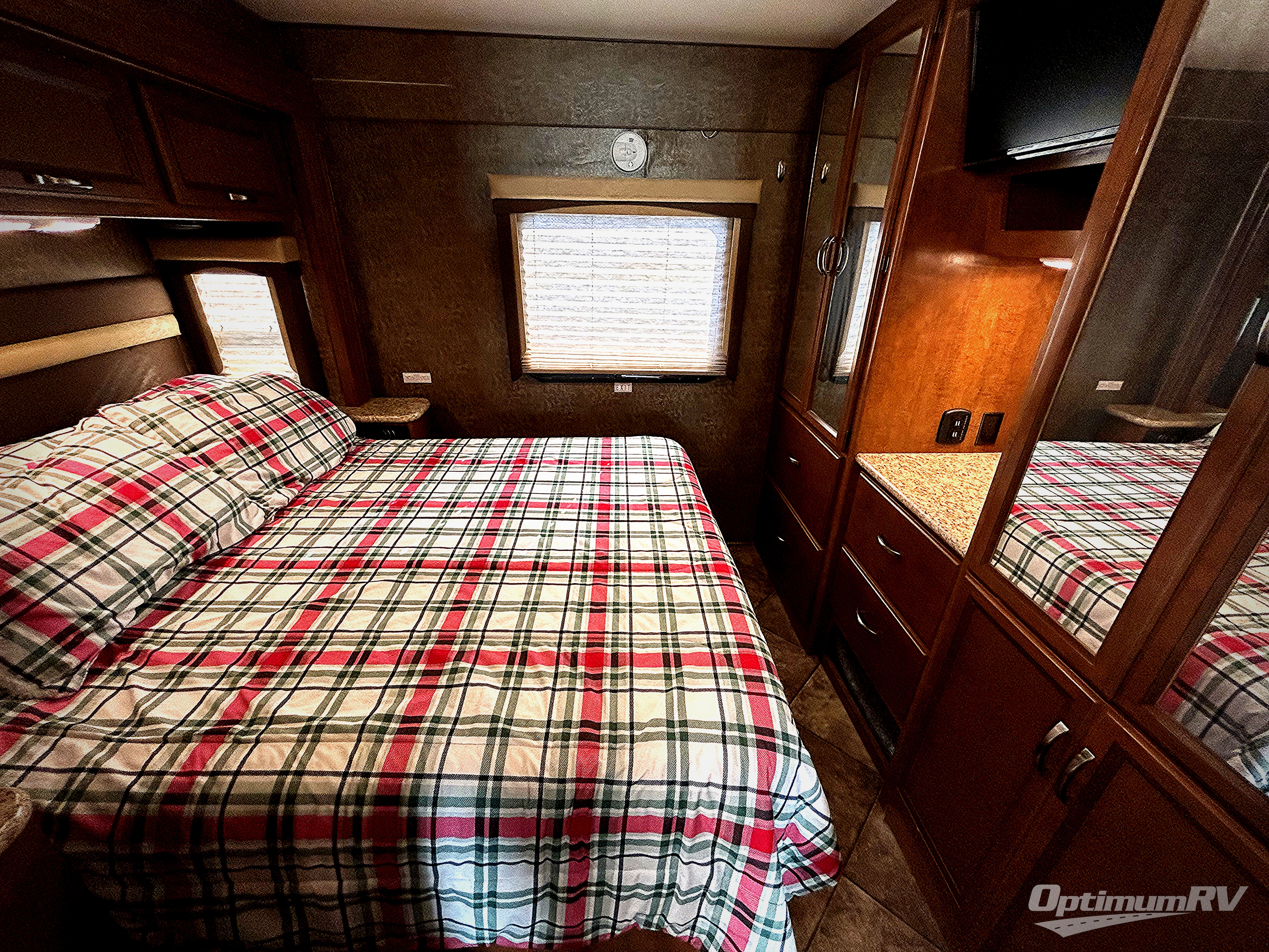 As you enter the rear bedroom you will see a comfy queen bed slide with nightstands, and plenty of closet and drawer storage on the right.