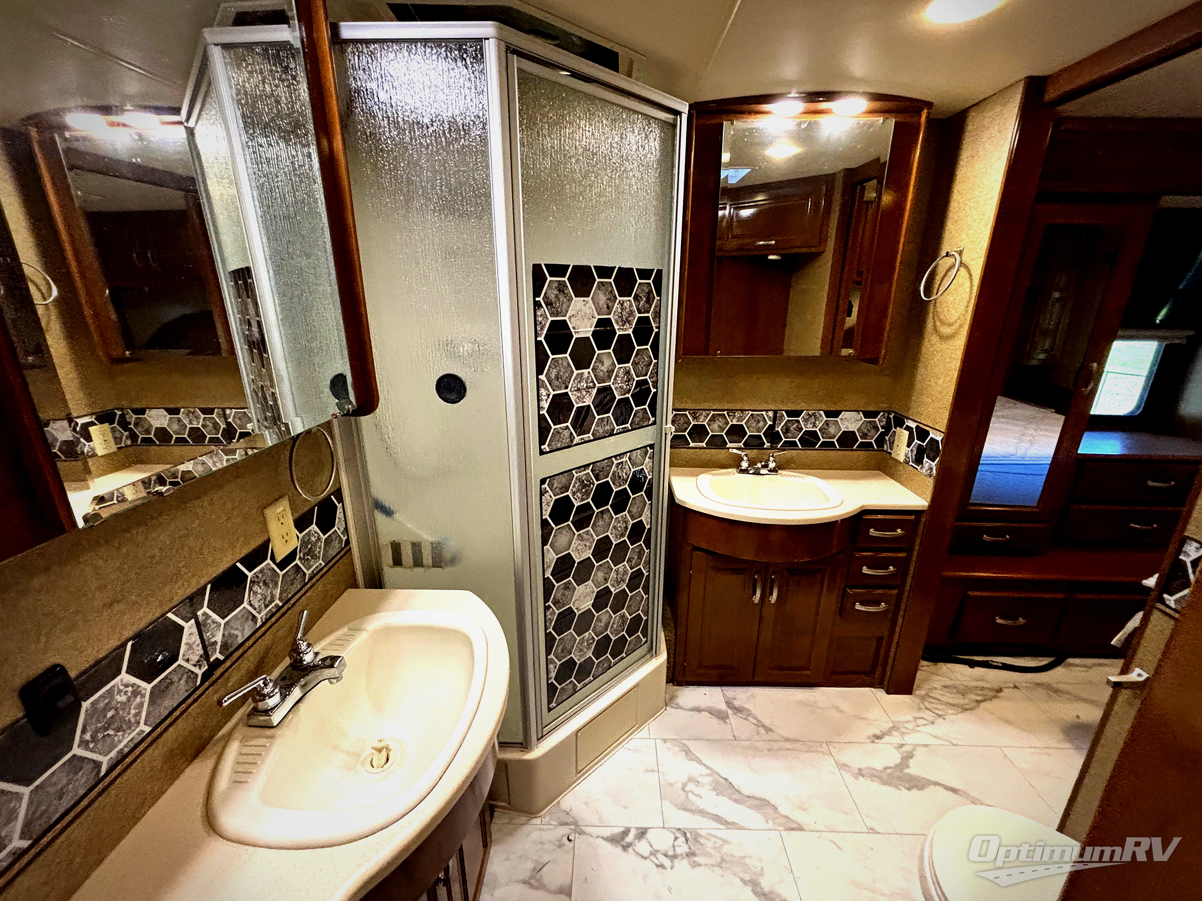 Heading toward the rear of this Challenger 37GT you will walk-thru a complete bath with angled shower, toilet, sink with overhead cabinet, full length mirror, and closet with stackable washer and dryer prep.
