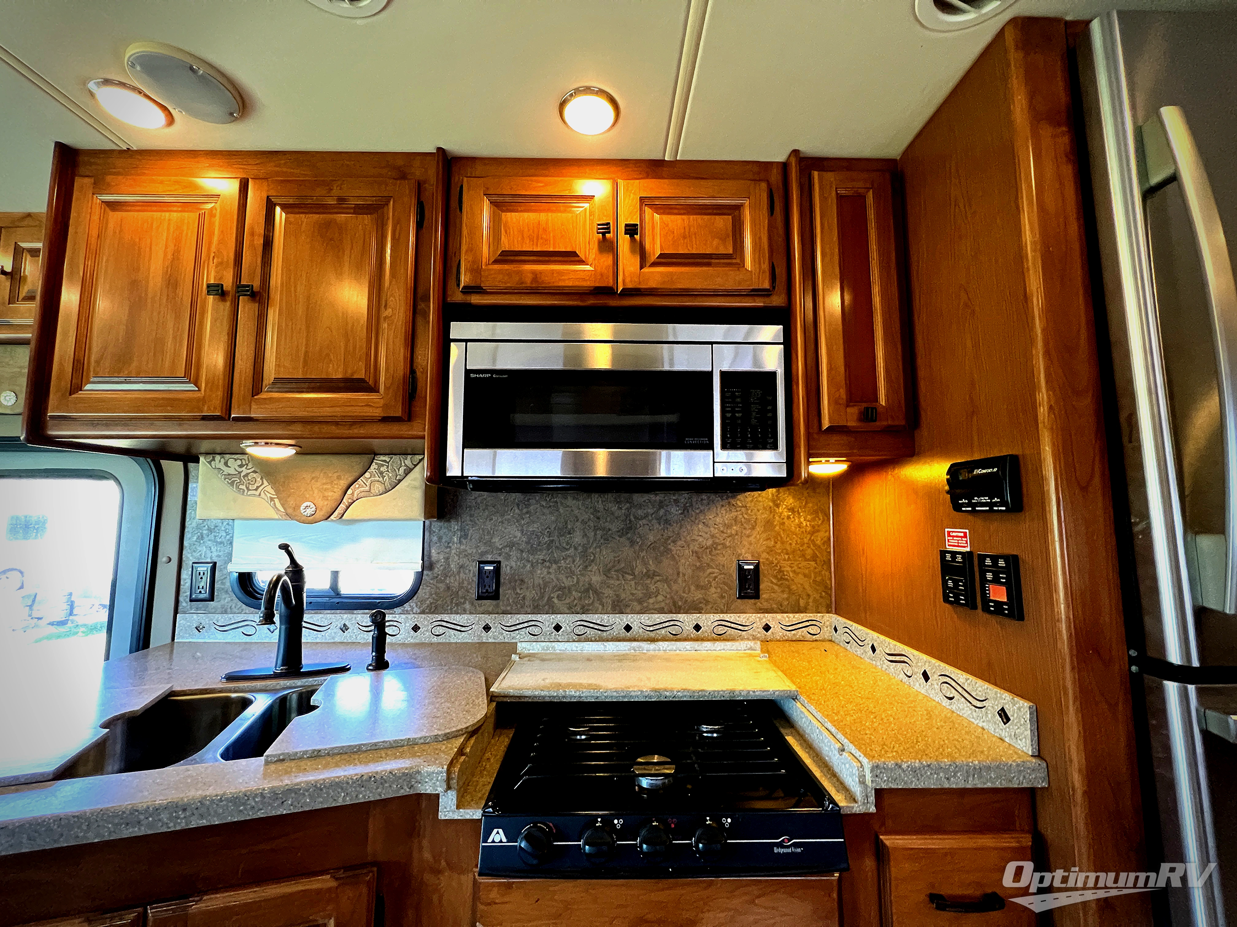 The kitchen runs along the curb side and includes overhead cabinets, an angled double sink, an overhead microwave, a three burner range, a refrigerator and a pantry.