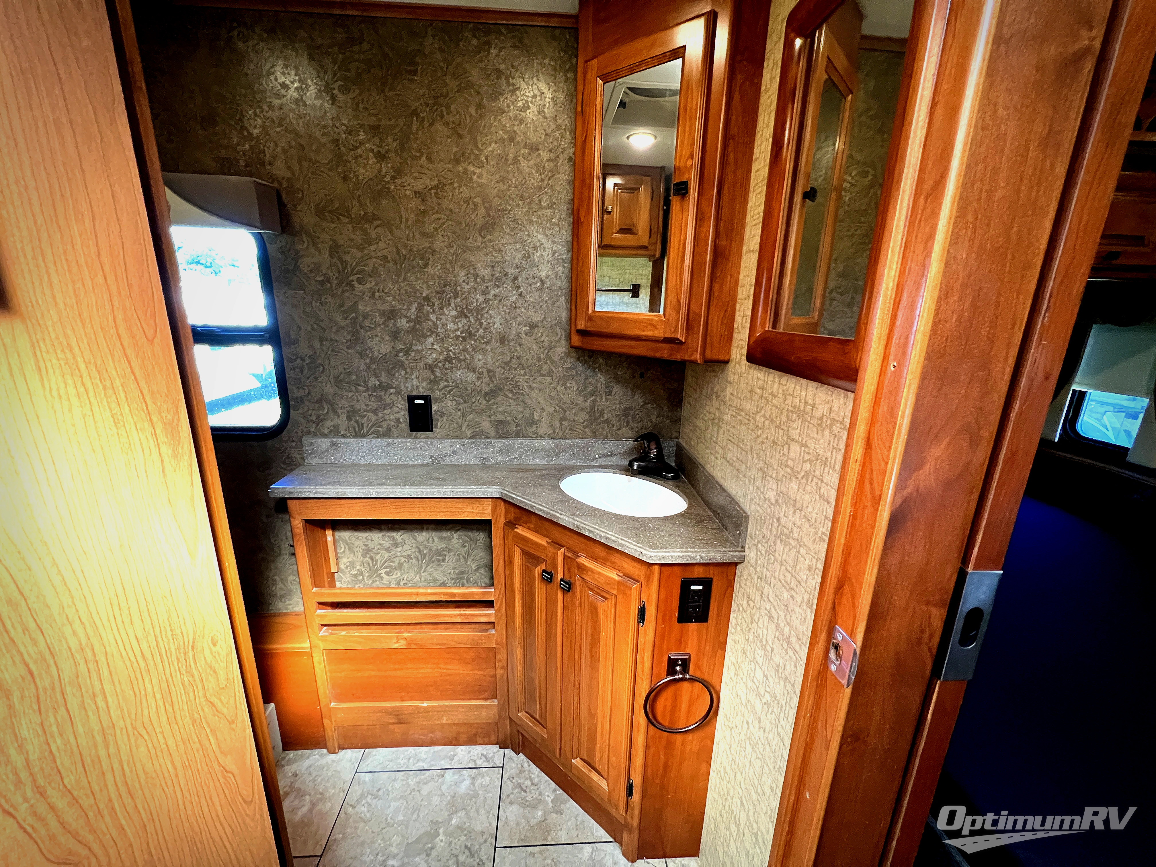 The rear bedroom includes a slide with a queen bed that has nightstands at each side and overhead cabinets above the head of the bed. The rear wall of the coach features closed storage, while the wall opposite the bed features a wardrobe with drawers below, and a vanity with a TV above it.