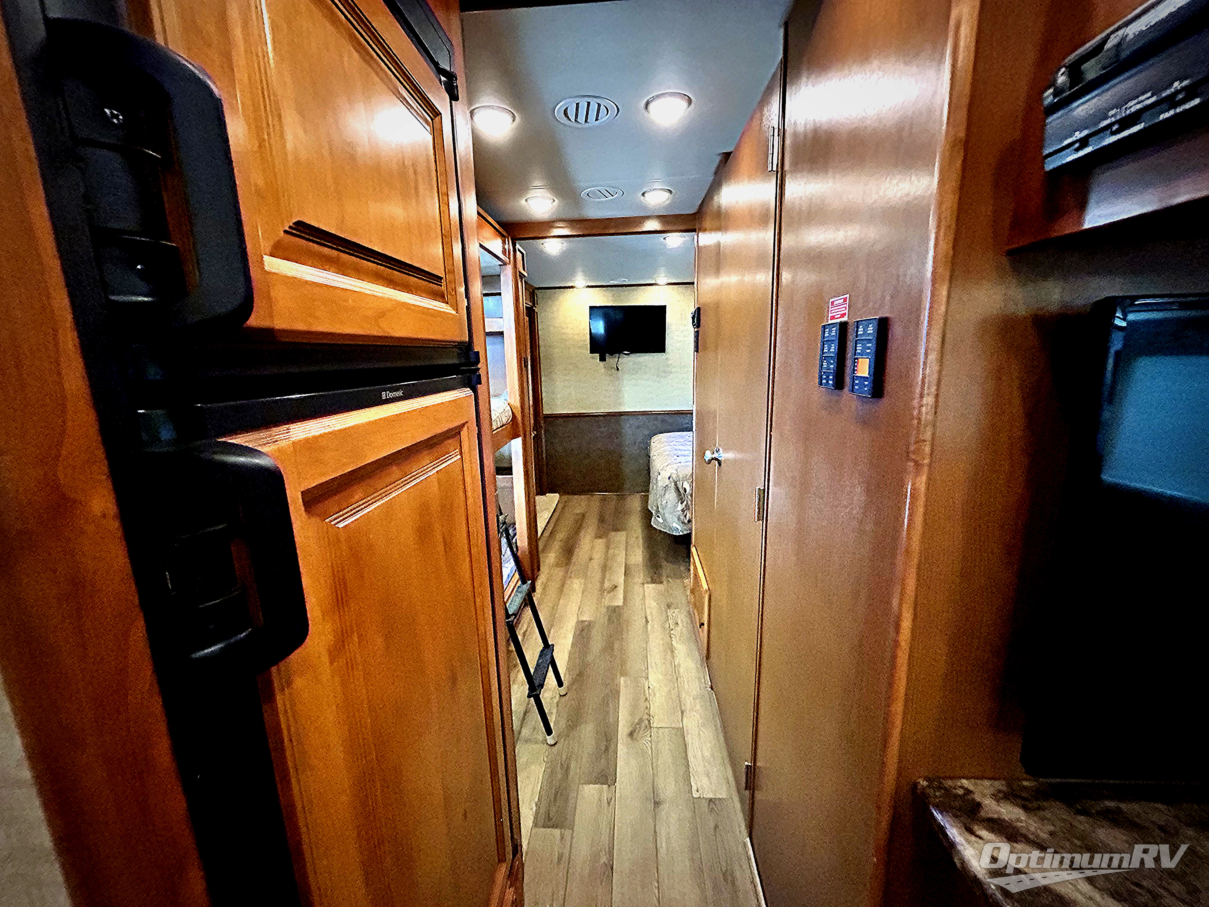 A rear bedroom includes a queen bed slide out with nightstands at each side of the bed and overhead cabinets above. A TV is mounted in the corner with the wall opposite the bed housing a wardrobe with drawers below.
