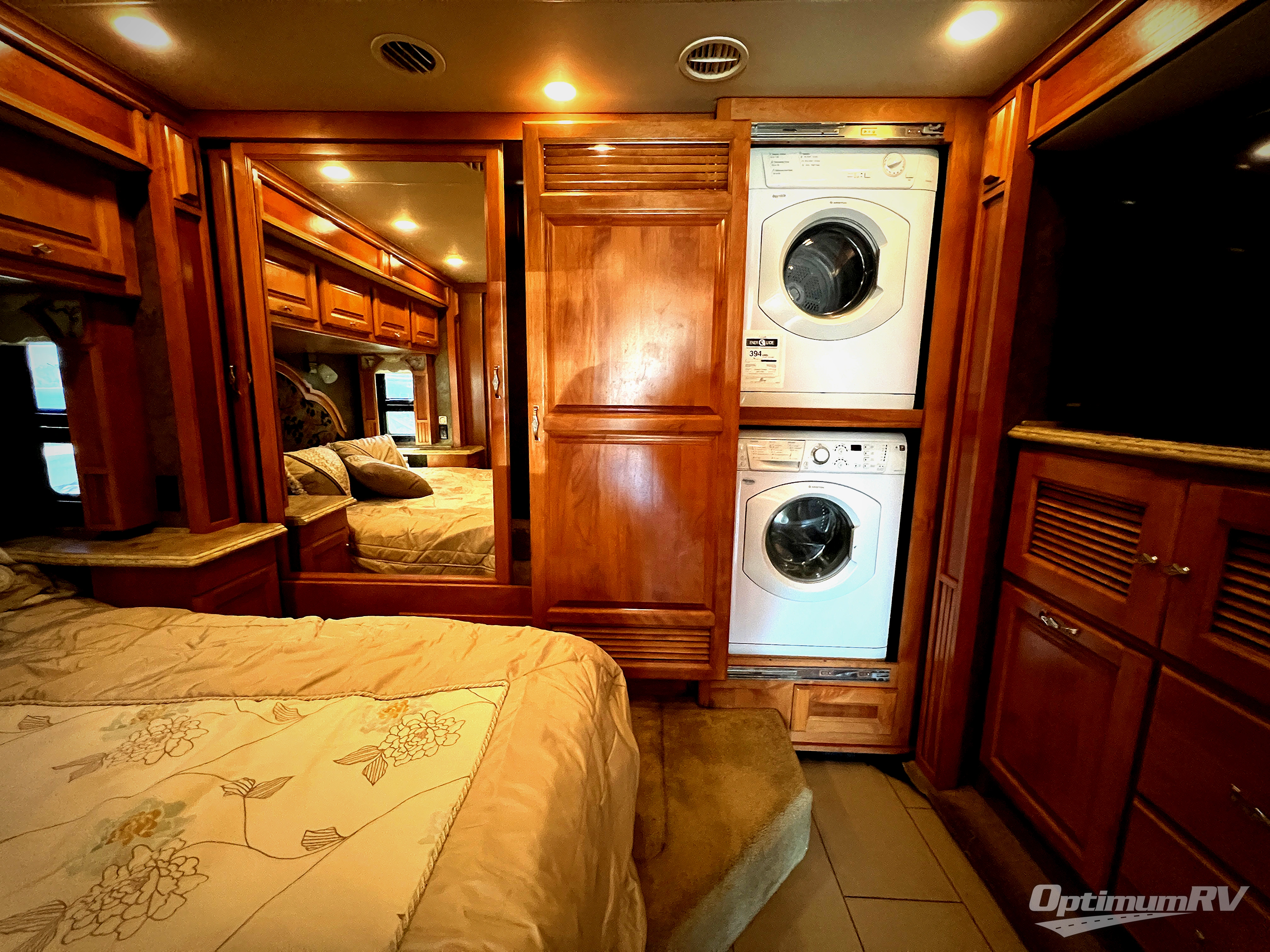 A rear master bedroom includes a queen size bed within a slide, nightstands at each side and overhead cabinets above. You may choose a king size bed for this room. The rear wall holds a closet and a corner closet for an optional washer/dyer. The wall opposite the bed includes a second bedroom slide out with an overhead TV, overhead cabinets and drawers below.