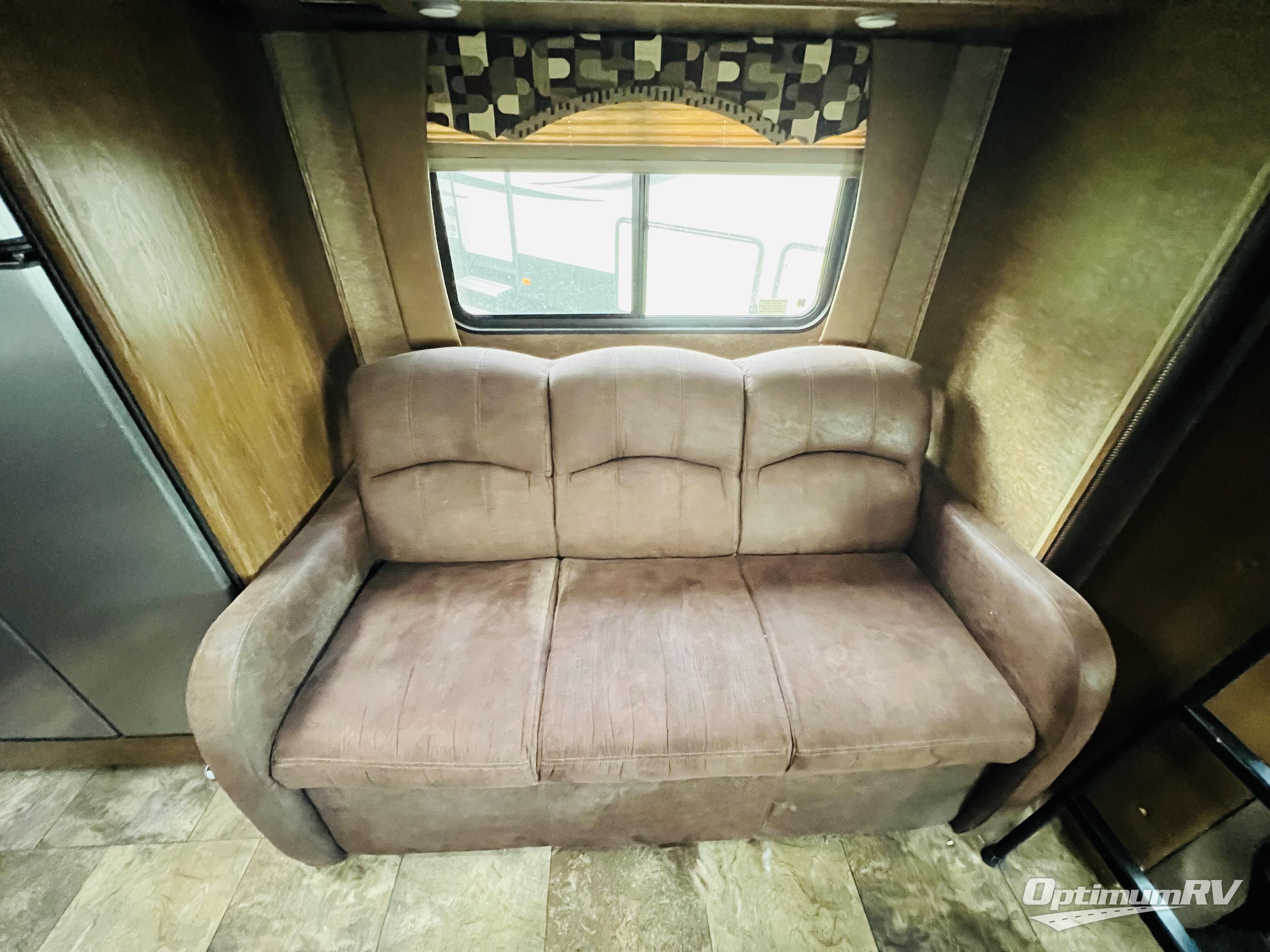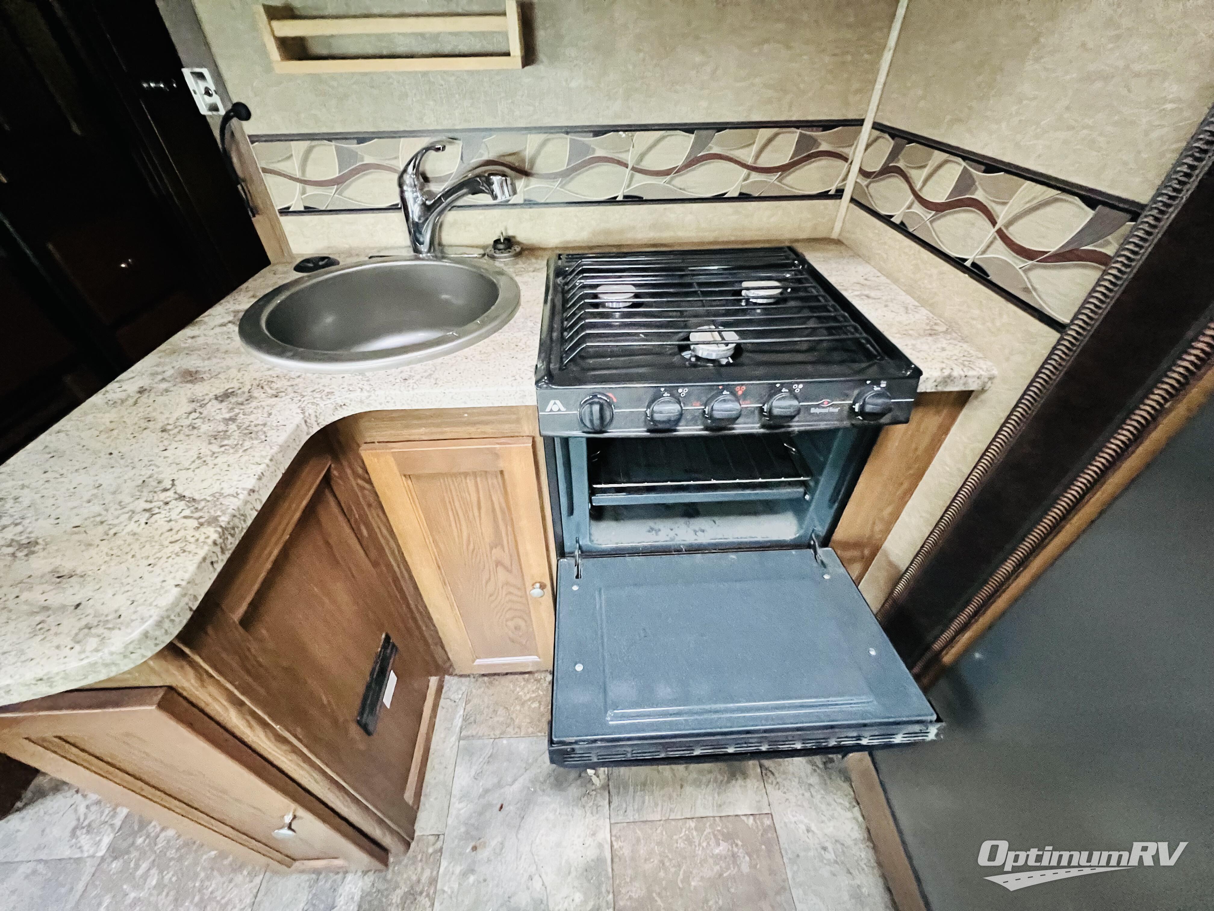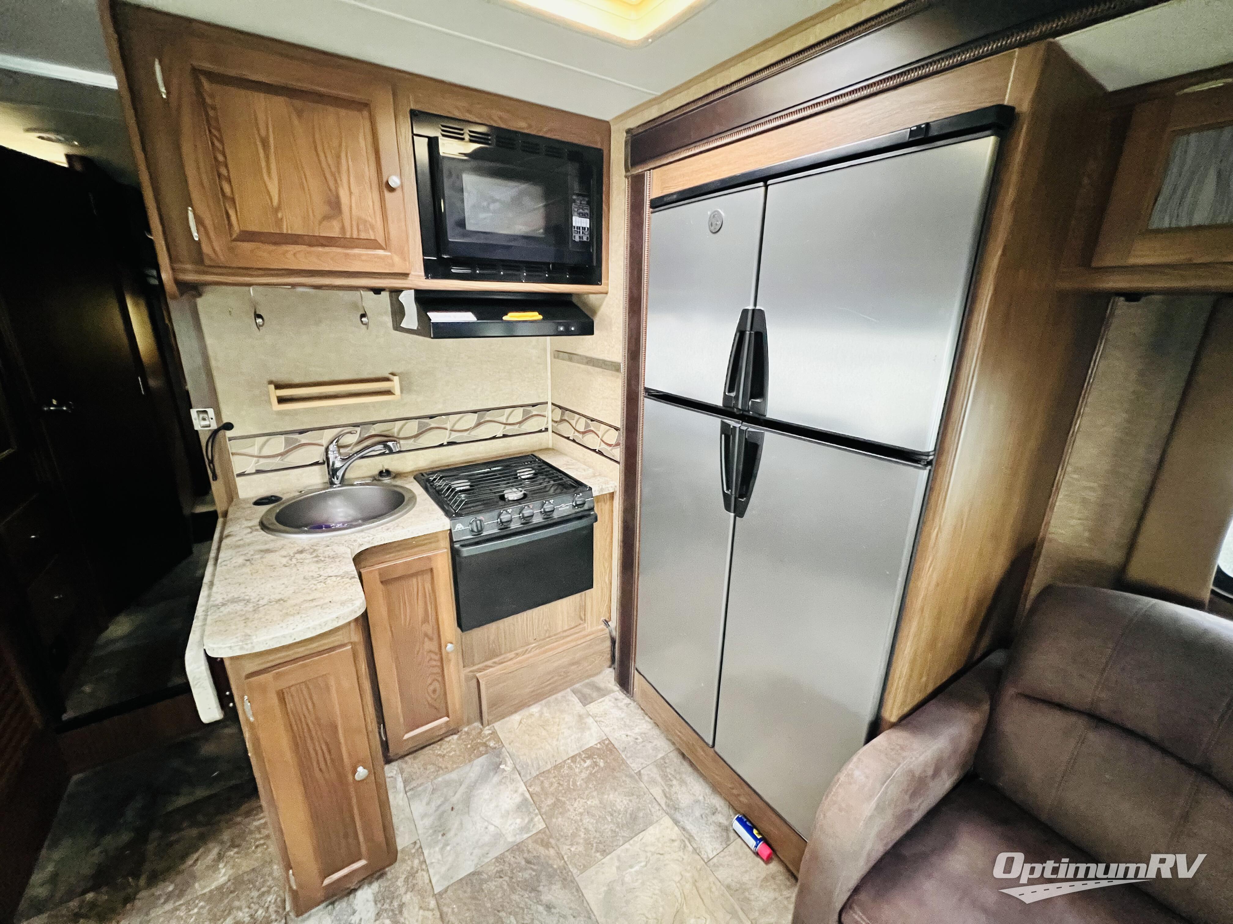 Step inside and find the kitchen area straight ahead. There is a pantry to your immediate left as you enter. An L-shaped counter provides a round sink with storage above, and a three burner range with overhead microwave oven. There is a slide out straight across from the door that also features a refrigerator, and sofa with cabinets or theater seats that recline with a cup holder between.