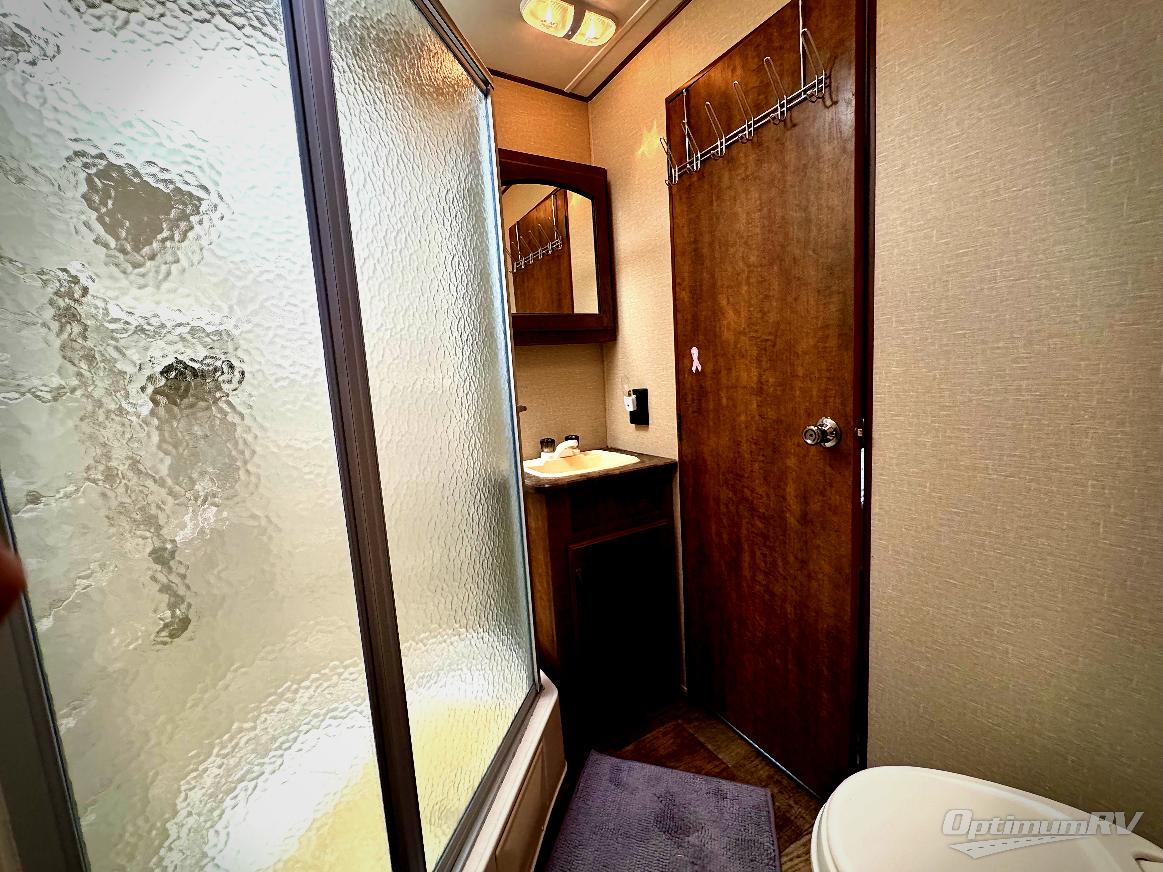 As you enter the travel trailer, along the rear wall you will notice two swivel rockers. The slide has a sofa and super booth dinette. In the corner you will find an entertainment center. On the opposite side of the travel trailer there is a double kitchen sink, range, microwave, refrigerator, pantry, and corner linen cabinet.