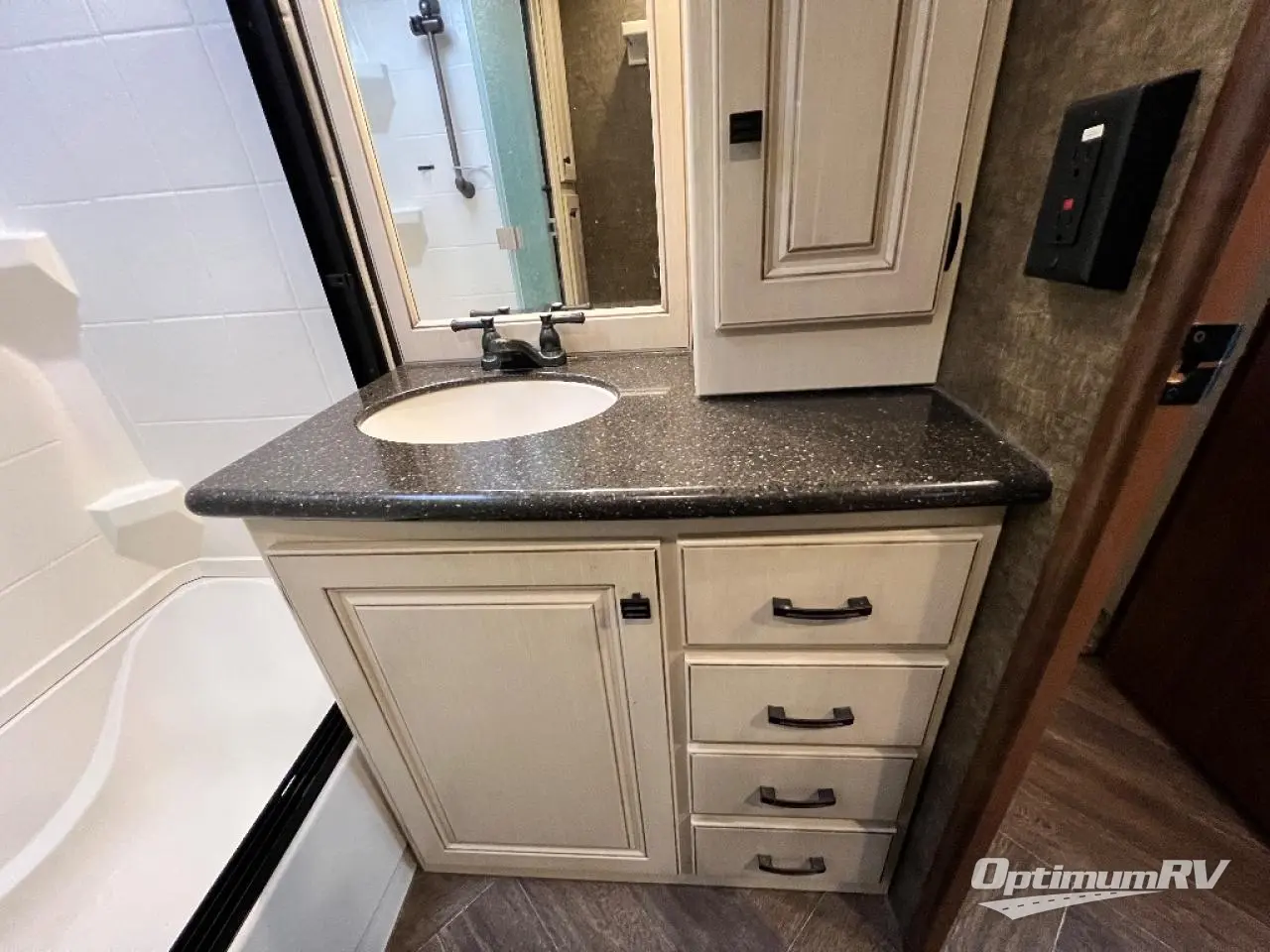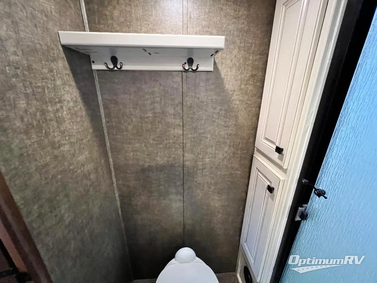 The private front bedroom provides a quiet retreat away from the main living area and features a slide-out queen bed with nightstands. You can also choose the optional king size bed if you enjoy a bit more sleeping space. There is a dresser opposite the bed and a wardrobe in front with sliding doors. There is also a closet that has been prepped for a washer and dryer for added convenience, and so much more!