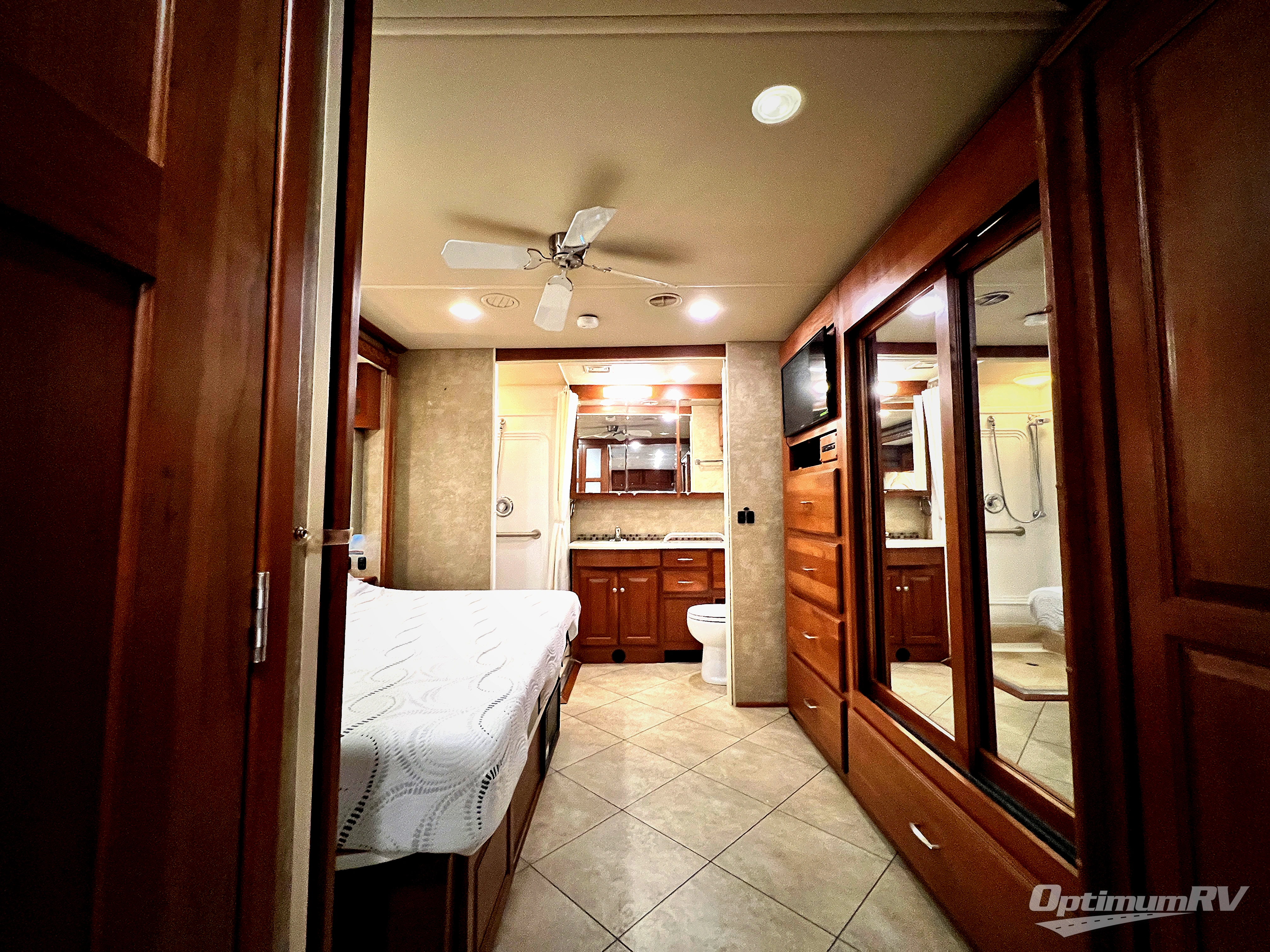 Double sliding doors to the rear take you to a spacious bedroom featuring a king bed slide out with nightstands on either side. You can also choose the queen bed with nightstands in place of the king if you like.