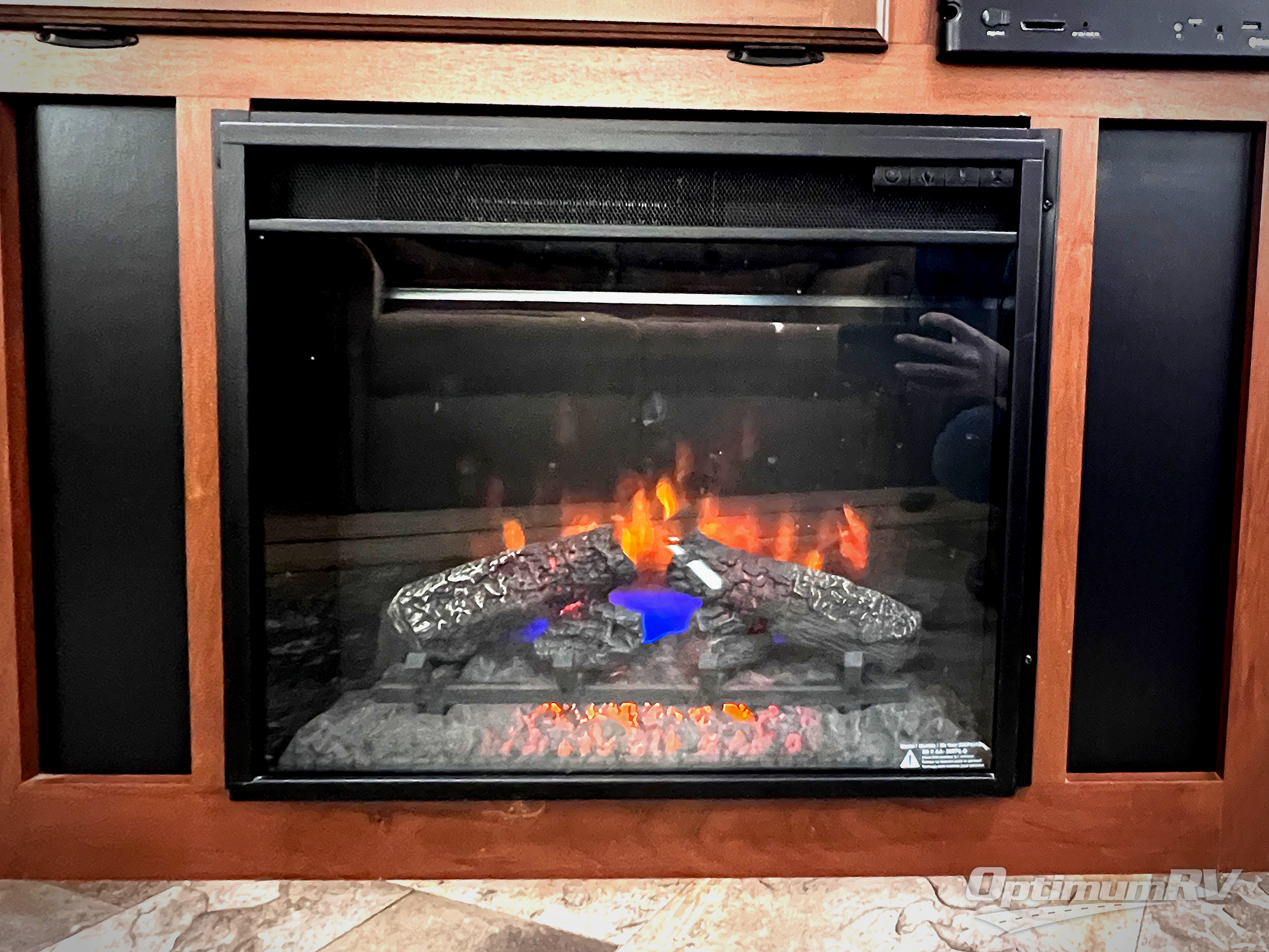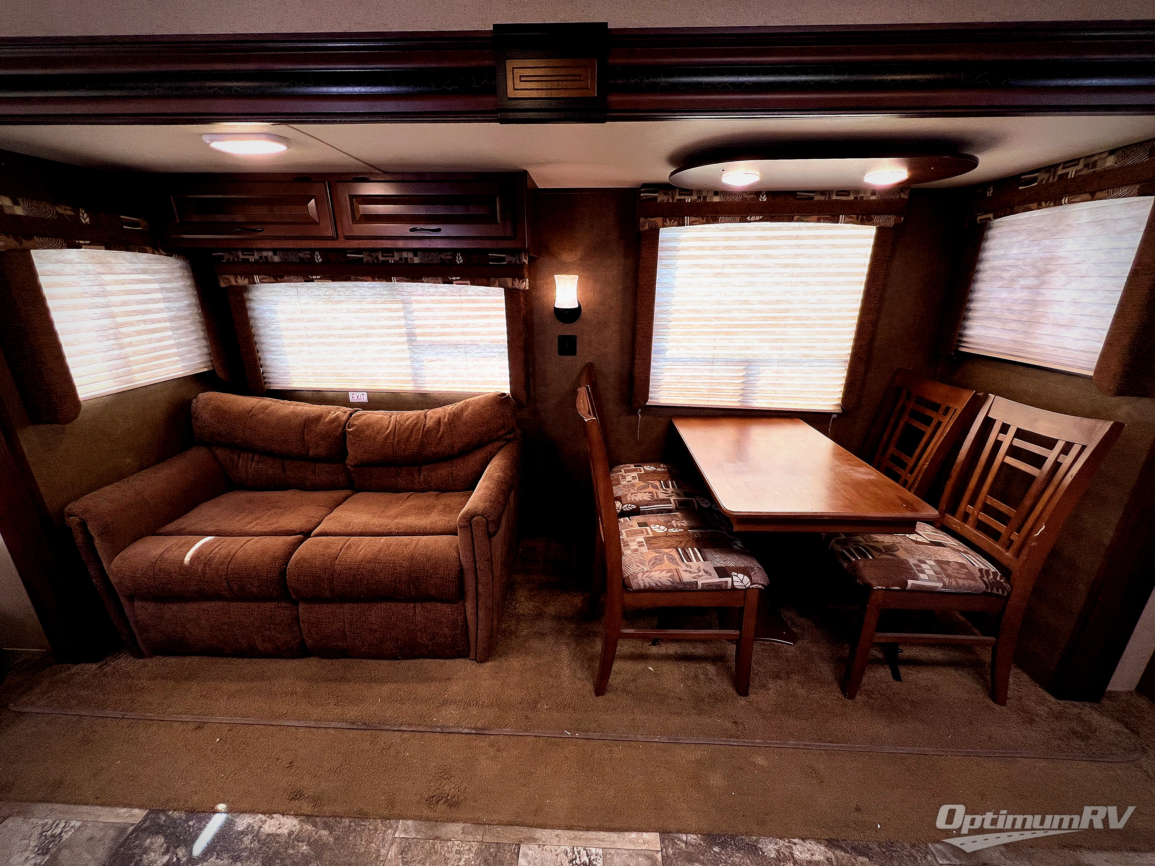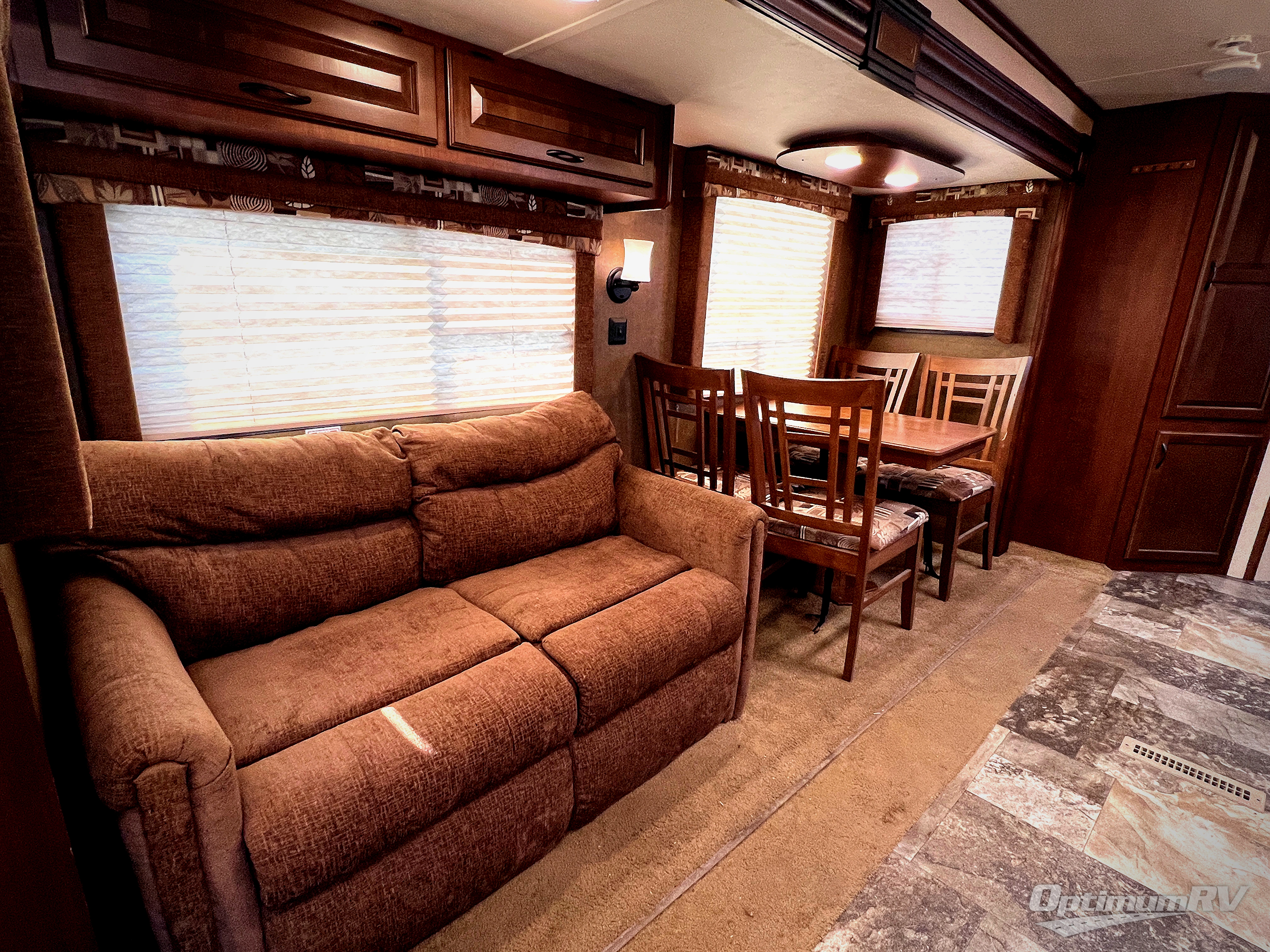 Along the rear wall there are two lounge chairs and an end table. The slide has a sofa and a dinette. Next to the slide there is a handy wardrobe. On the opposite side of the trailer you will find an entertainment center with optional fireplace, double kitchen sink, three burner range, microwave, refrigerator, and corner linen cabinet.