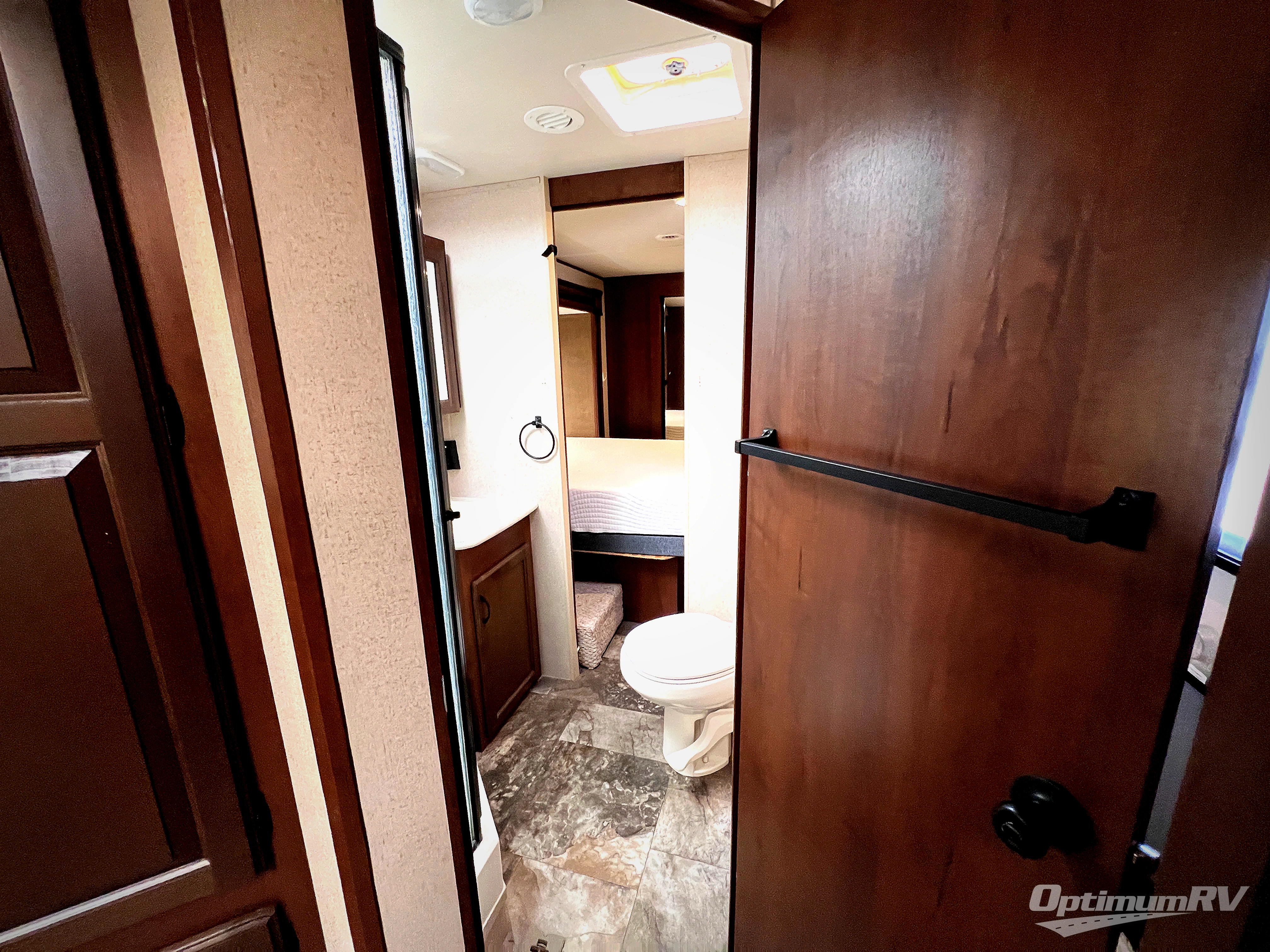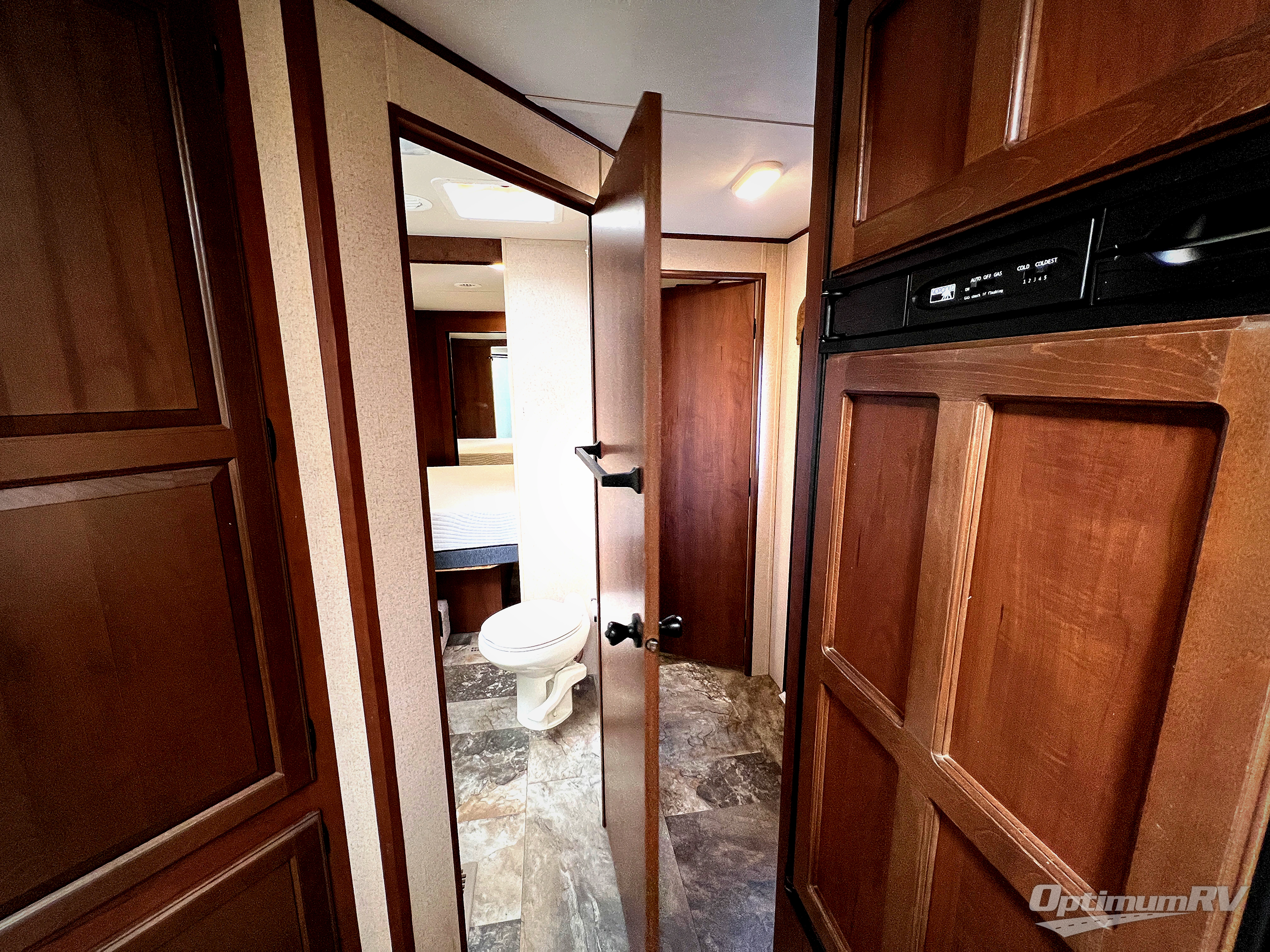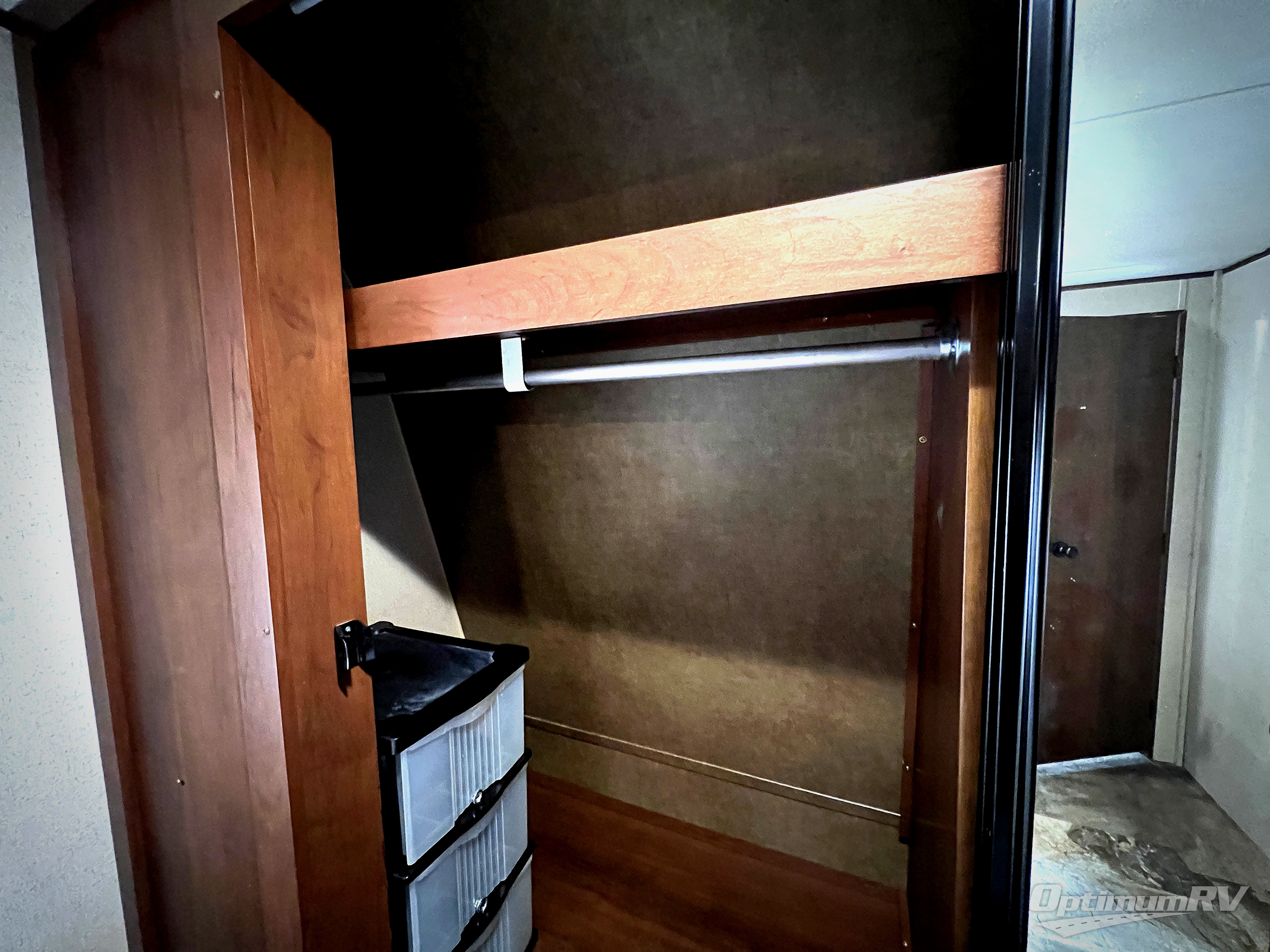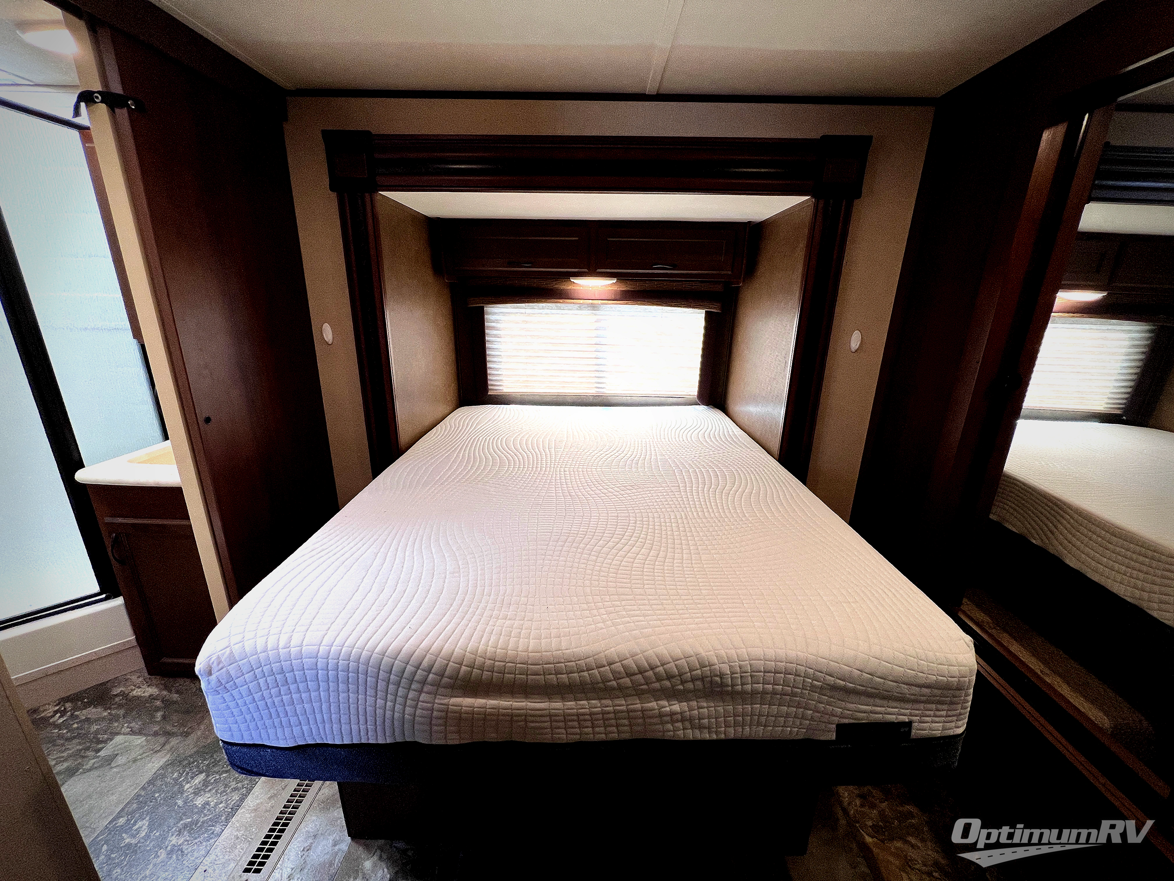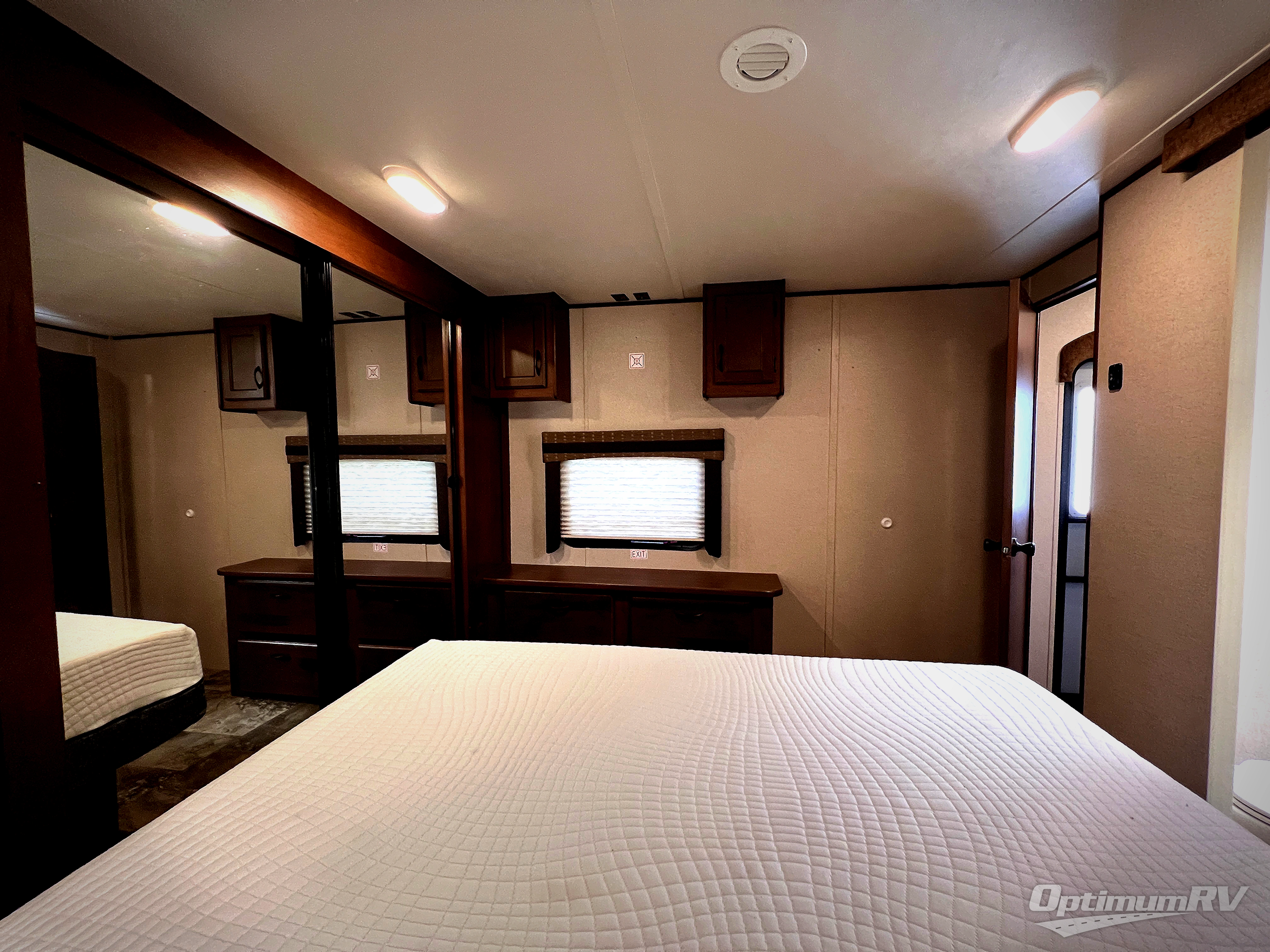 In the front bedroom there is a queen bed slide, dresser, and front wall wardrobe.