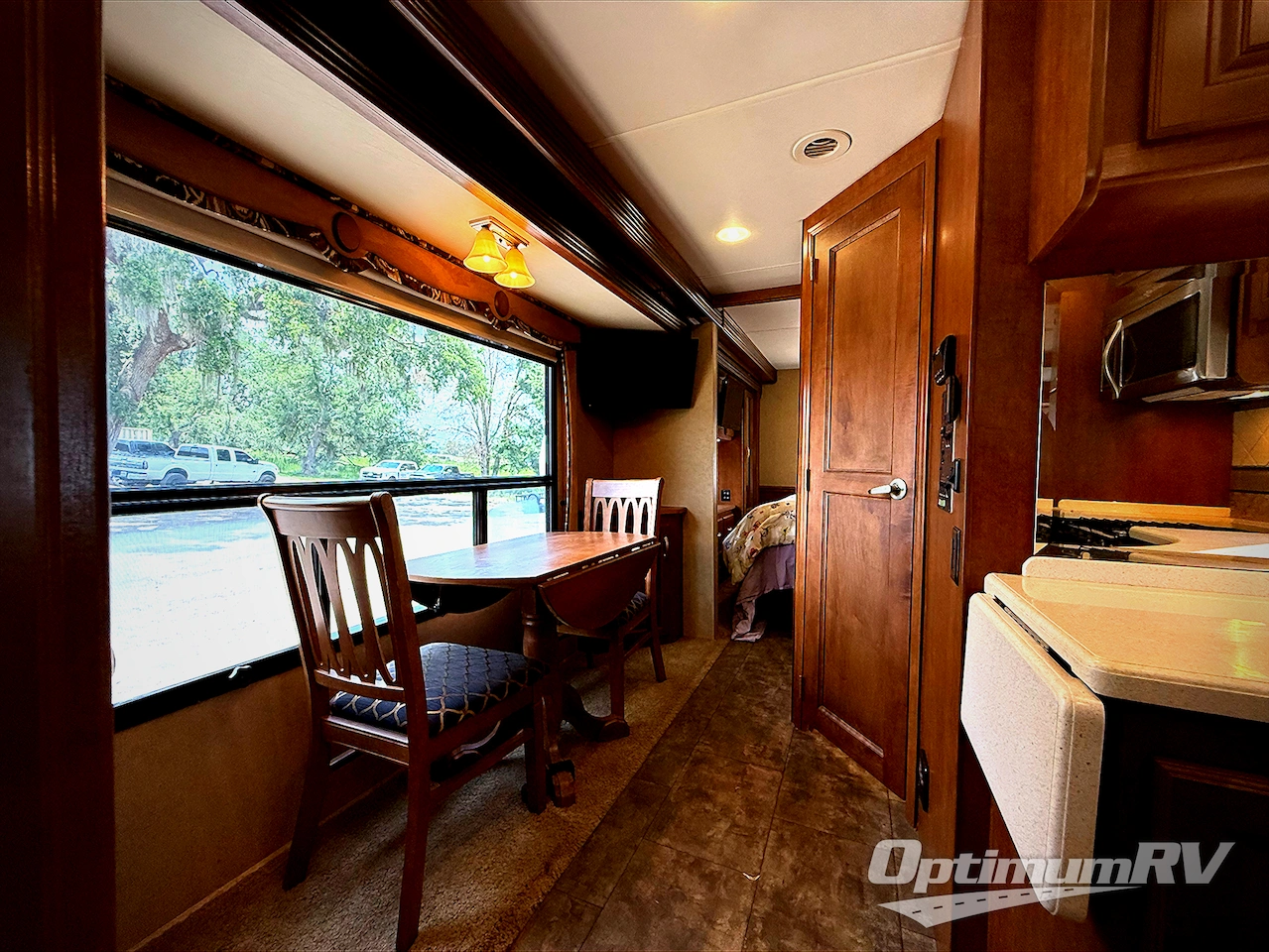 A slide out with a free standing round dinette table and corner 26" LED TV will seat four comfortably while eating, playing games, or watching shows. The rest of the slide continues into the bedroom. This slide features closets on both sides of the dresser with a 28" TV above.
