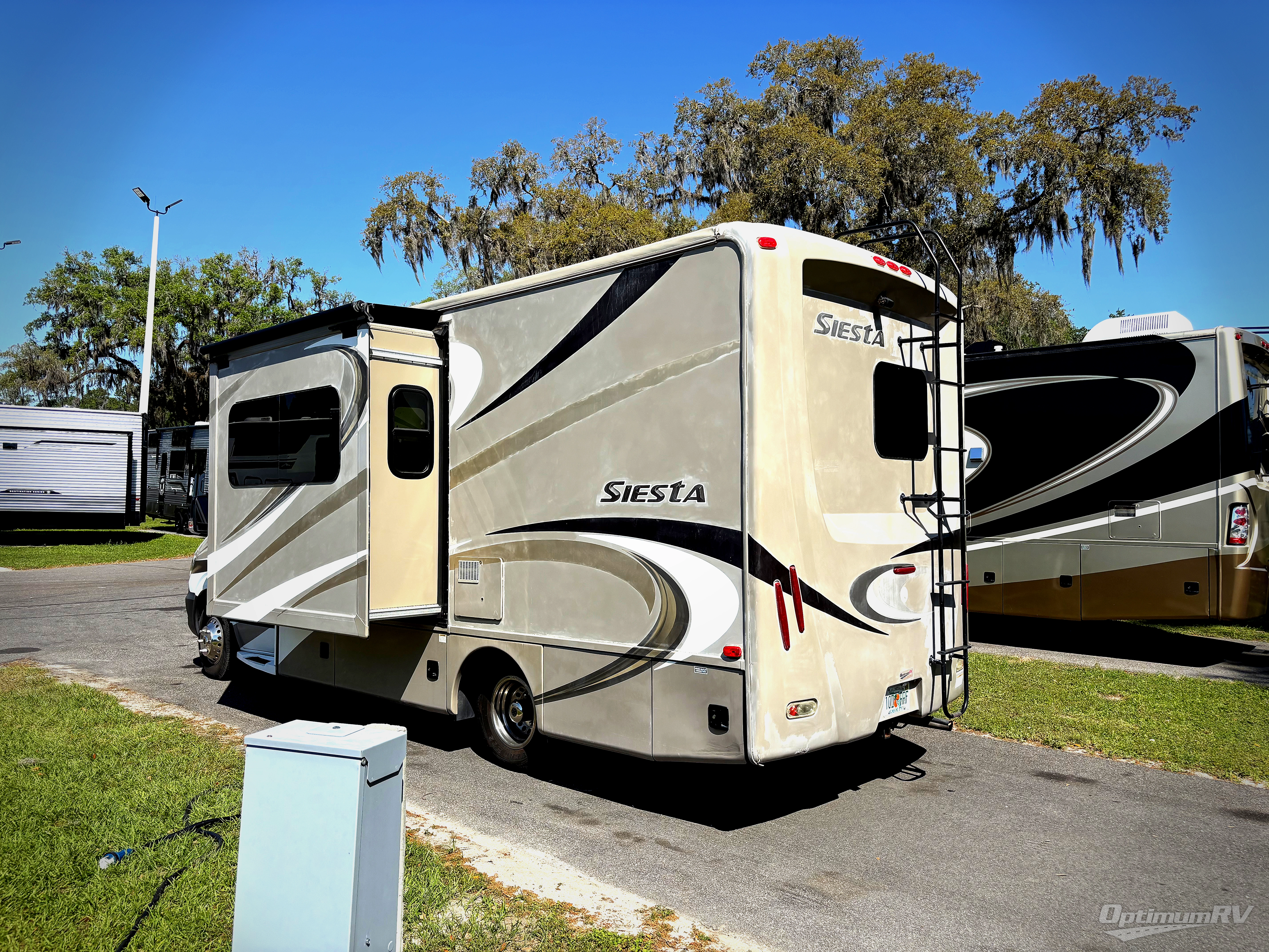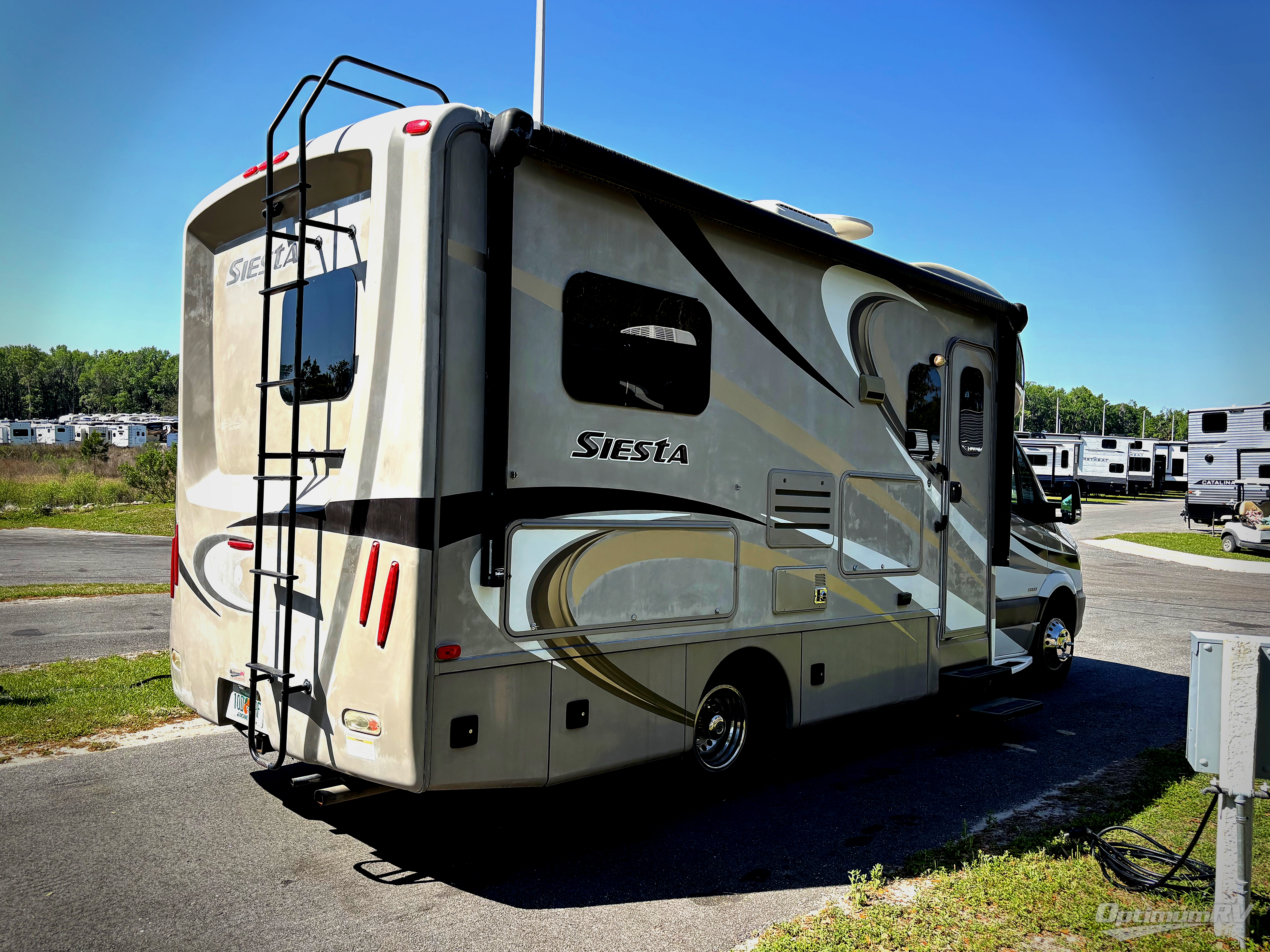 In the rear of the Siesta Sprinter 24SA you will find a corner bathroom including a shower, vanity sink, medicine cabinet and a toilet. The opposite rear corner holds a full size bed with overhead cabinets. There is a closet just outside the bath.