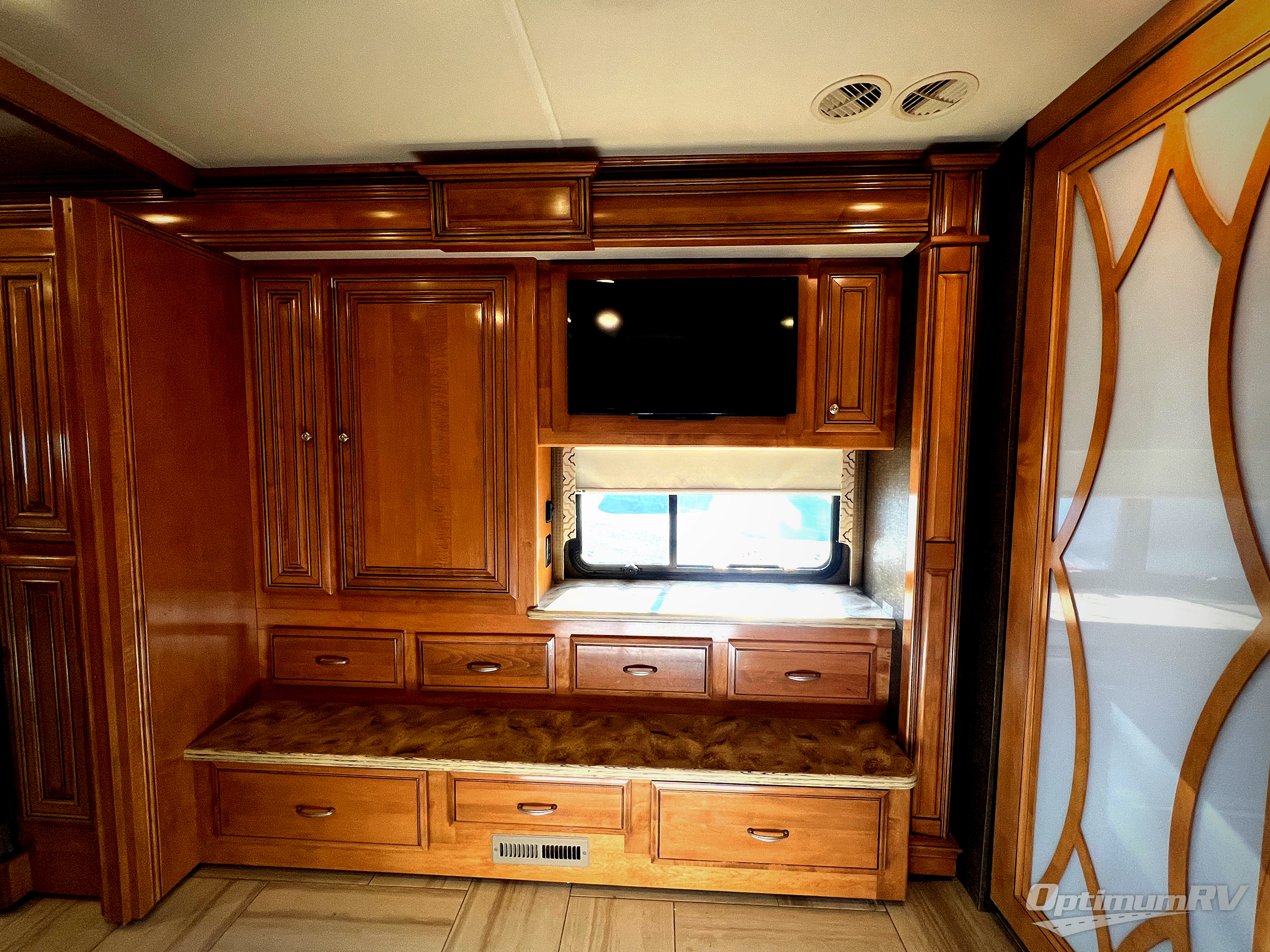 The master bedroom features a king bed slide out along with nightstand and also includes part of the rear bath layout. Opposite the bed you will find ample storage with a dresser and closet in the large curb side slide. This also features a 32" LED TV for viewing from bed.