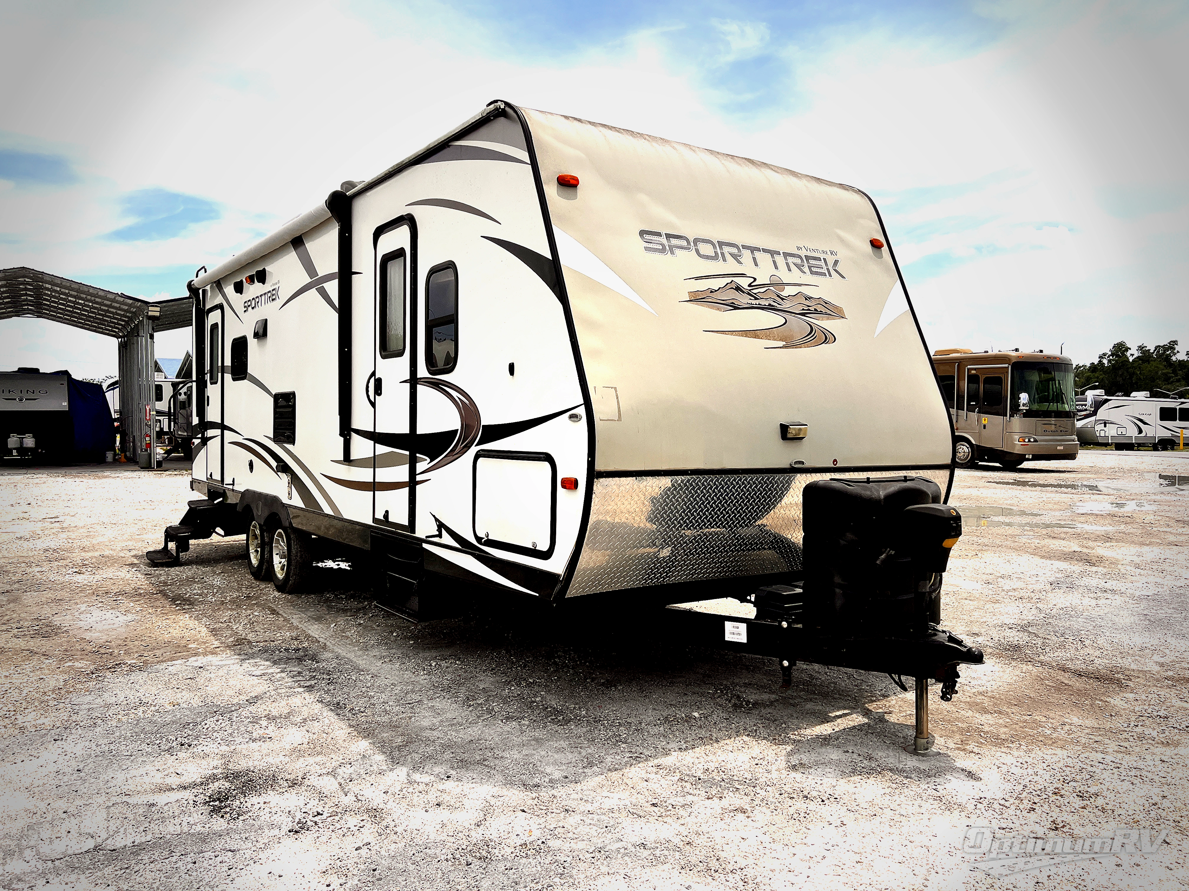 The SportTrek 270VRL travel trailer by Venture RV has a single slide and rear living area.