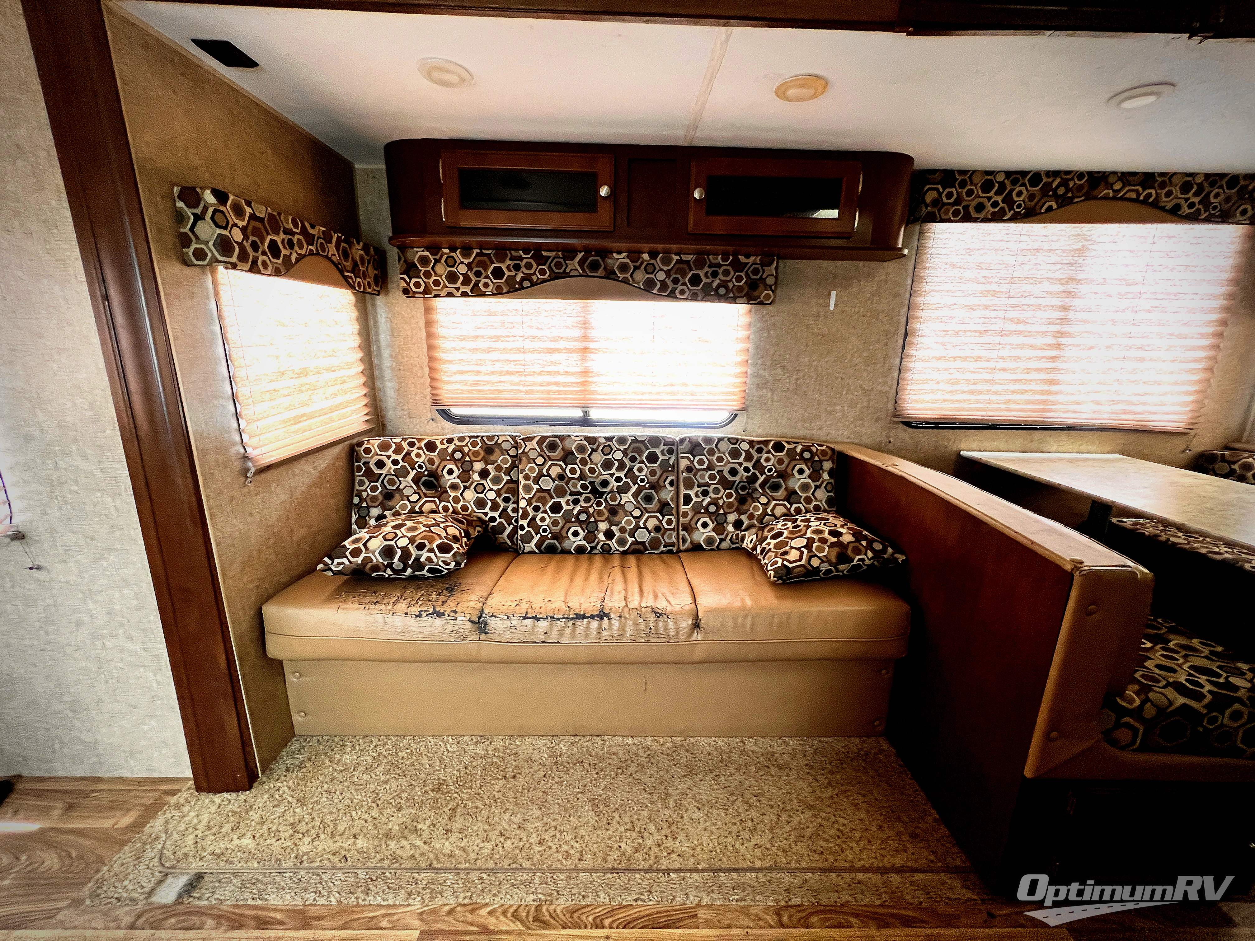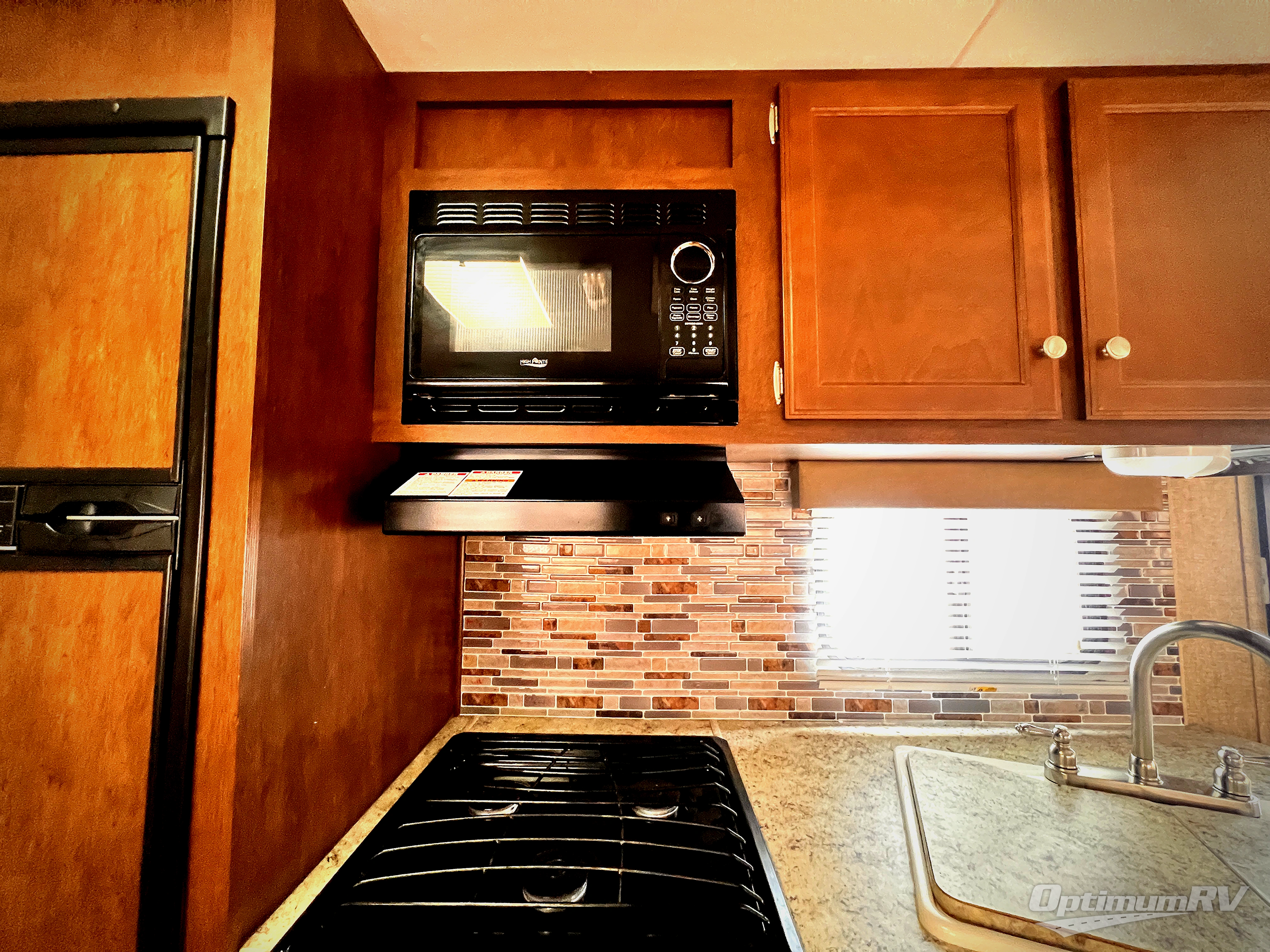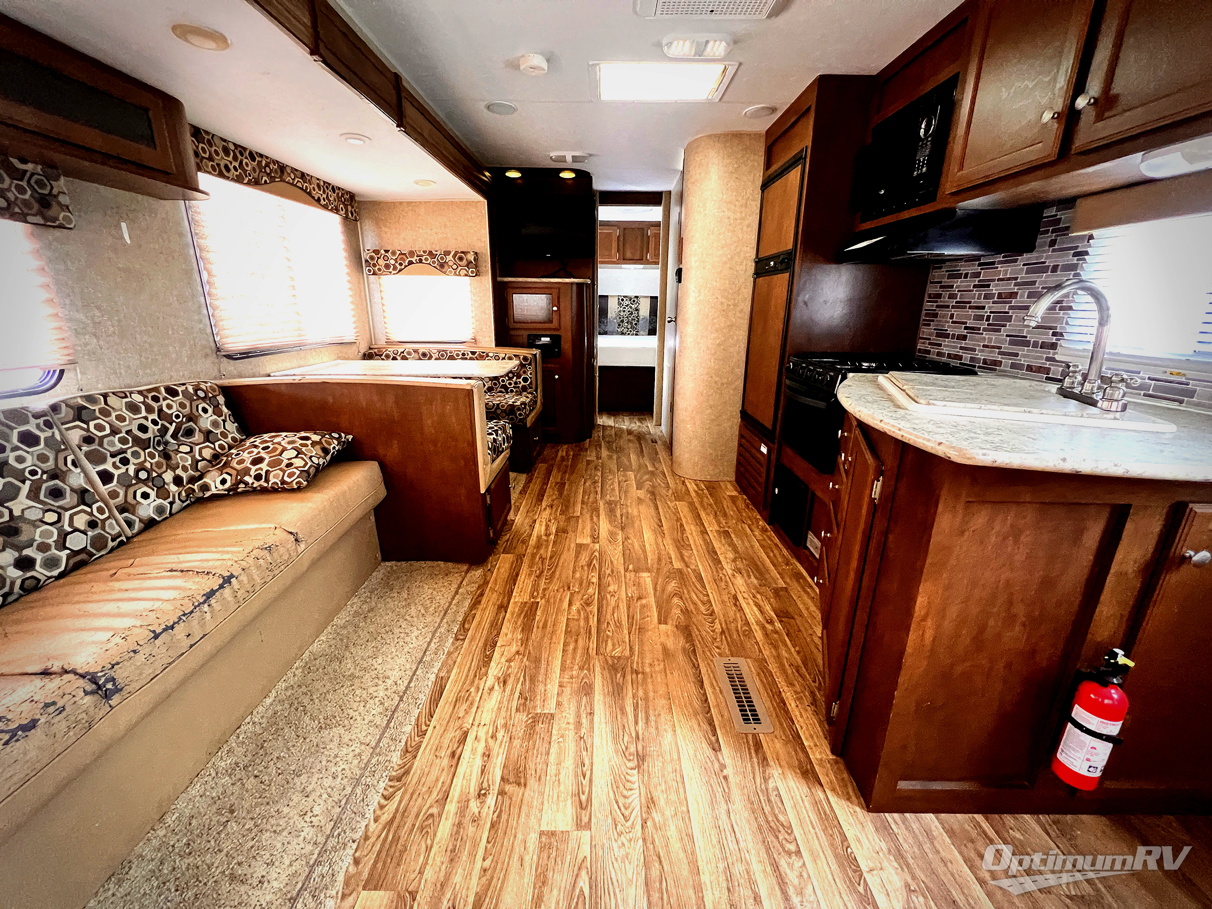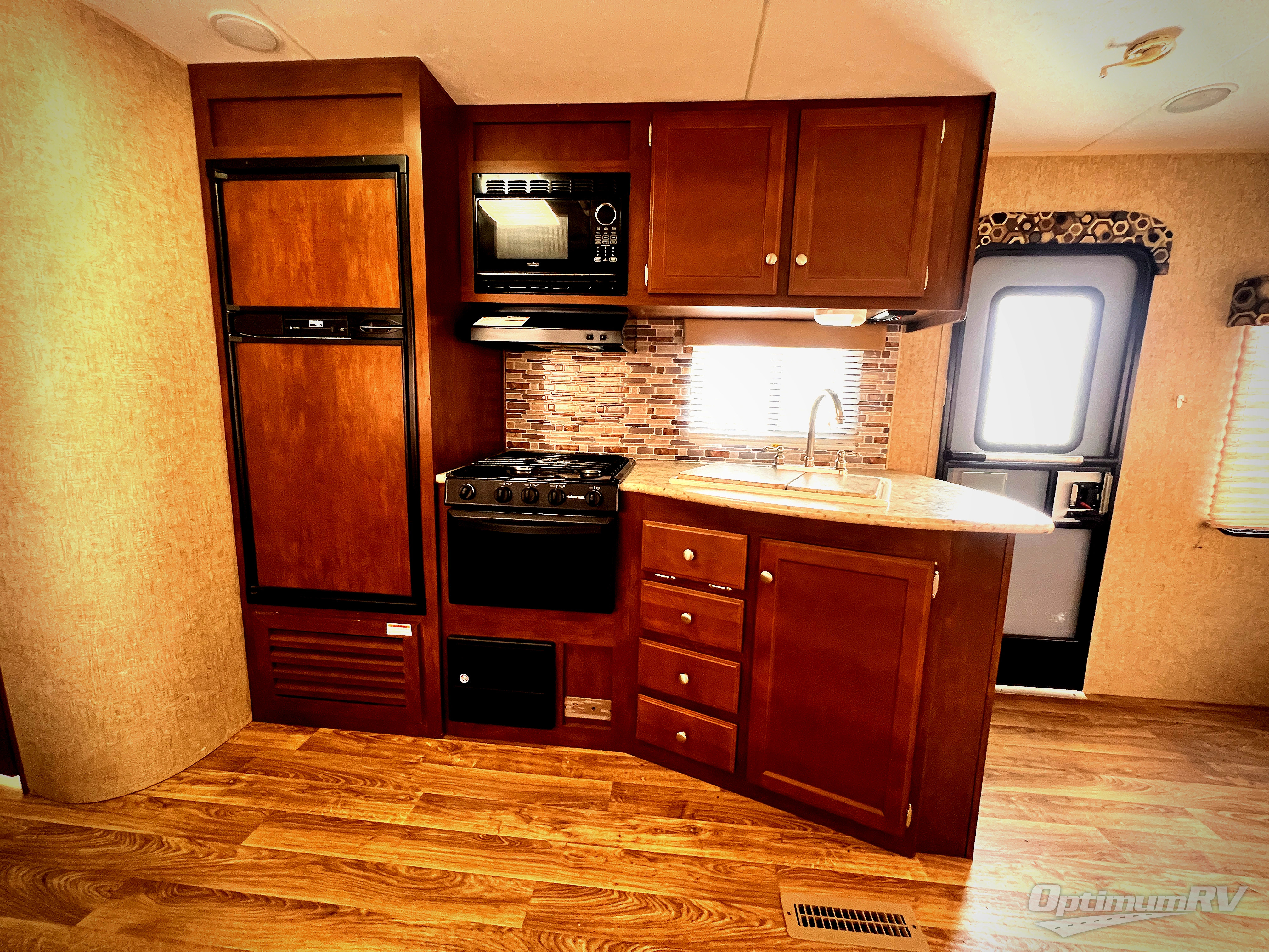 As you enter the travel trailer, along the rear wall you will find two swivel rockers and an end table. There is also an overhead cabinet above the swivel rockers, that runs the width of the trailer. The slide has a sofa and grand dinette. Next to the slide there is an entertainment center and pantry. On the opposite side of the travel trailer you will find a double kitchen sink, three burner range, and refrigerator.