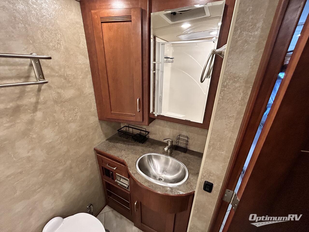 Across from the double sink up front you will find an inTable with utility cabinet and overhead storage. Next, a side bath featuring a shower, toilet, and vanity with sink, plus overhead storage too.