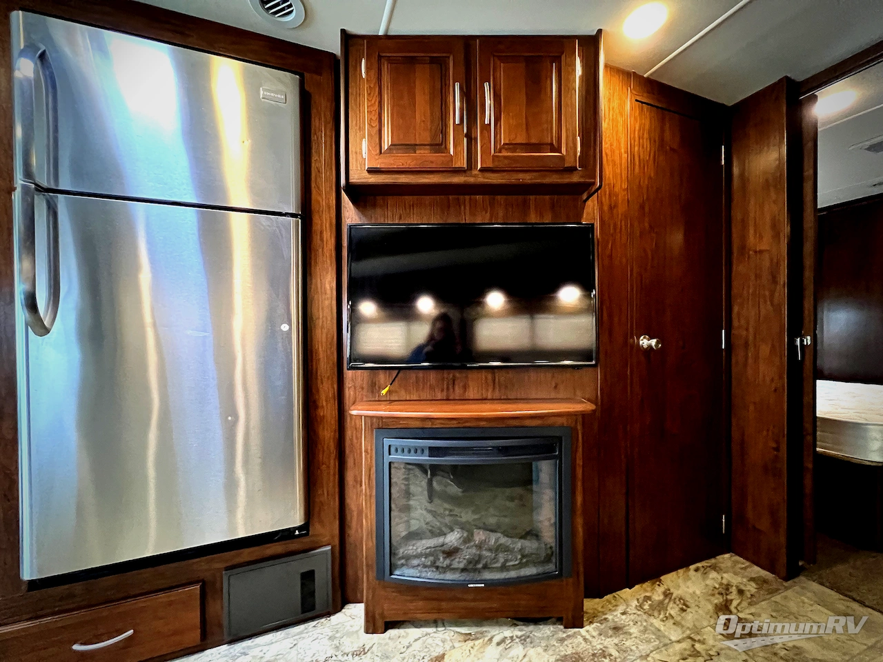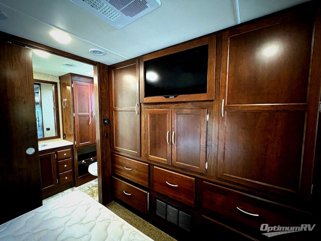 A pocket door separates the living area from the bedroom which offers a slide out queen bed with nightstands. There are wardrobes and drawer storage opposite the bed along with a 32" LCD TV with DVD player. Additional storage can be found above the bed as well.