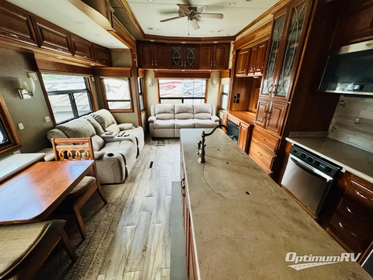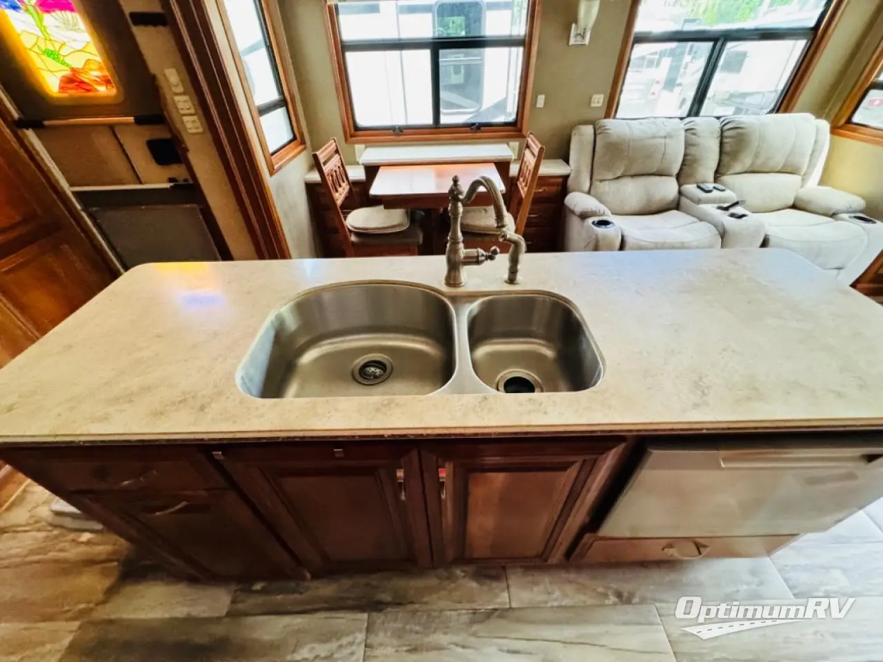The kitchen and living area feature dual opposing slides with a dinette slide to the left of the entry door where you will also find two theatre seats as well. There is also plenty of overhead storage throughout.