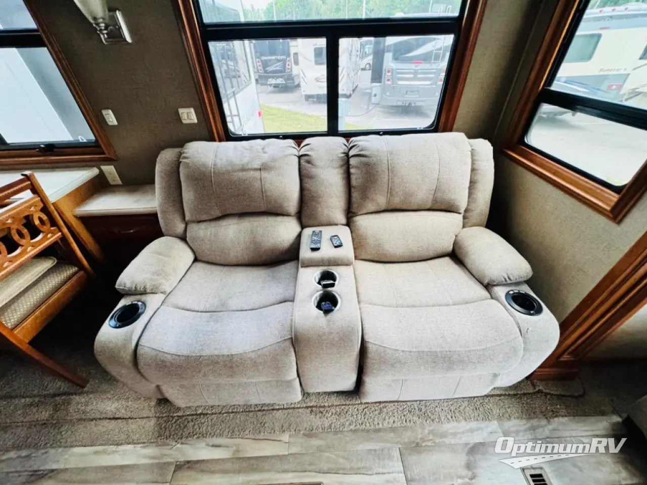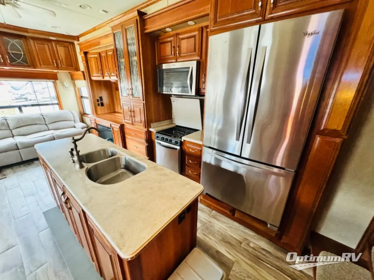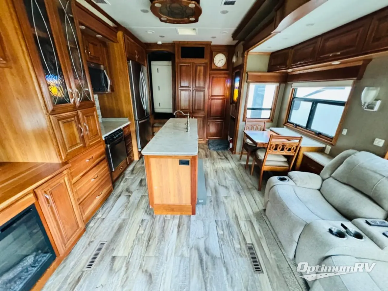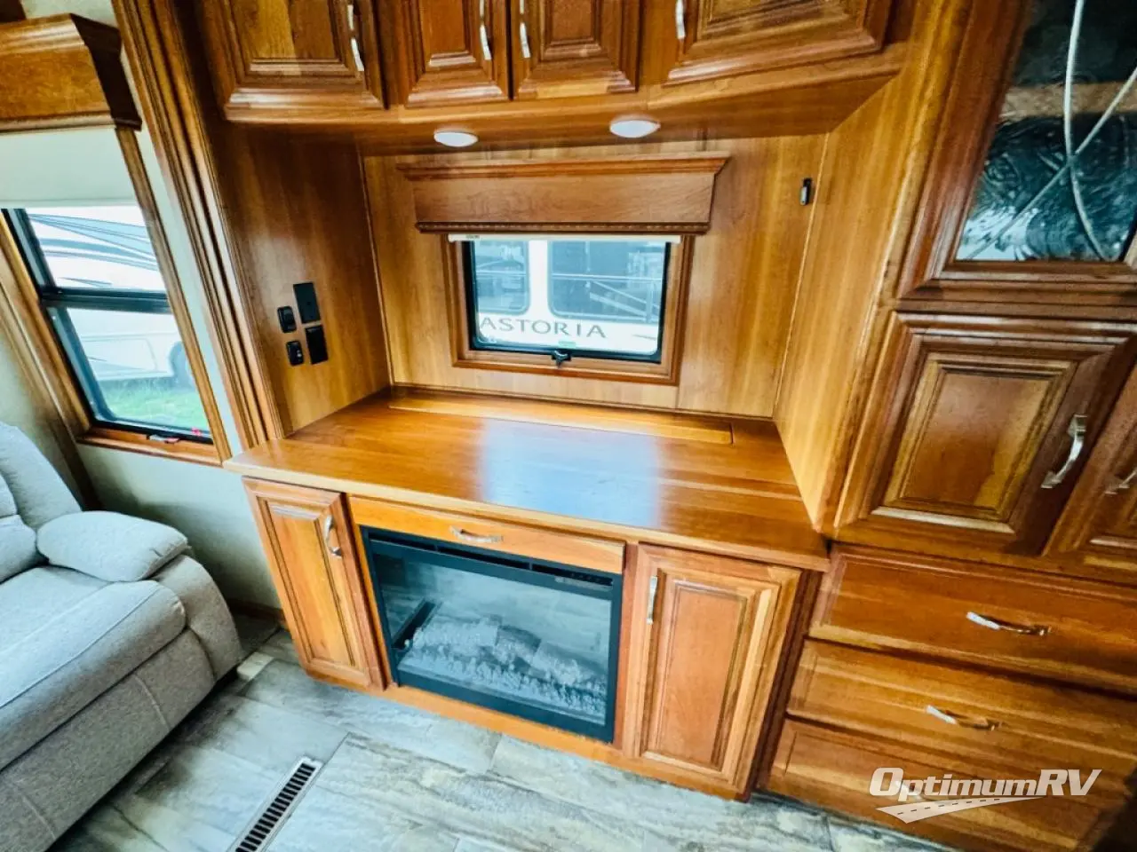 Along the rear wall find a sofa with two end tables. The sofa provides ample seating and perfect viewing of the power lift TV in the slide out opposite the door side. You can choose to add an optional fireplace if you like and there is also overhead storage too. Within that same slide out find a storage cabinet for your things, plus a range with convection oven, counter space, and a refrigerator. More storage is located just inside the main entry door where you will find a coat closet and pantry.