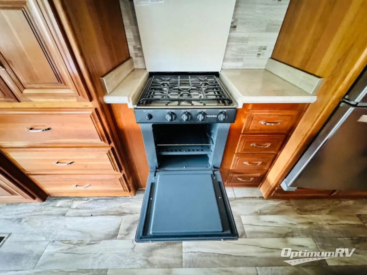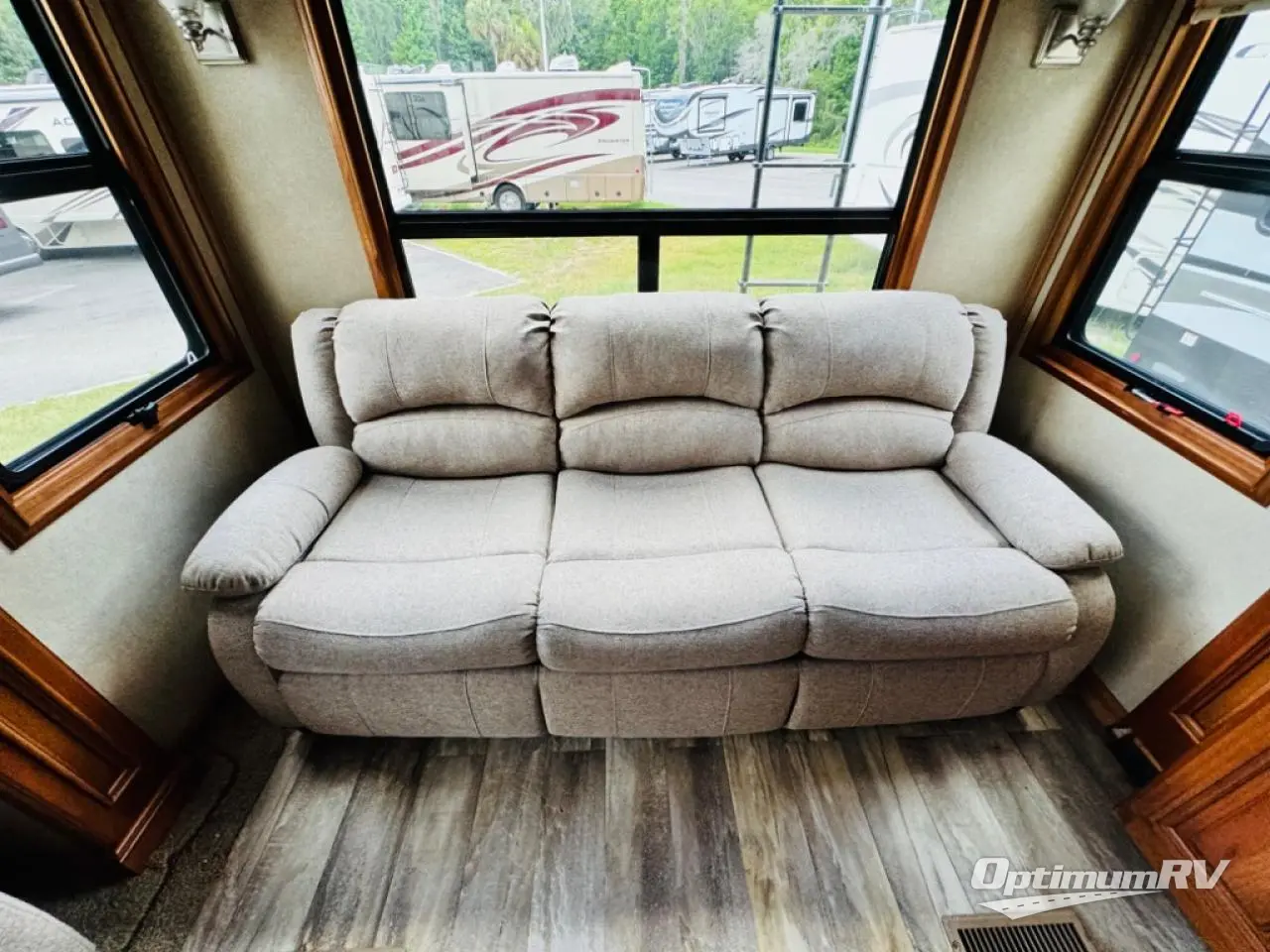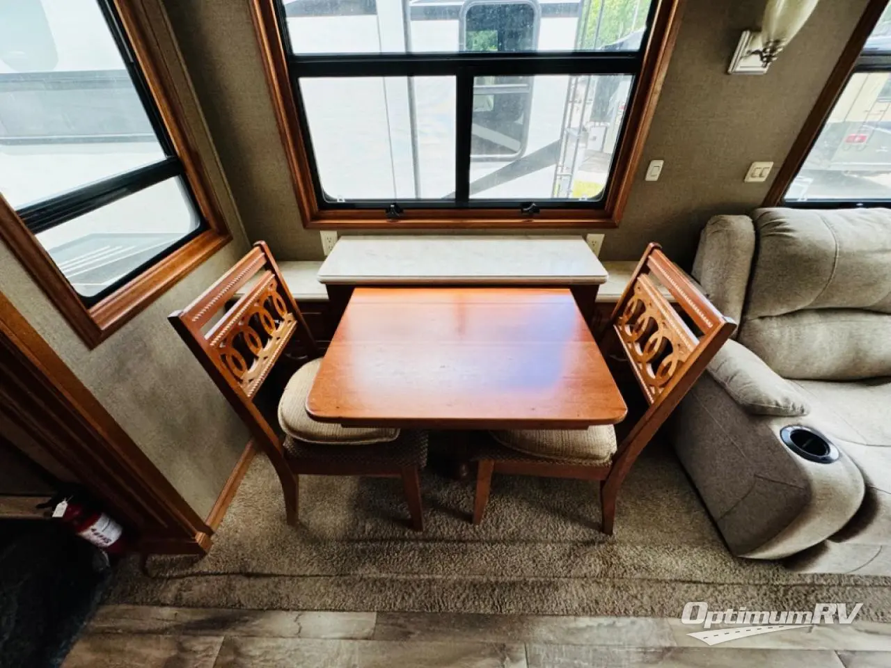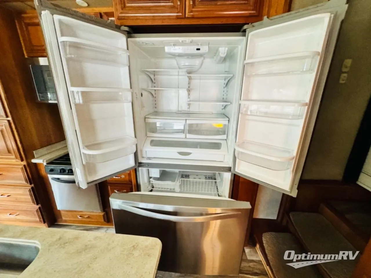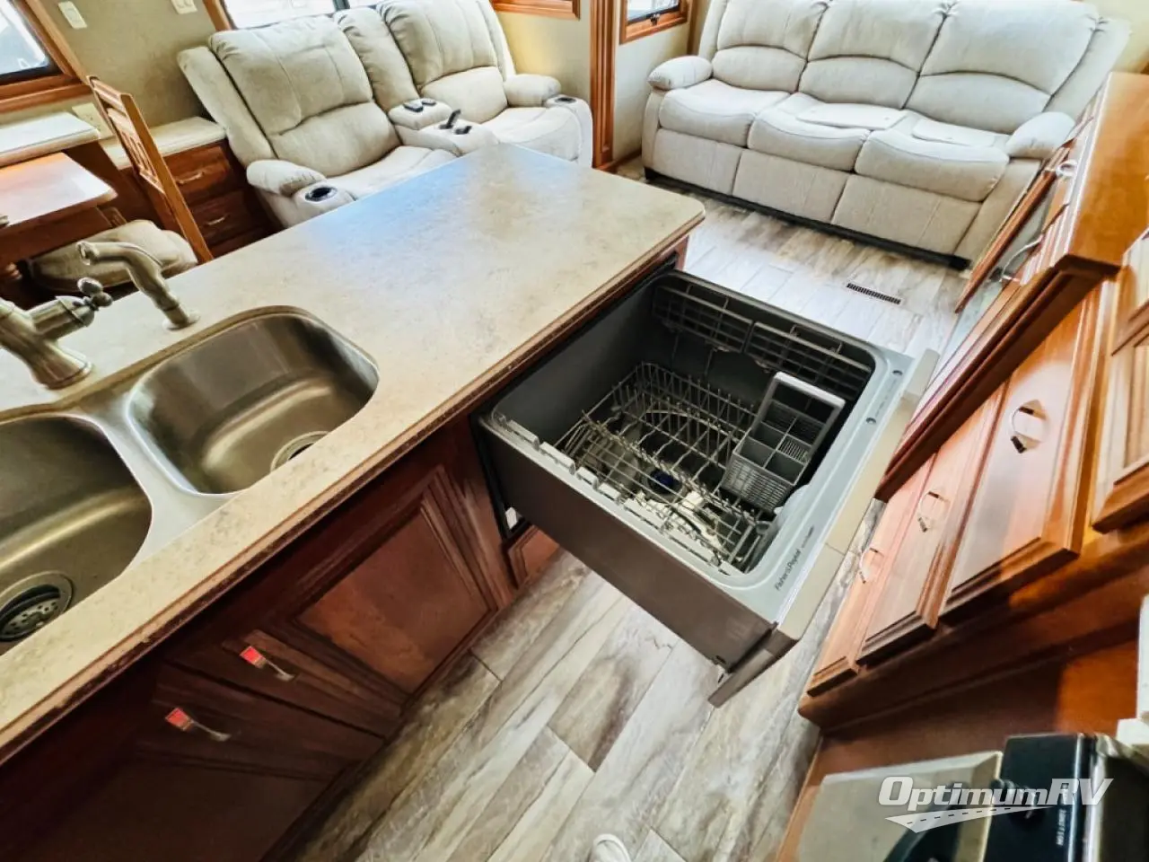 Along the rear wall find a sofa with two end tables. The sofa provides ample seating and perfect viewing of the power lift TV in the slide out opposite the door side. You can choose to add an optional fireplace if you like and there is also overhead storage too. Within that same slide out find a storage cabinet for your things, plus a range with convection oven, counter space, and a refrigerator. More storage is located just inside the main entry door where you will find a coat closet and pantry.