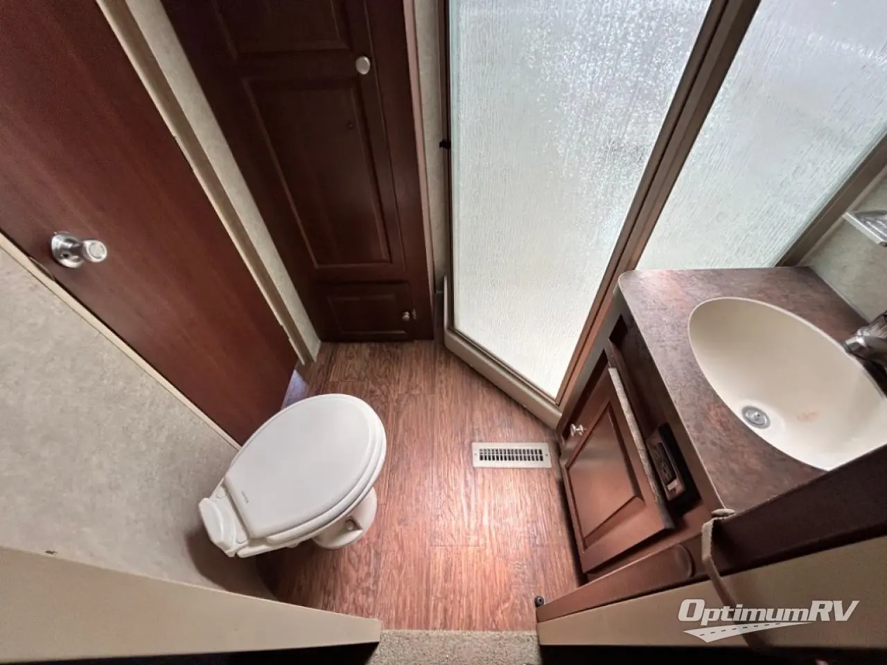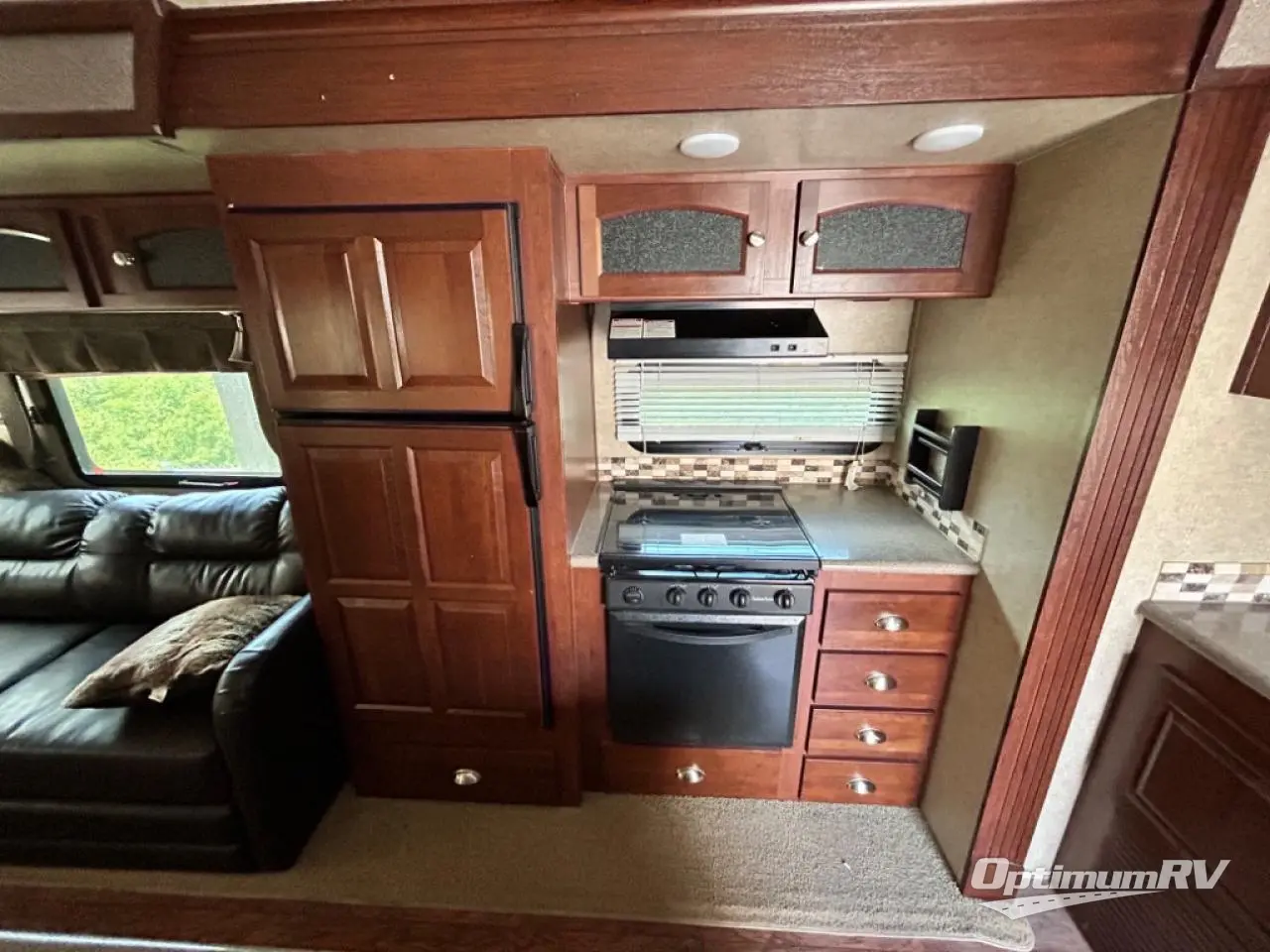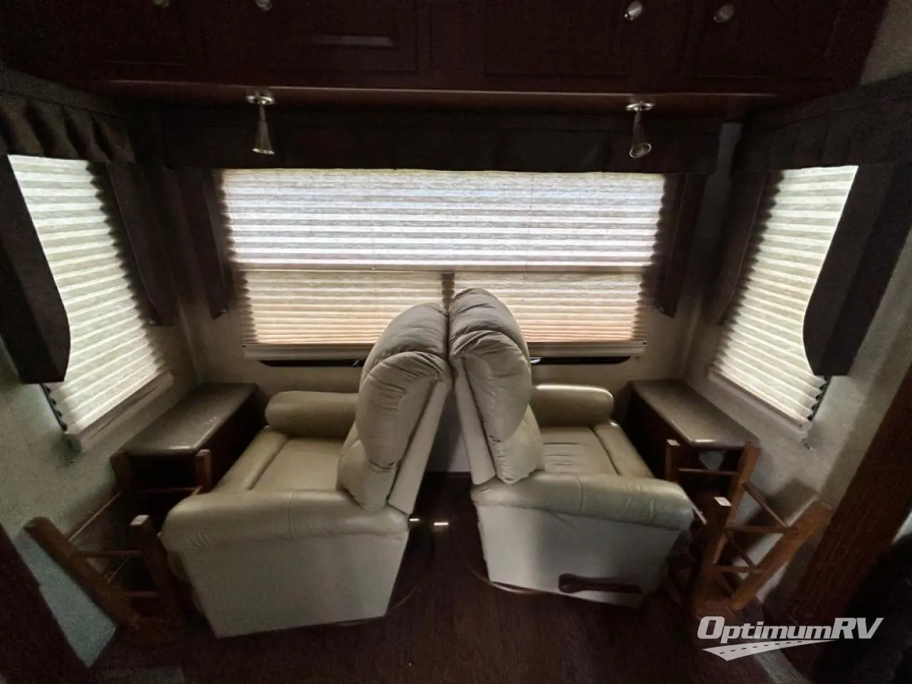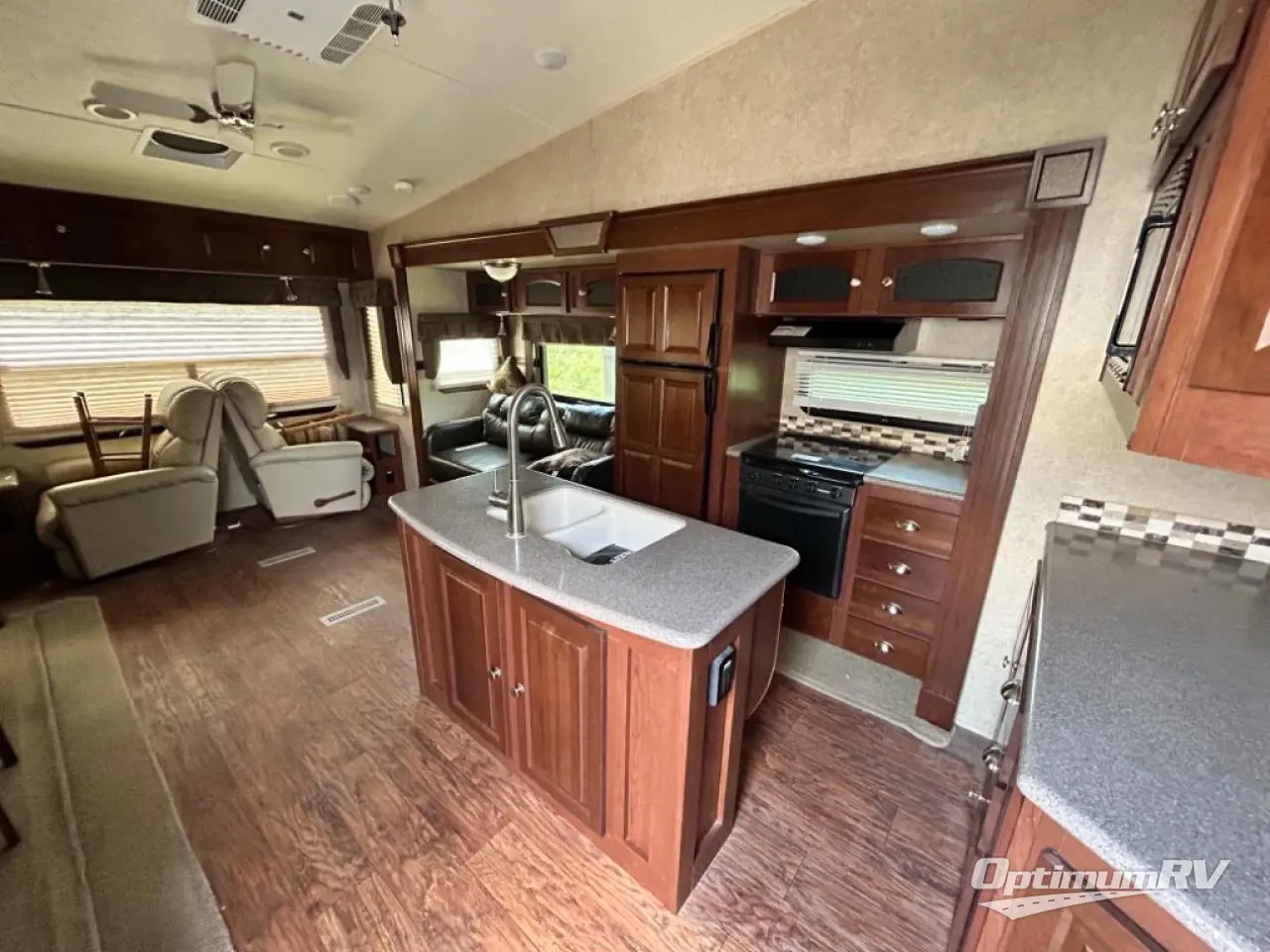 As you enter the fifth wheel, to the left there is a slide with a corner entertainment center, an optional fireplace below and a free-standing dinette. Along the rear wall you will find two recliners or optional Lazy Boy chairs and two end tables. The other slide has a hide-a-bed sofa, overhead cabinet, refrigerator, and three burner range. You will also find a large pantry and microwave. The kitchen island provides extra counter space, bar stools, as well as a large sink which makes clean up a breeze.
