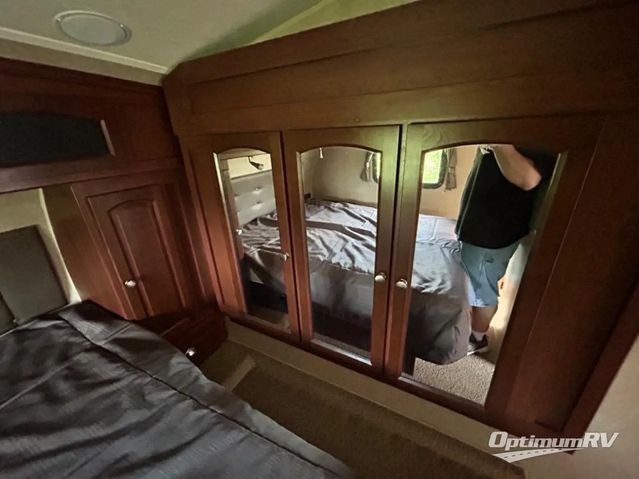 The front bedroom has a queen bed, nightstand, shirt closet, and wardrobe slide. In the corner, there is even an optional TV.