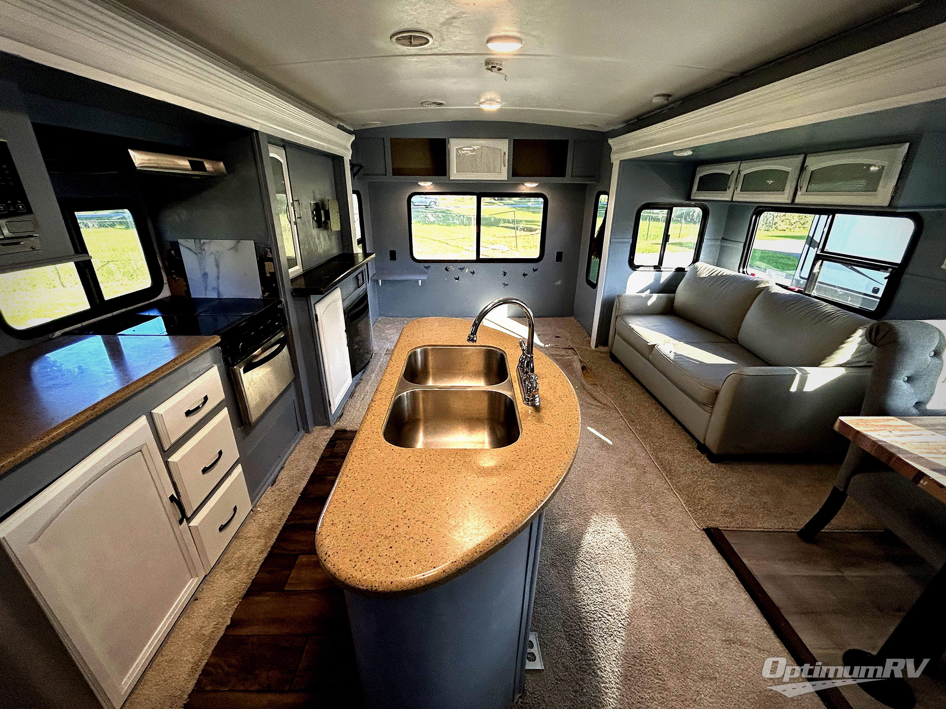There are plenty of overhead cabinets throughout the travel trailer, as well as a large pass thru storage.