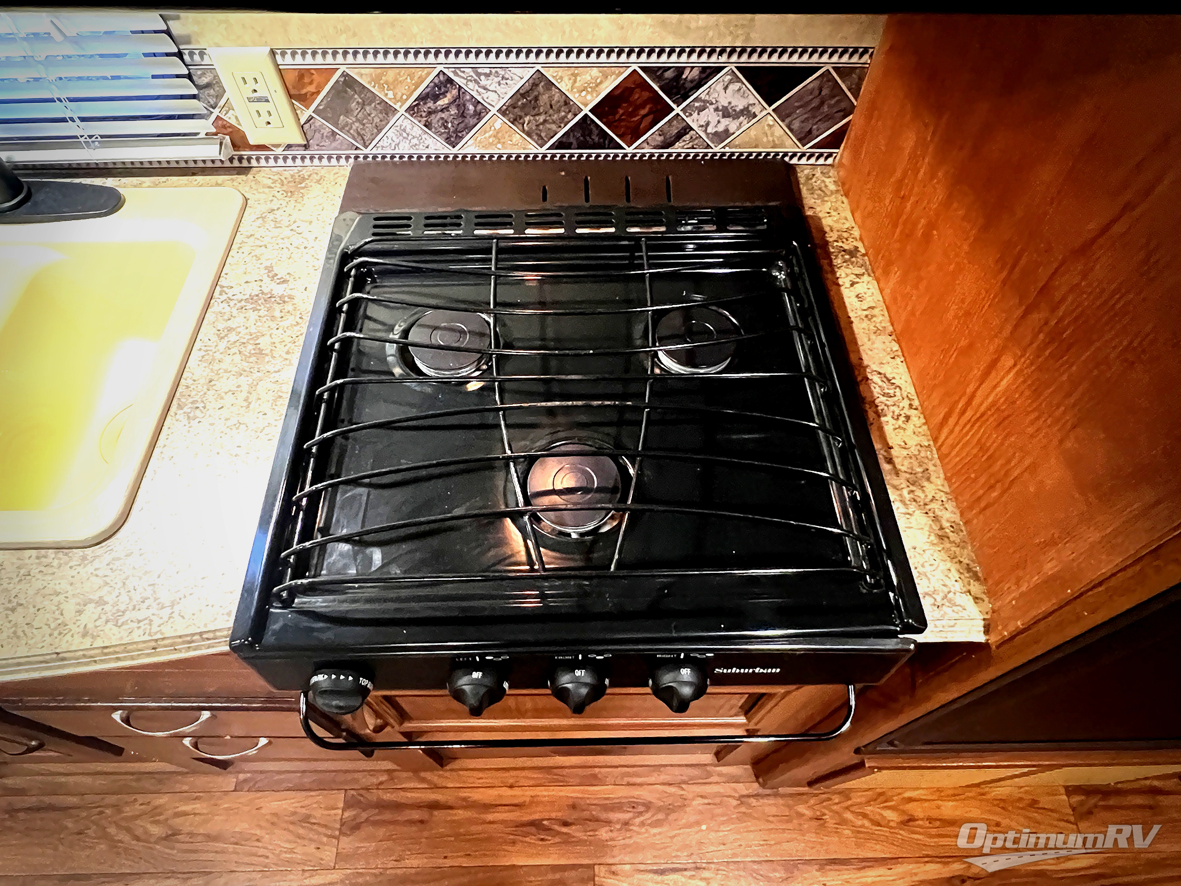 To the left of the entrance you can easily cook up light meals and snacks for the whole gang when camping. There is a double sink with fold up counter-top, a three burner range with overhead microwave oven, a refrigerator, and pantry for dry and canned food storage needs. You will also find plenty of overhead storage for dishes and things.