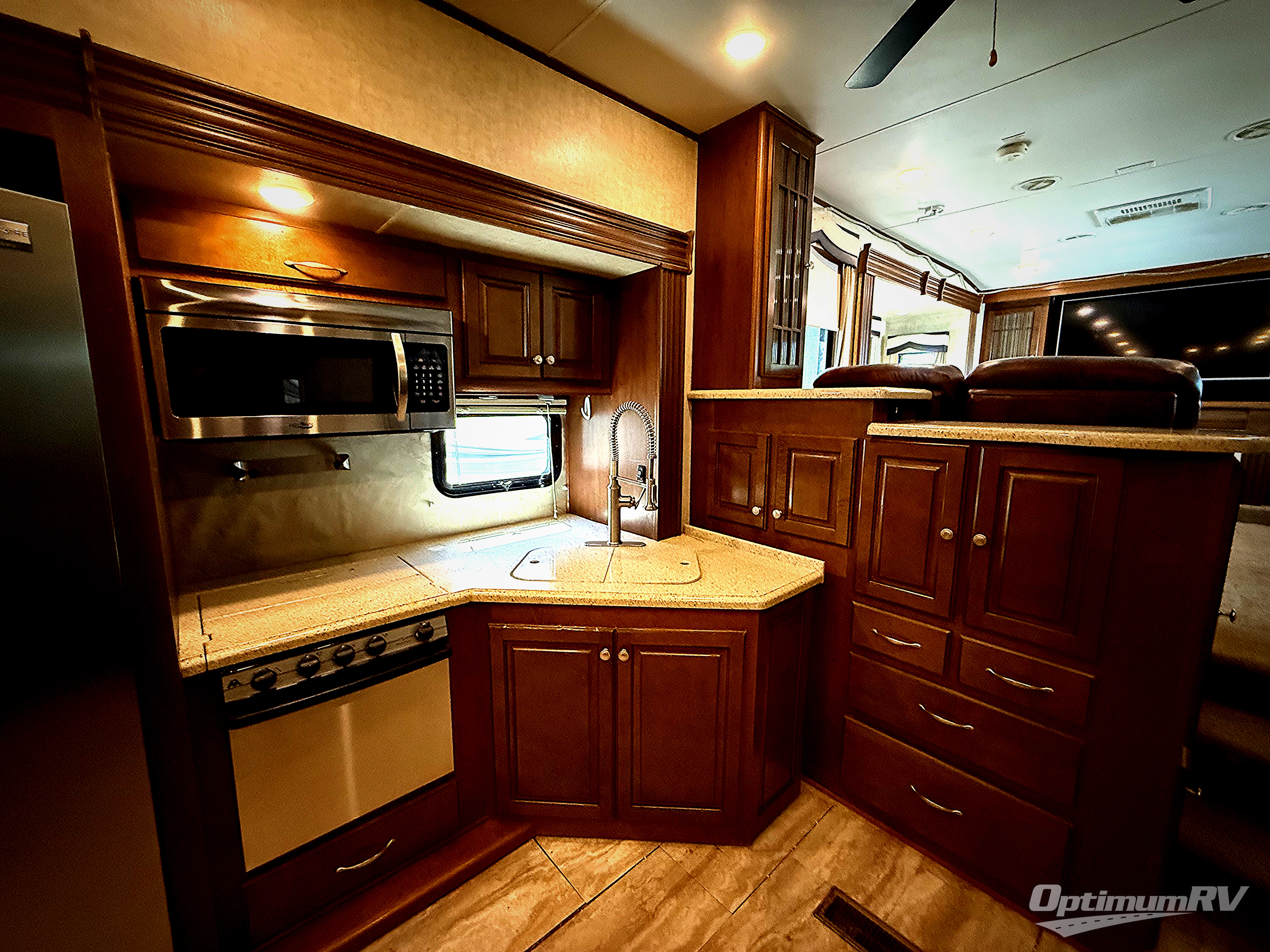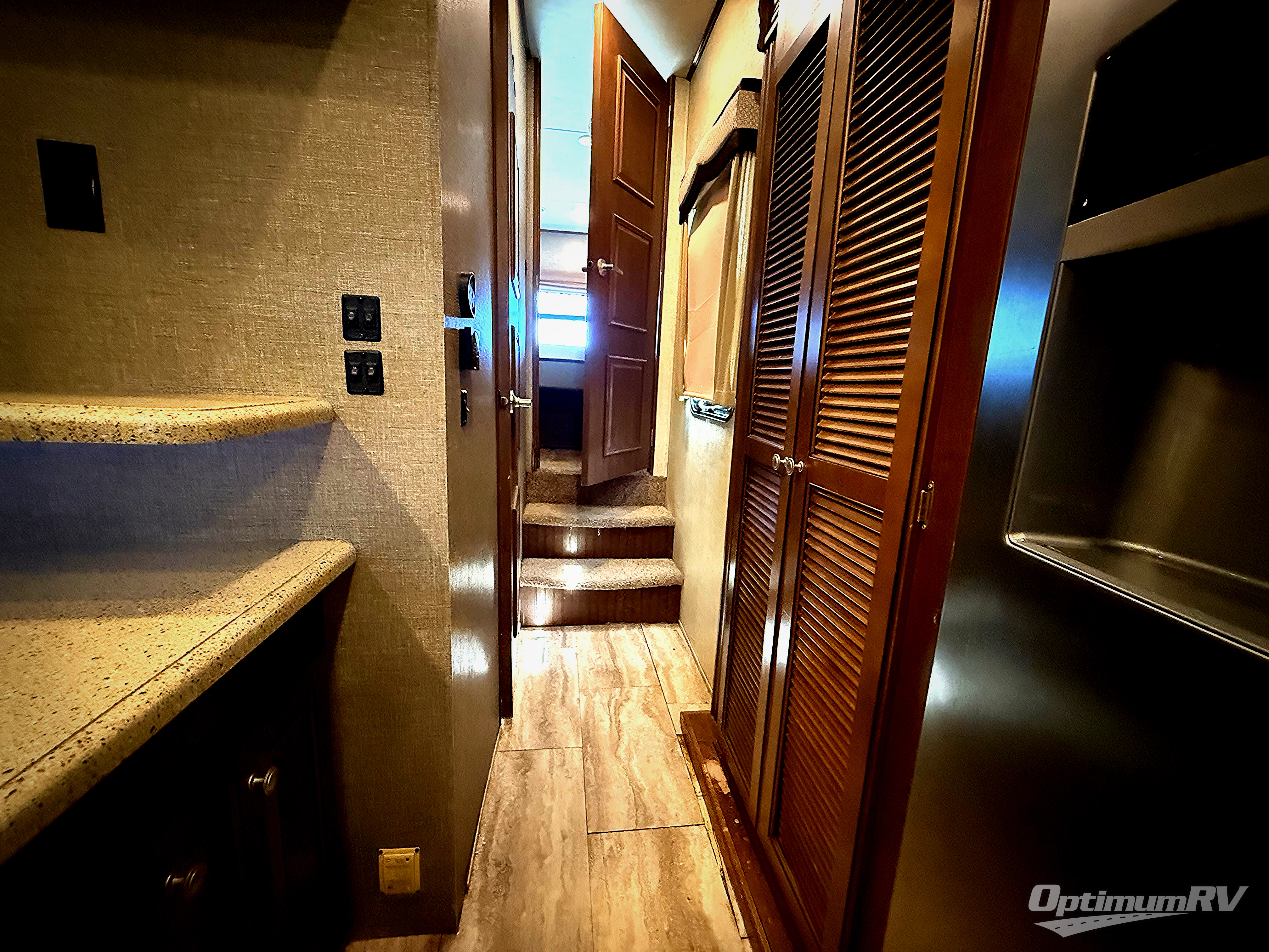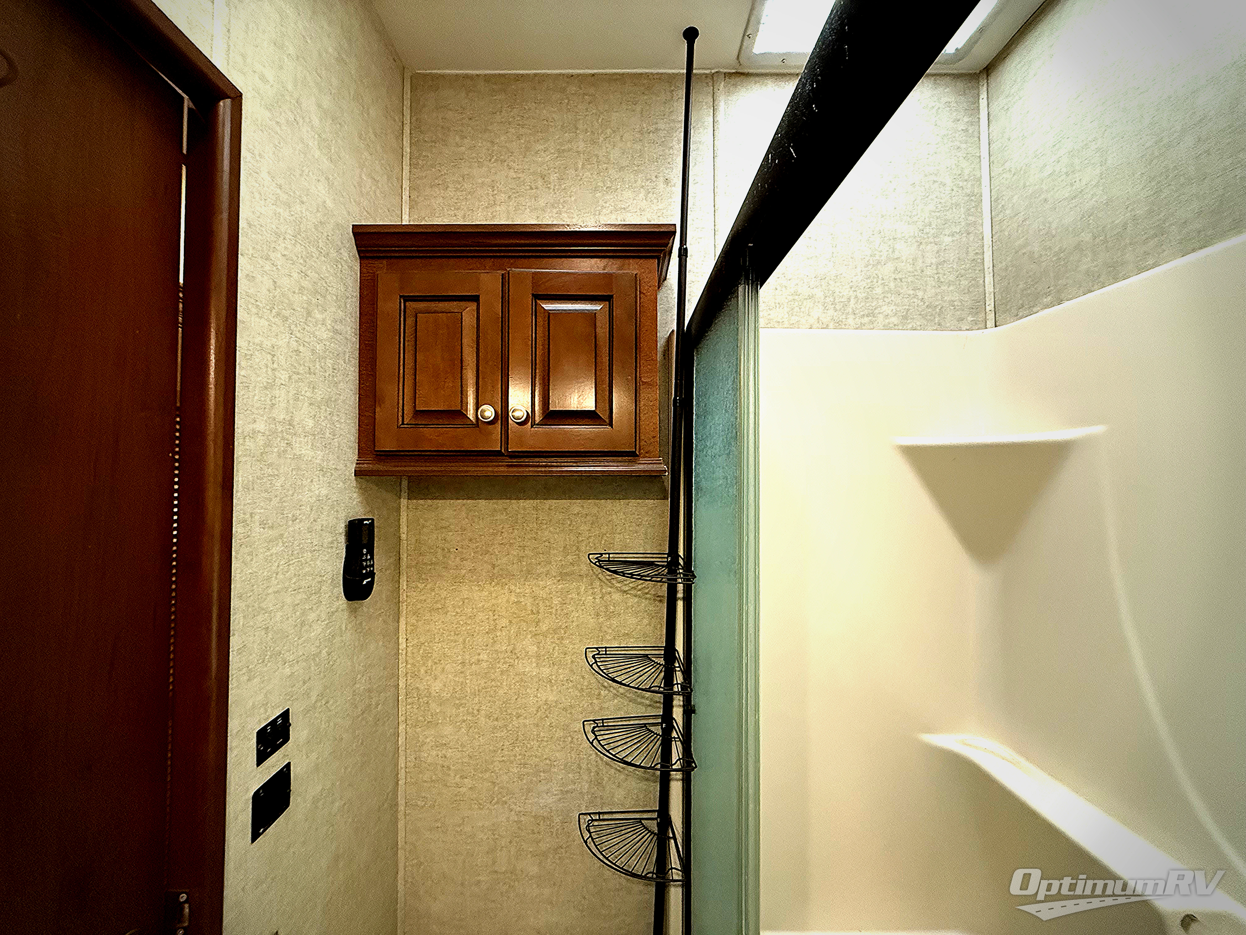 Step inside and head up to the raised living room which features dual opposing slides both with a sofa to enjoy. These can easily become additional sleeping space if needed at night. There is also theater seating for two at the top of the steps to your left. A great space to entertain or enjoy conversations with family and friends. The entire front wall shows off a large flat screen TV and entertainment center with storage both above and below.