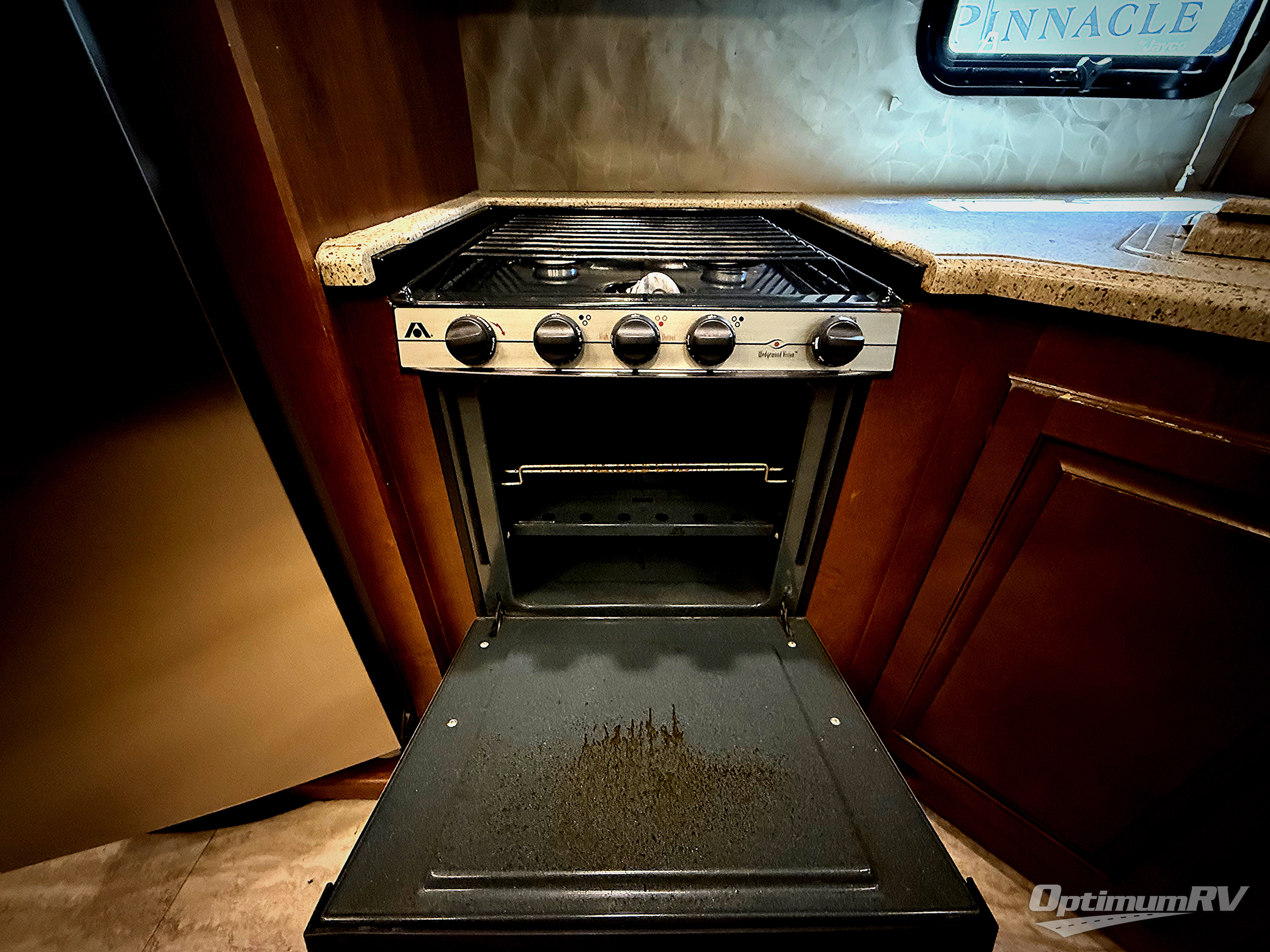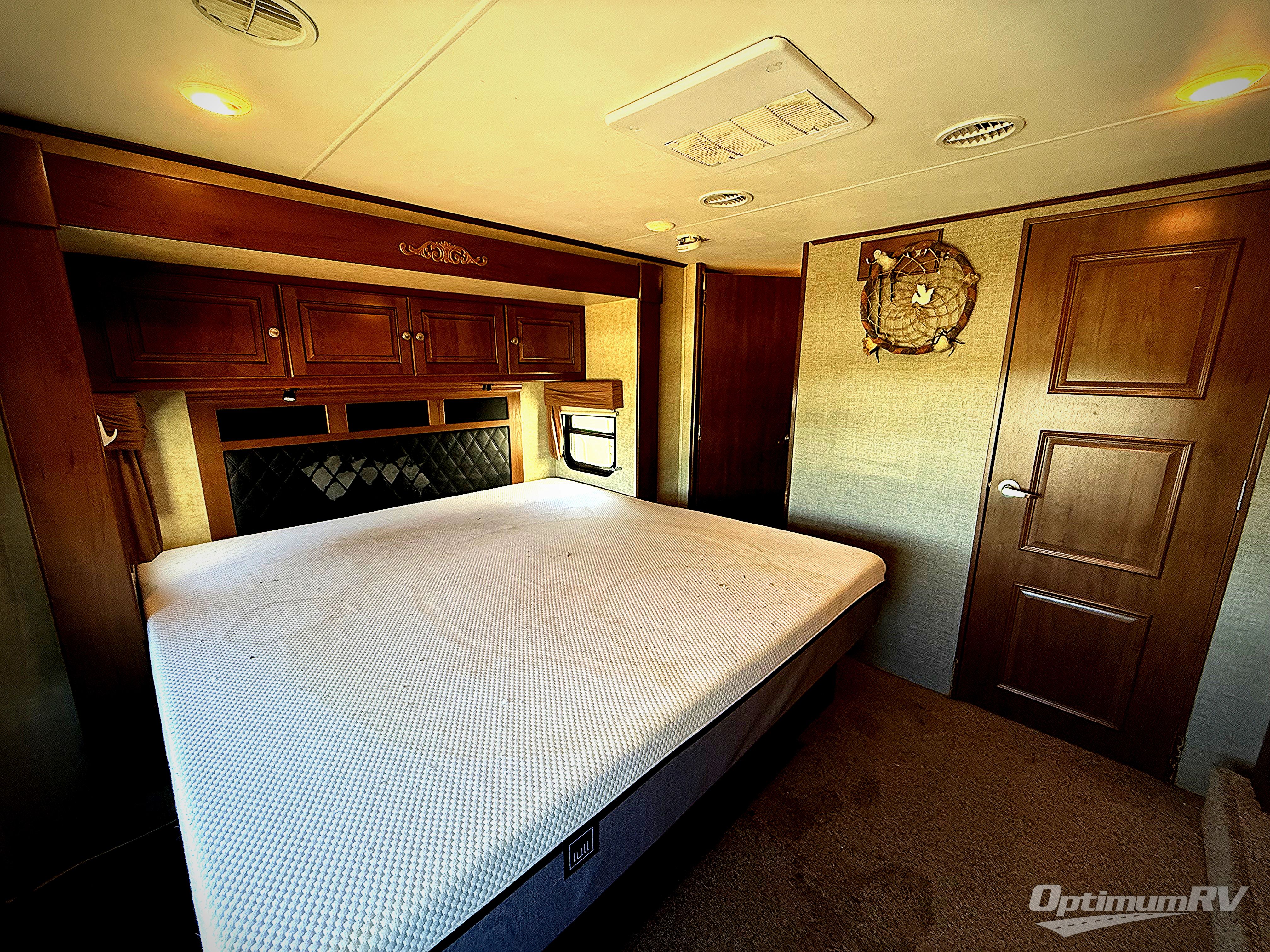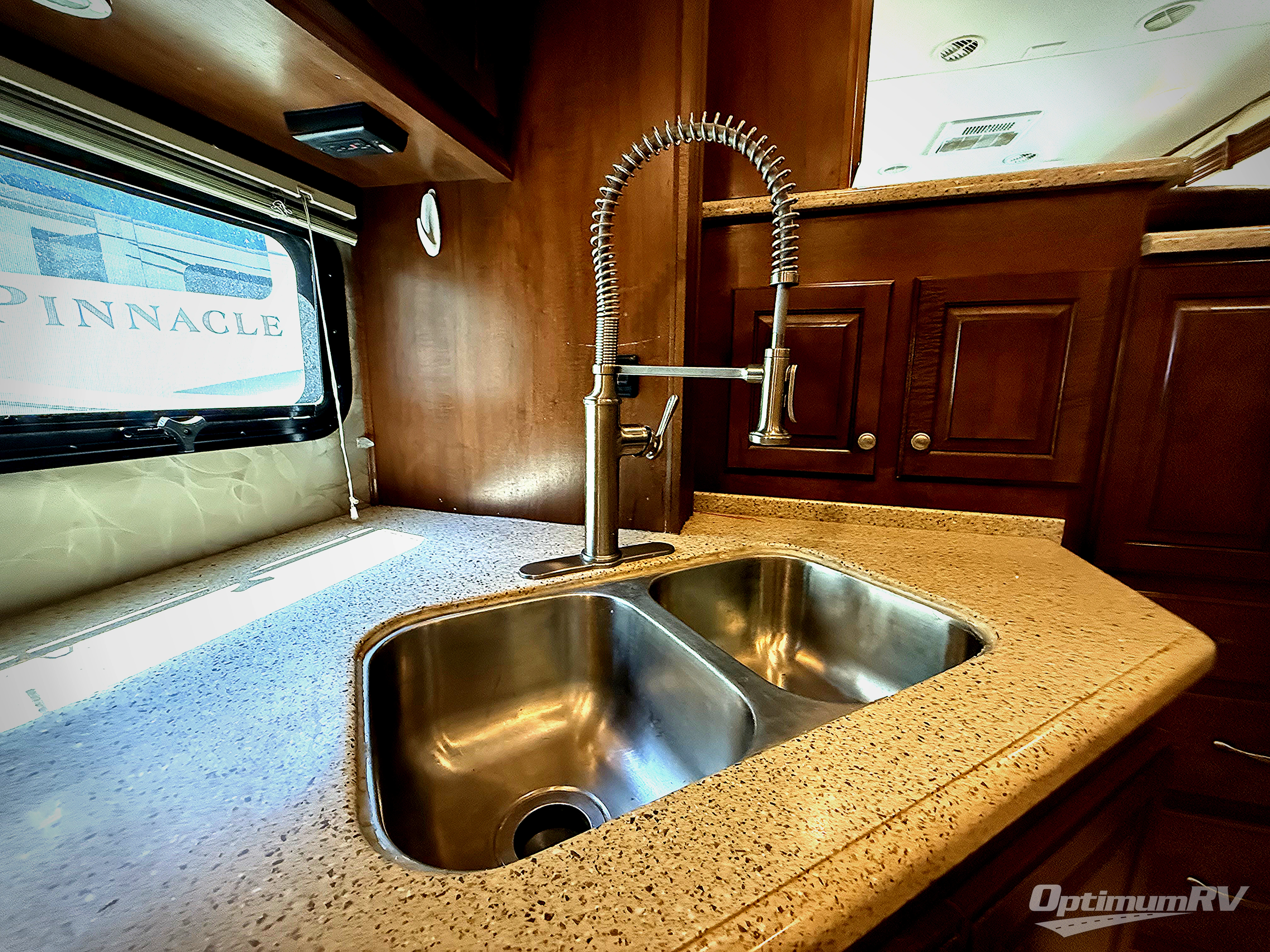 Step inside and head up to the raised living room which features dual opposing slides both with a sofa to enjoy. These can easily become additional sleeping space if needed at night. There is also theater seating for two at the top of the steps to your left. A great space to entertain or enjoy conversations with family and friends. The entire front wall shows off a large flat screen TV and entertainment center with storage both above and below.