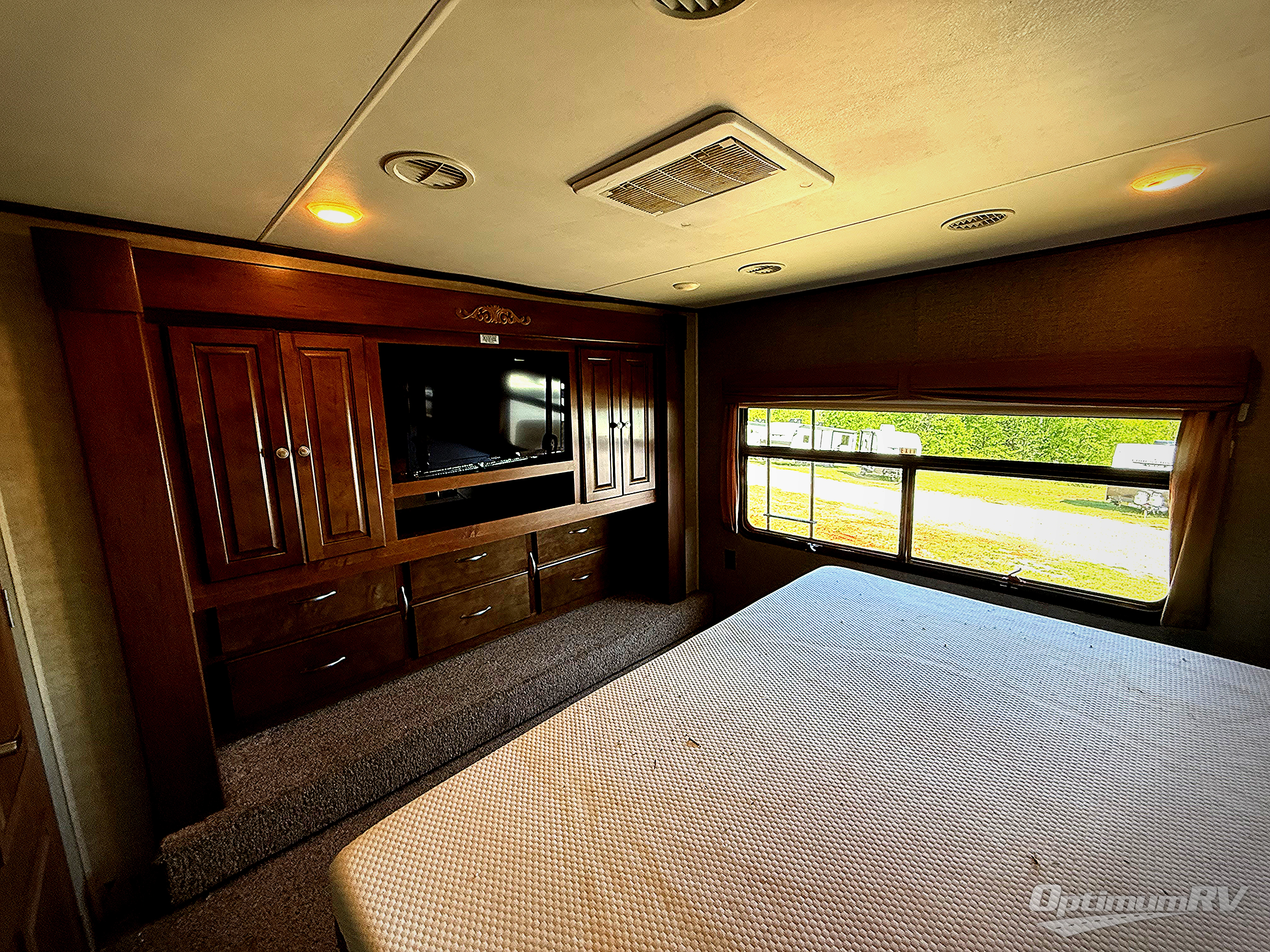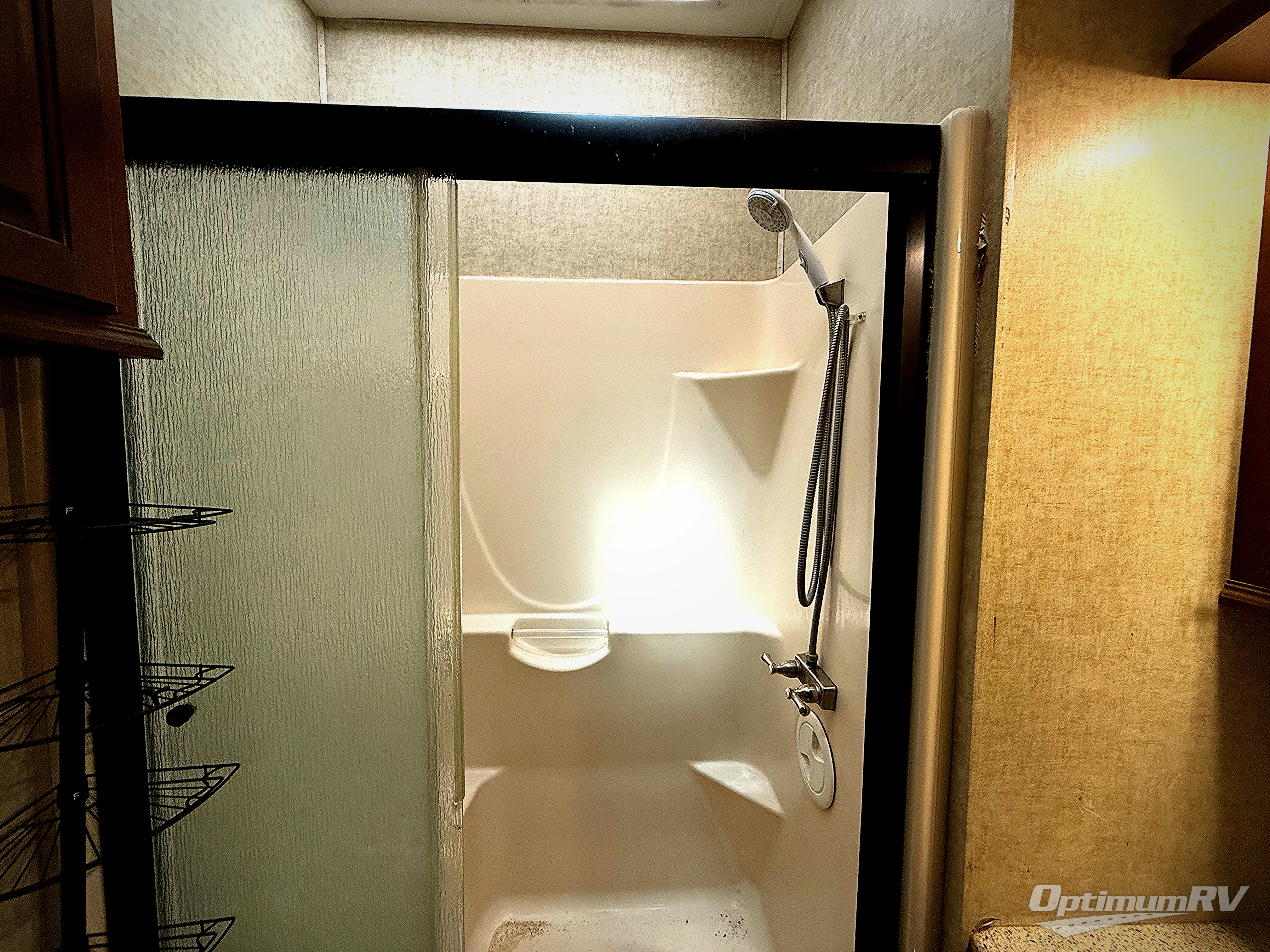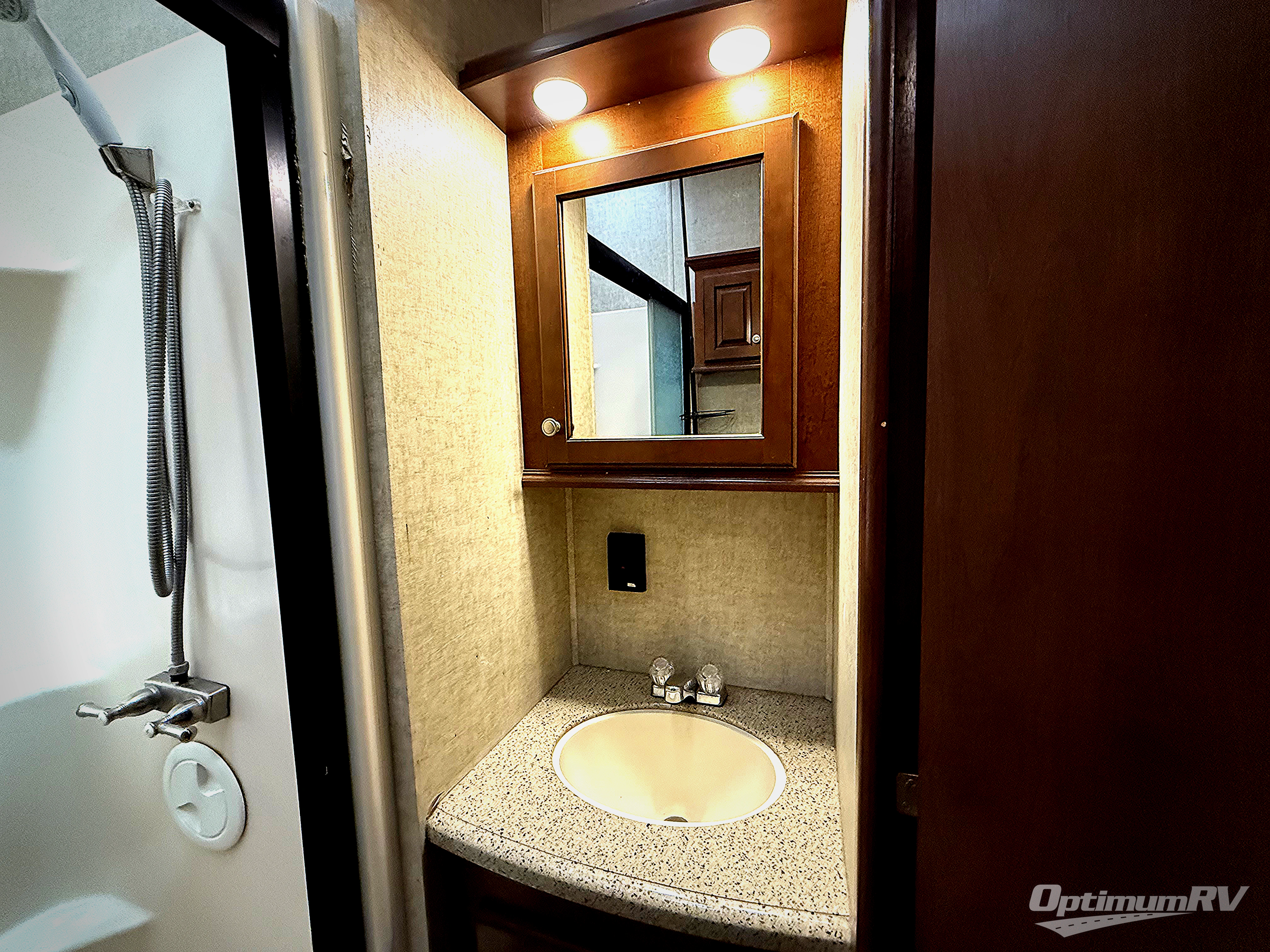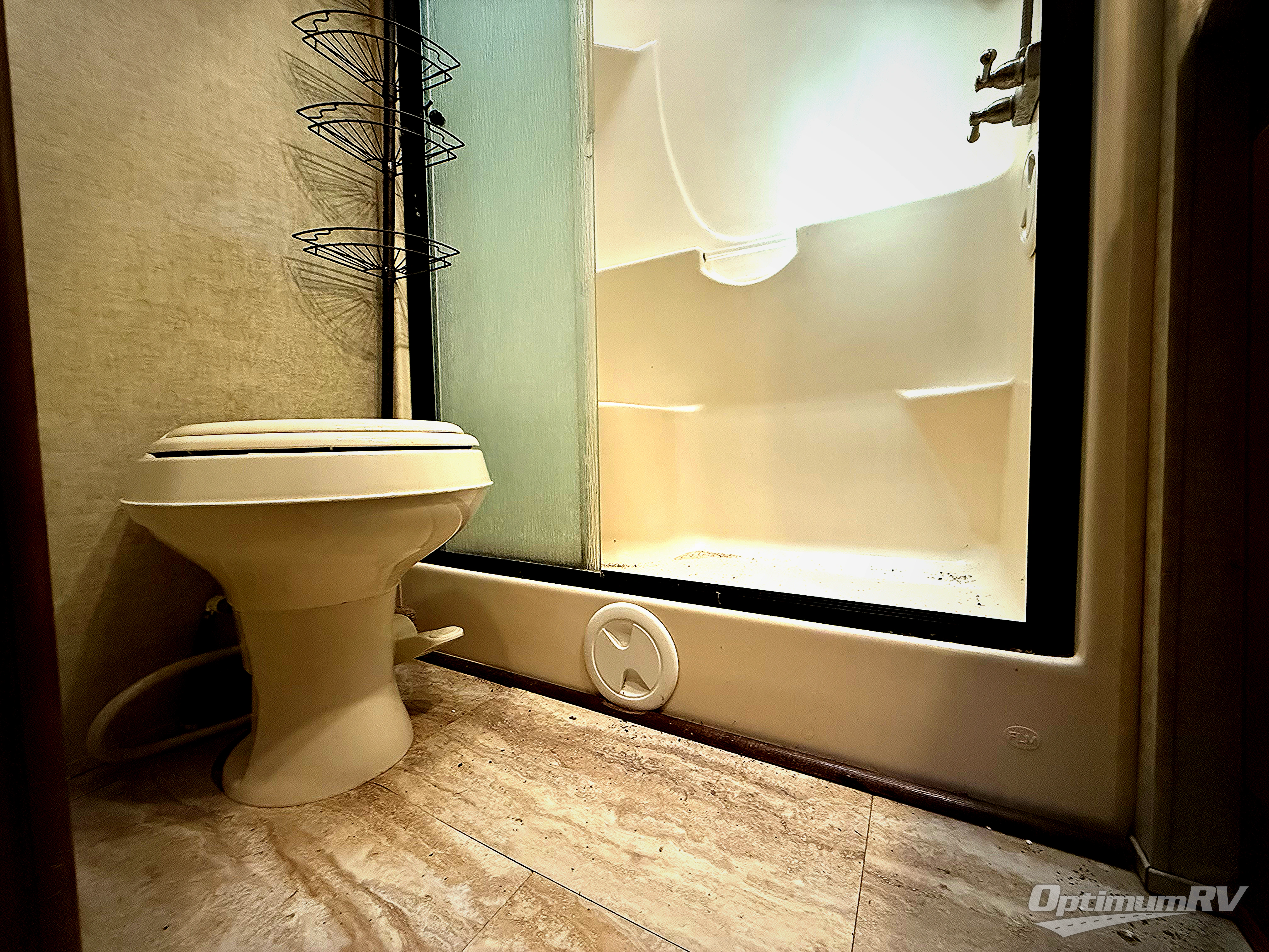 Head to the rear and find a side aisle bath with shower, toilet and sink. Just outside the bathroom door head up two more steps to a raised platform bedroom featuring a king bed slide and wardrobe slide out opposite.