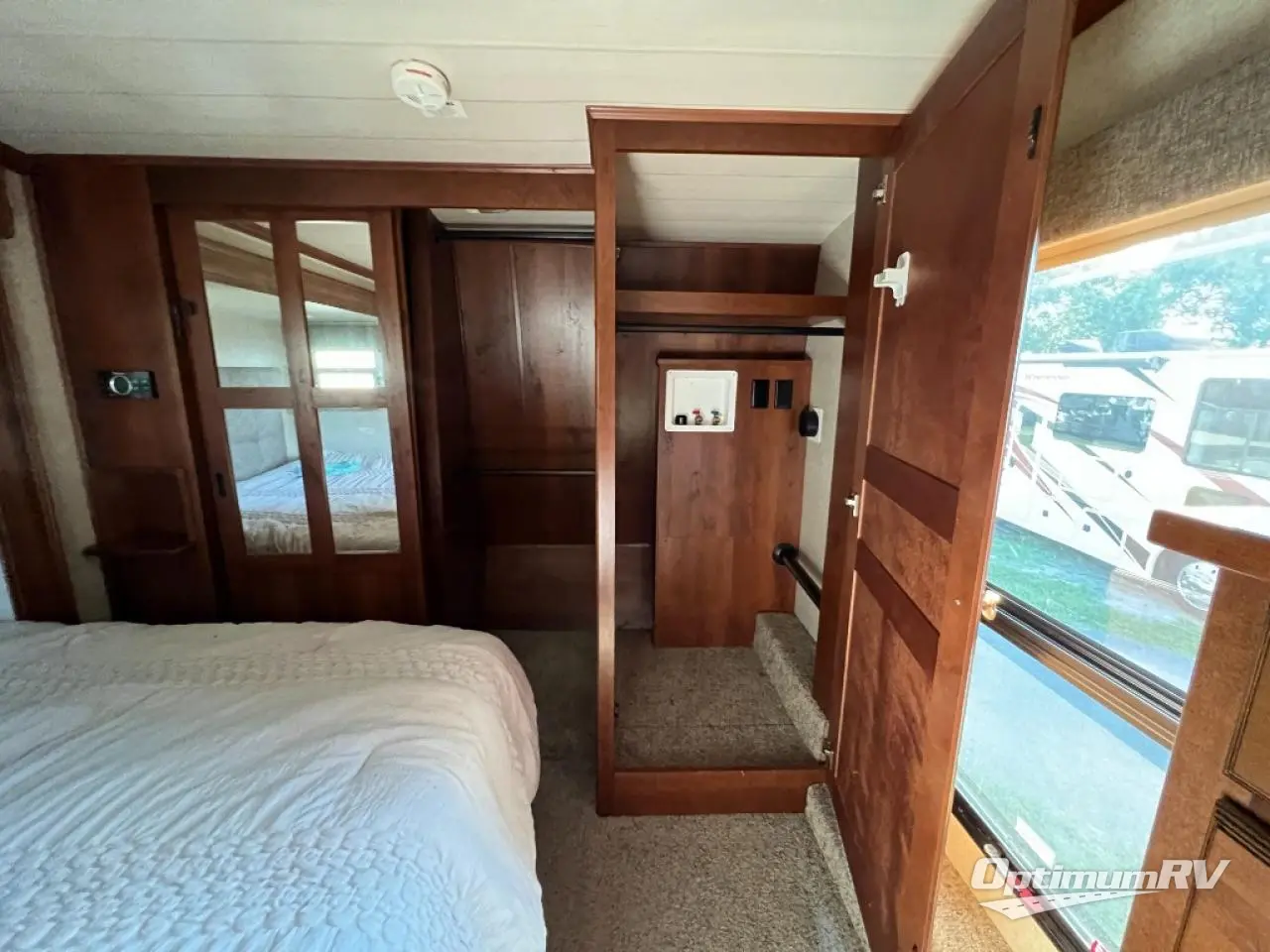 The front of this Bighorn model is where you can relax and unwind on a king bed slide out. Here you can enjoy a great night's sleep. There is a dresser opposite the bed, along with a front closet for hanging clothes which also features drawer space inside along the road side wall. There is also a corner closet that has been prepped for a washer and dryer if you choose to add for more convenience, plus so much more!