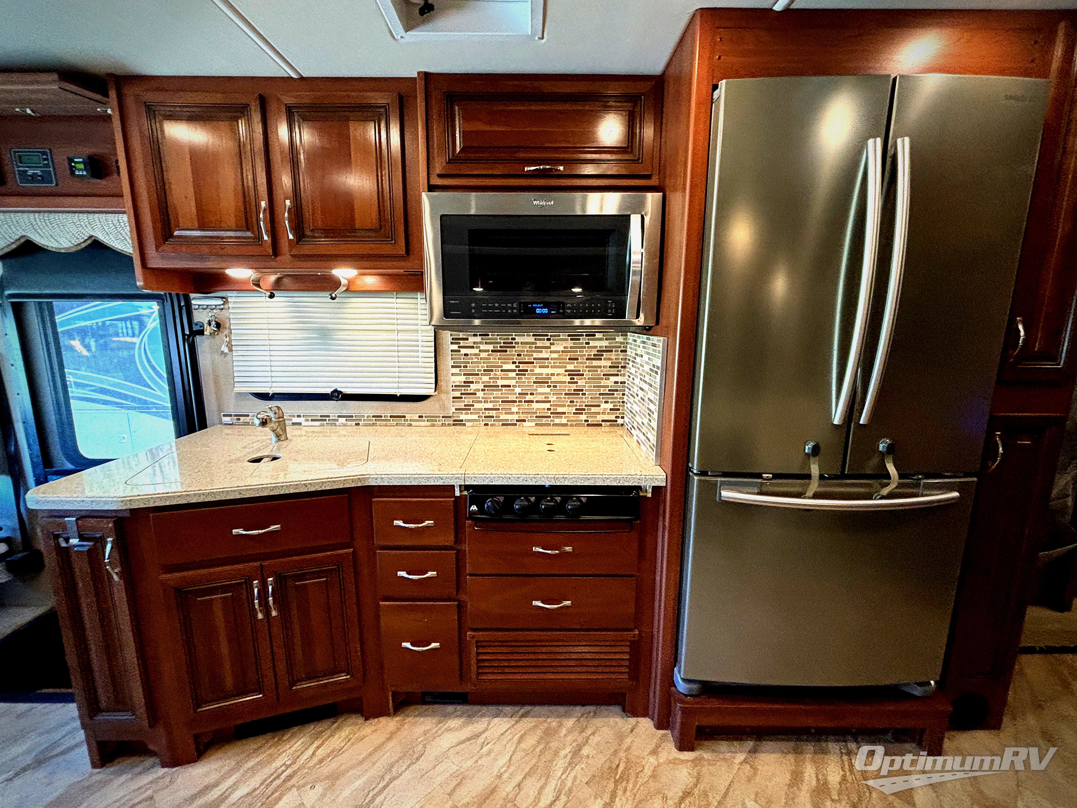 Along the curb side you will find a kitchen area that allows you to easily cook and prepare food along your journey. You will find a double sink, a three burner range with overhead microwave oven, refrigerator, and food pantry. There are also ample overhead cabinets for all of your dishes and things needed.