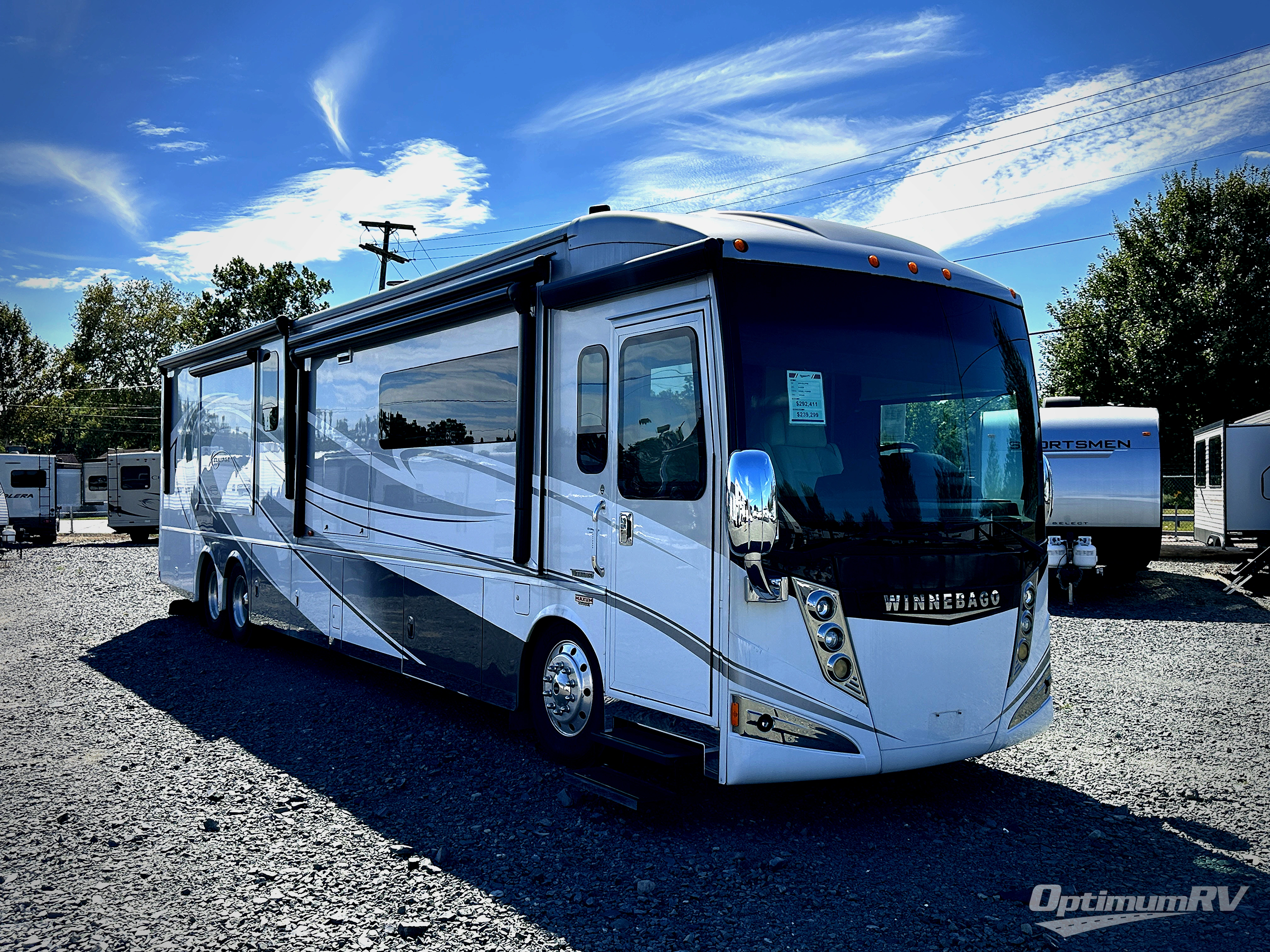 A sliding door leads you into the rear master bedroom where you will enjoy a king bed slide out including nightstands, plus overhead storage cabinets. The very rear features a master bath with BIG shower, slide out line cabinet, vanity with sink, and stackable washer/dryer, plus so much more!