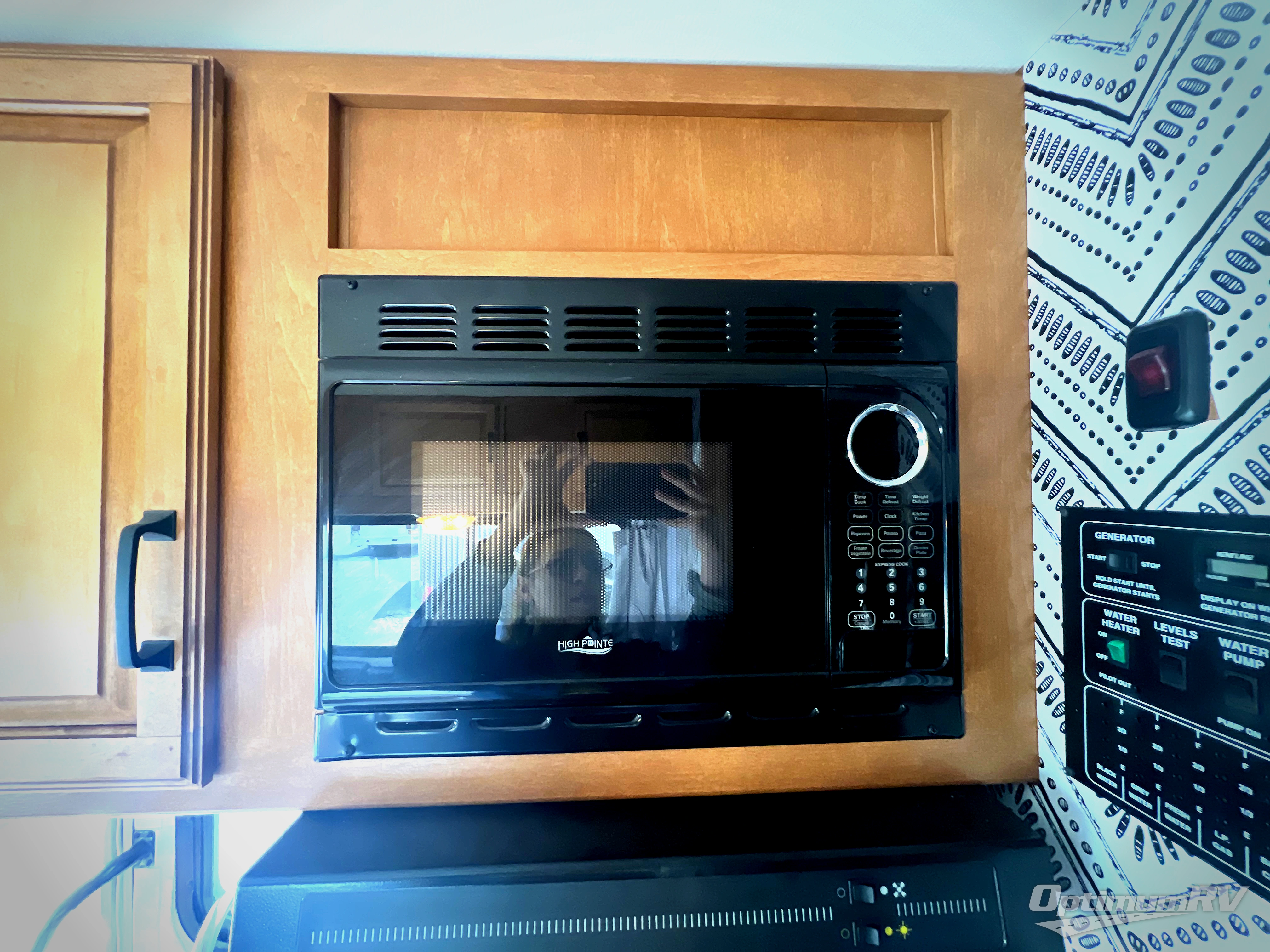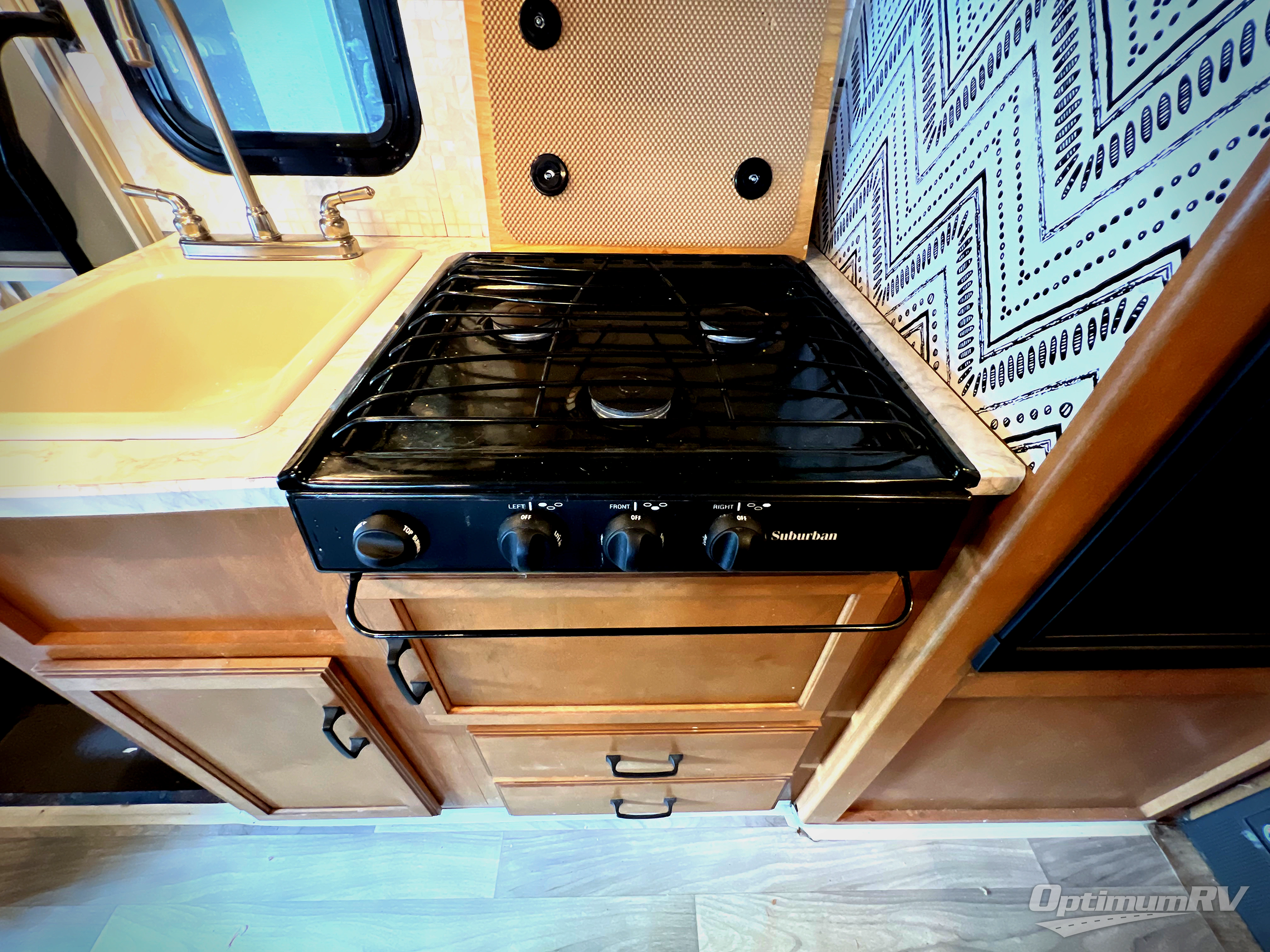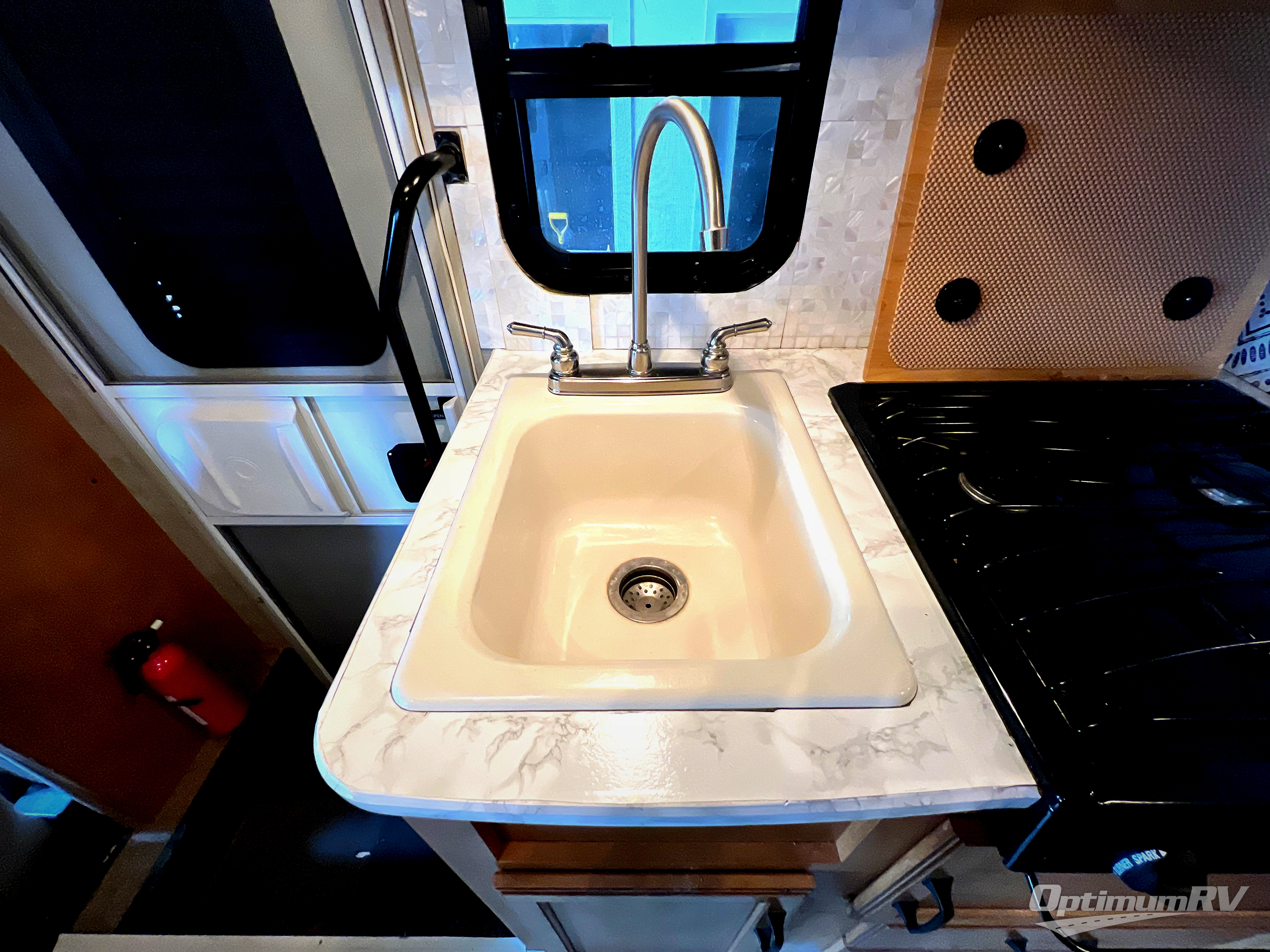 To the left of the main entry door enjoy a single sink, three burner range, refrigerator, and overhead storage. You will easily be able to prepare and cook food for your family.