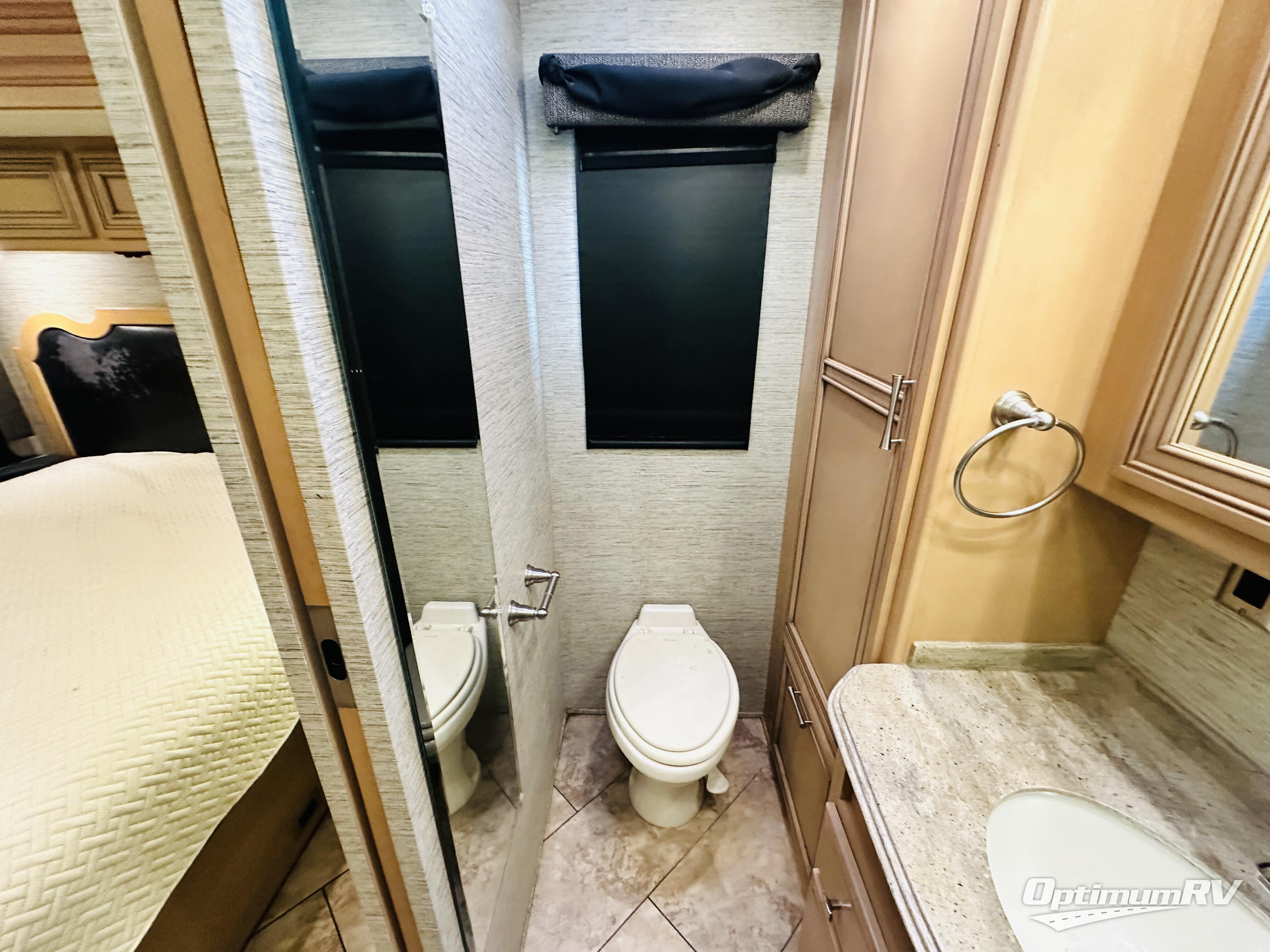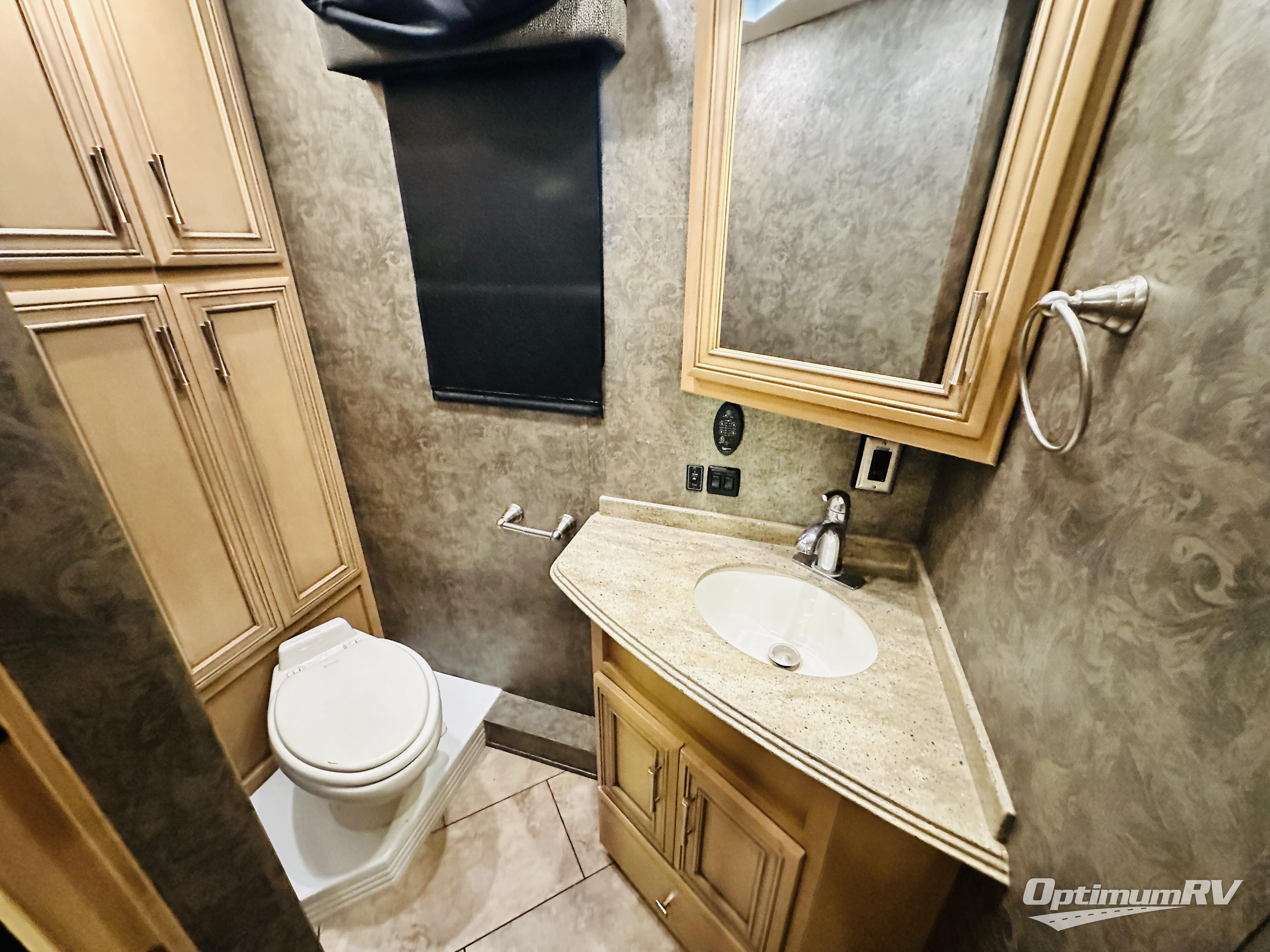 The master bath is located in the rear of the motor coach. The bath includes a toilet, corner shower, sink, and linen storage.