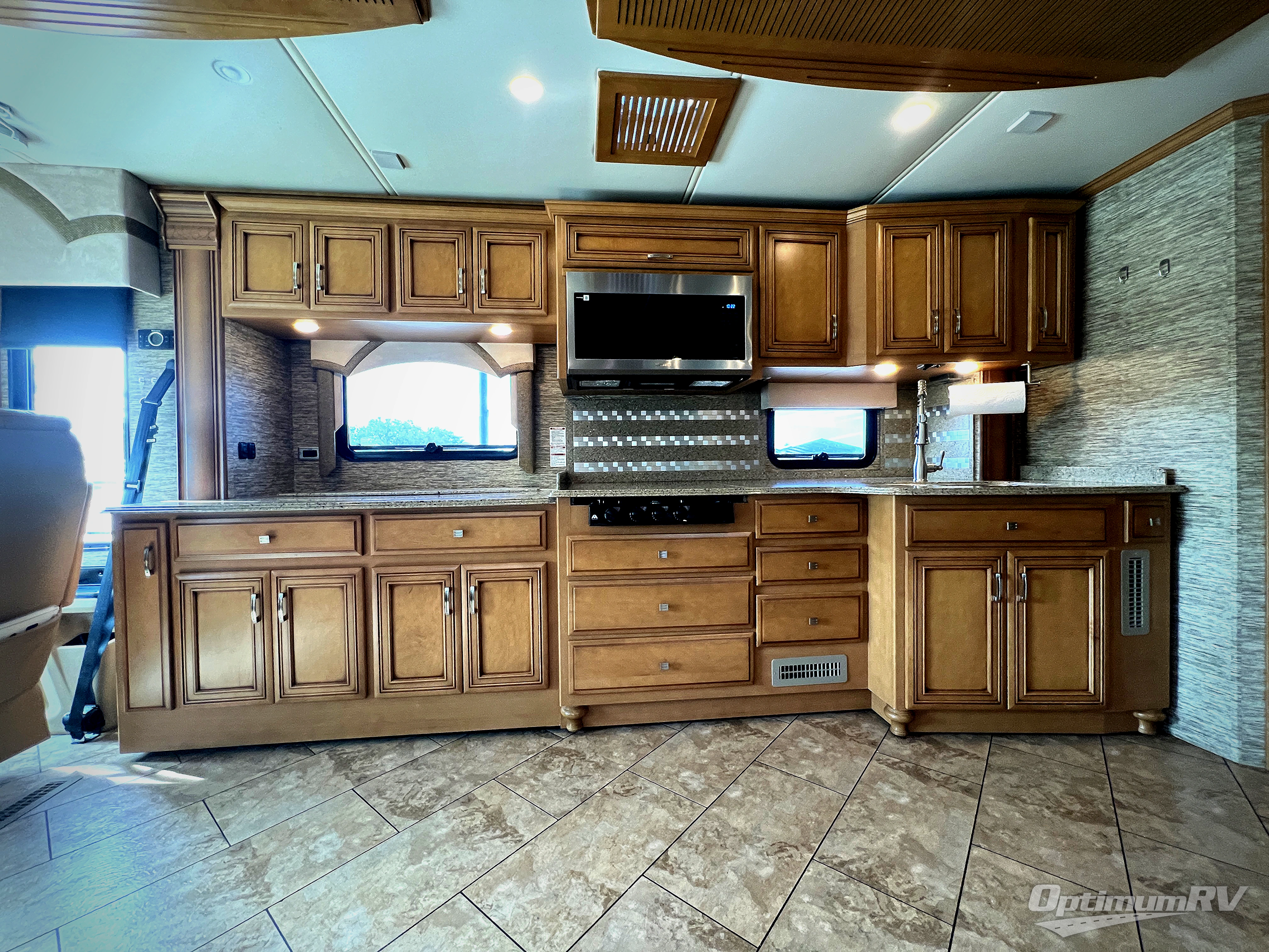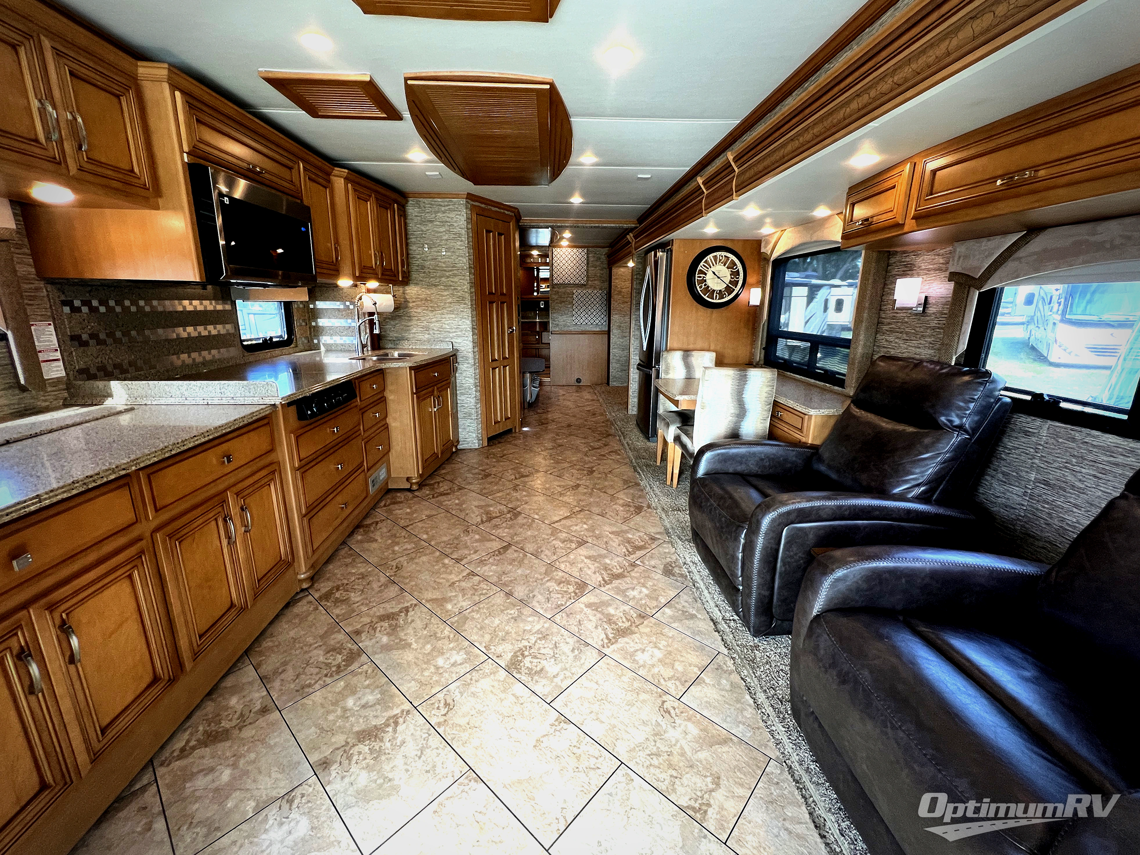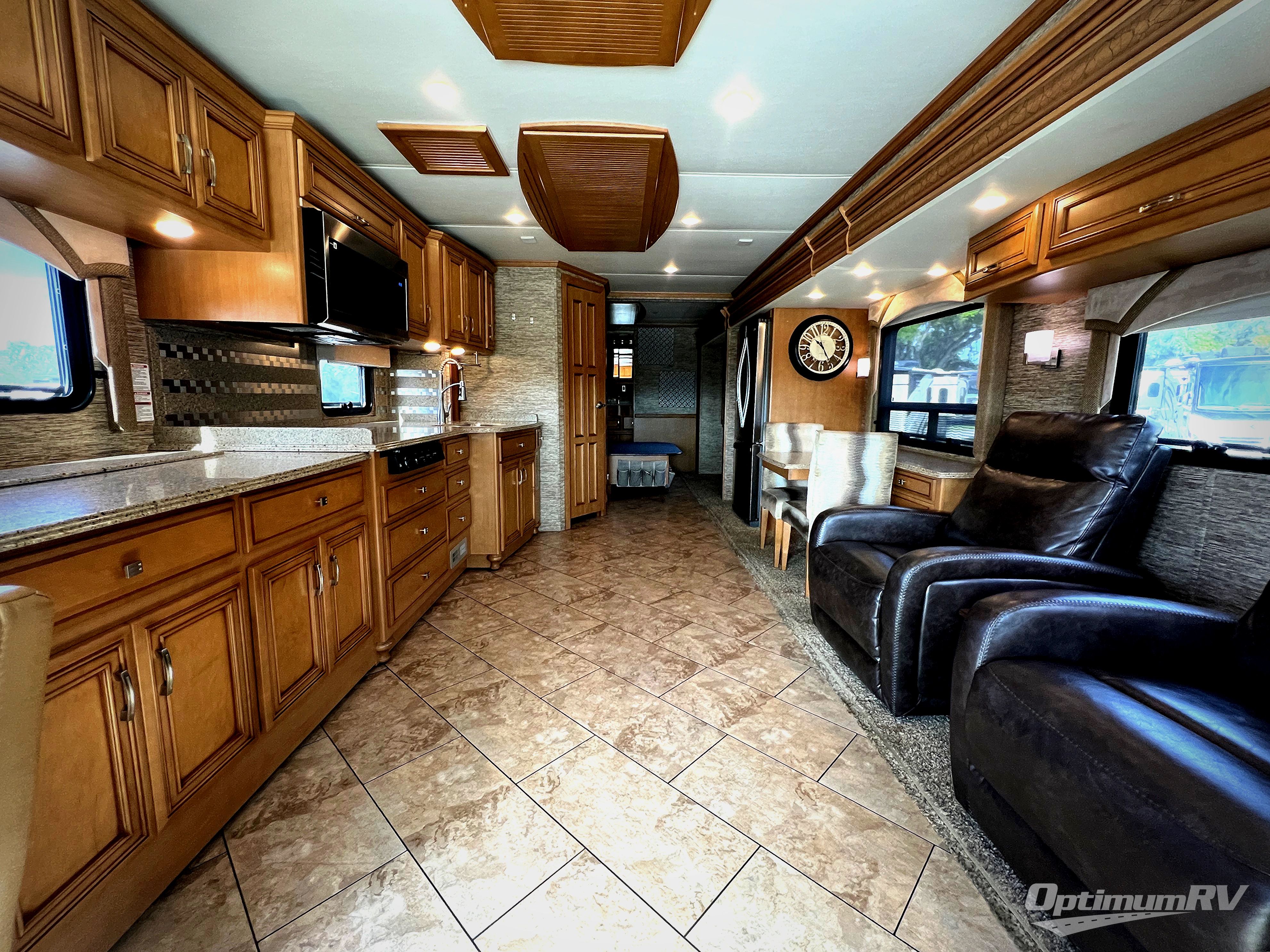 As you enter the coach, the full wall slide features a 74" hide-a-bed sofa, booth dinette, refrigerator, and pantry for your non-perishables, plus in the bedroom there are two wardrobes, chest of drawers, and an overhead TV. On the opposite side there is a double kitchen sink on an angled countertop, three burner range, fireplace with LED TV on a power lift, and overhead cabinets stretching the whole lengthn of the slide out.