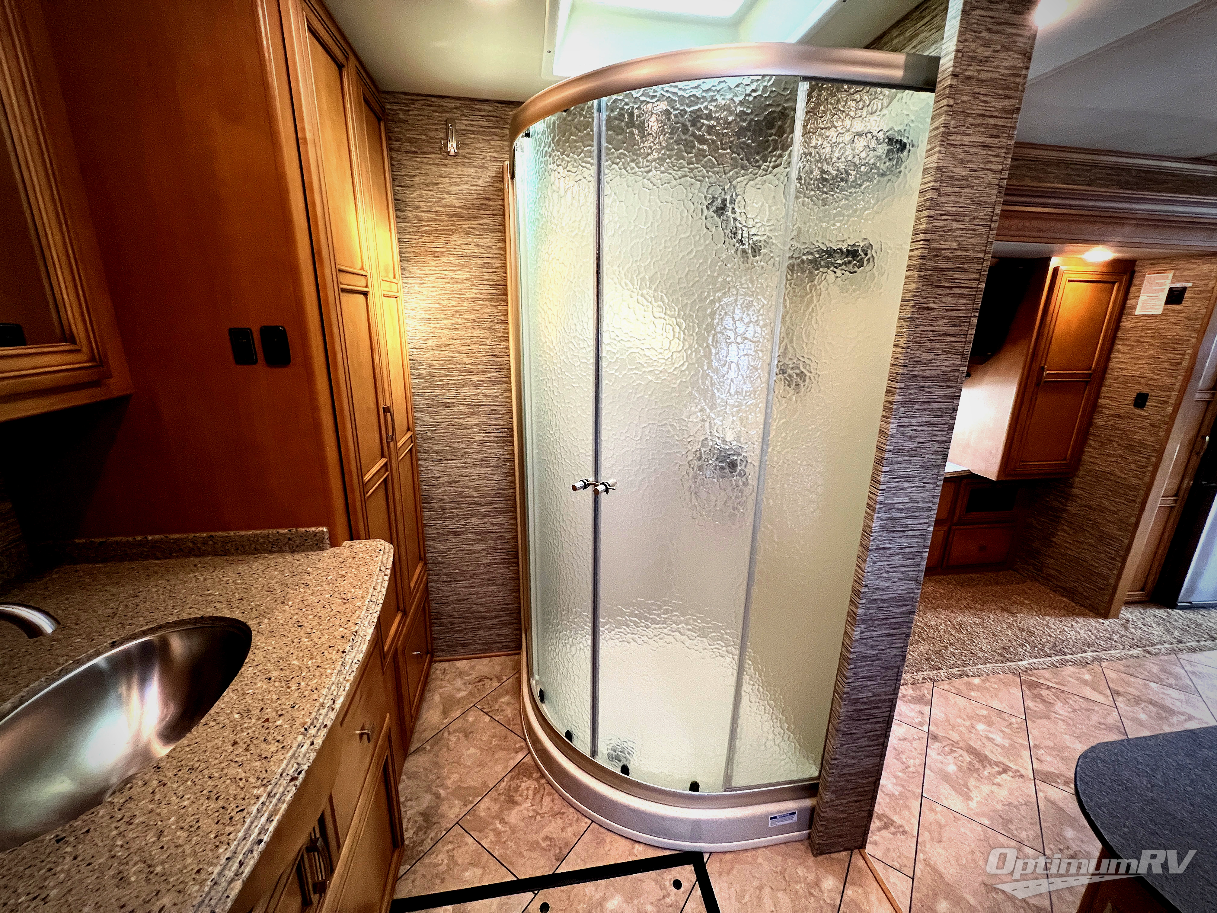 The walk through bedroom has a queen bed slide with nightstands on each side. In the rear of the coach is the master bath. There is a 36" corner shower and toilet, plus a wardrobe with bi-fold doors, sink with overhead cabinet, and wardrobe or washer and dryer along the rear wall.