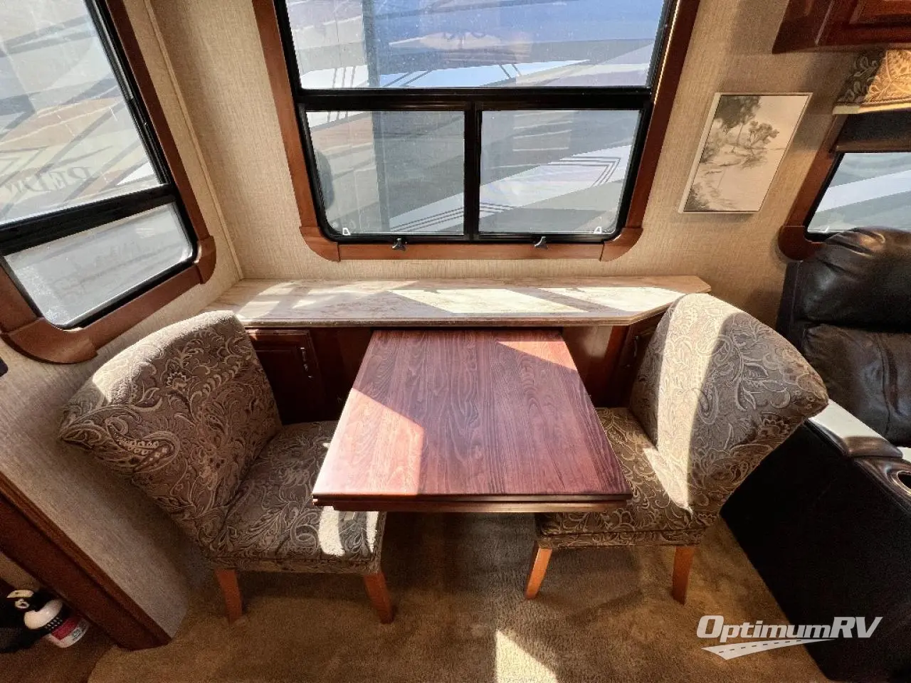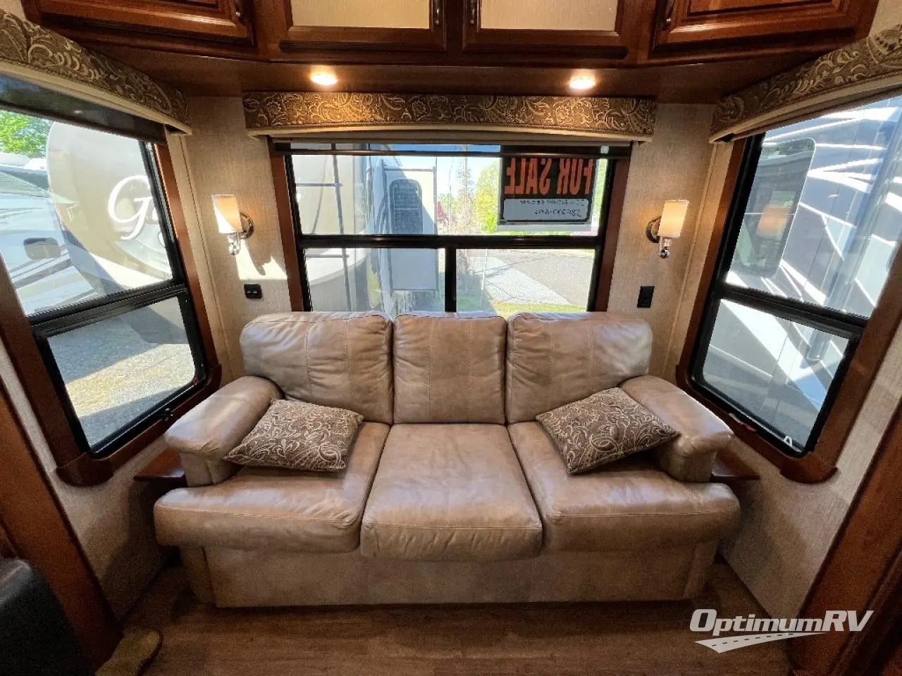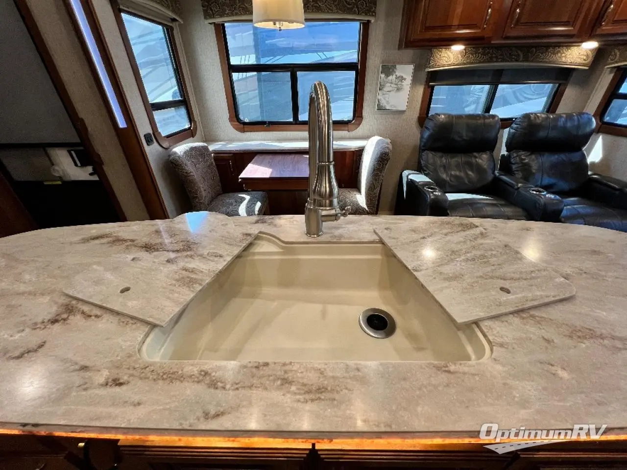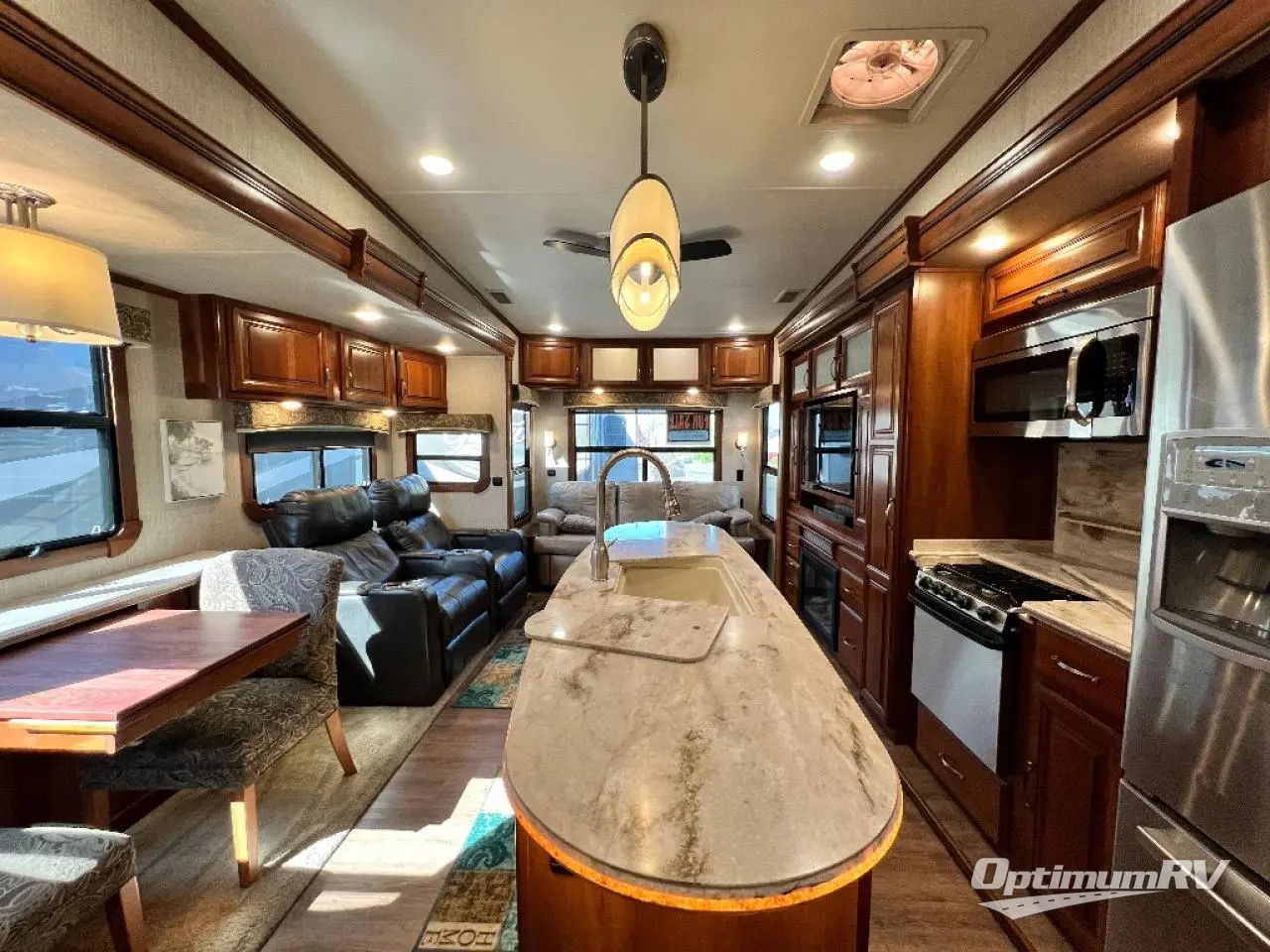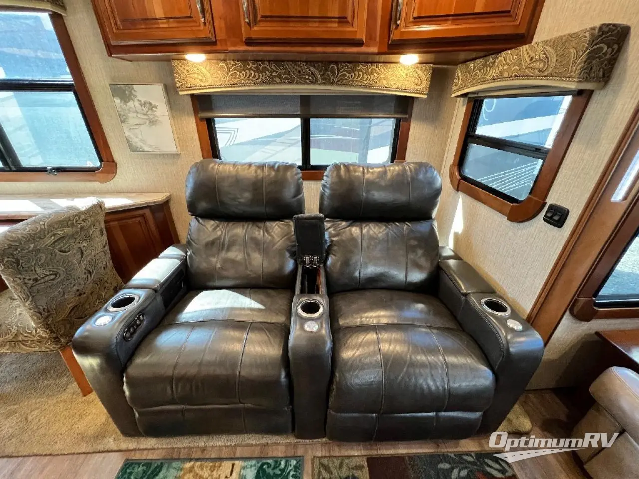Back to the main combined kitchen and living area find a slide to the left of the door that features a dinette for two, and two wall hugger recliners with overhead storage. There is a sofa along the rear wall with overhead cabinets as well.