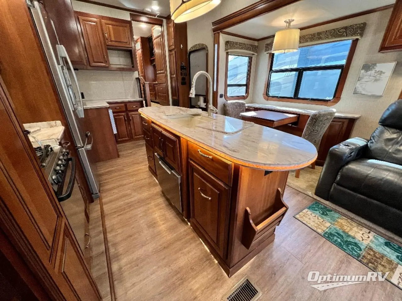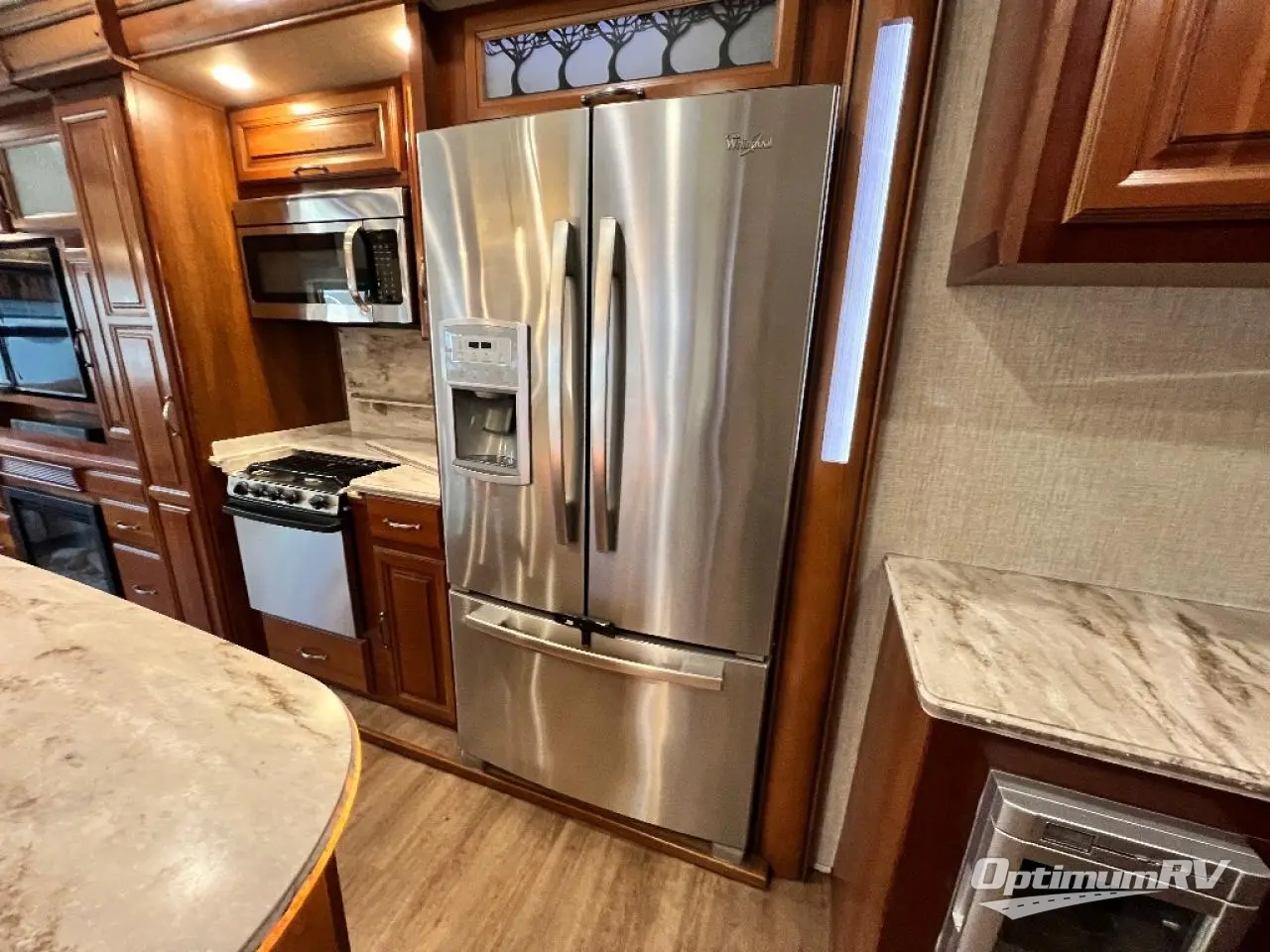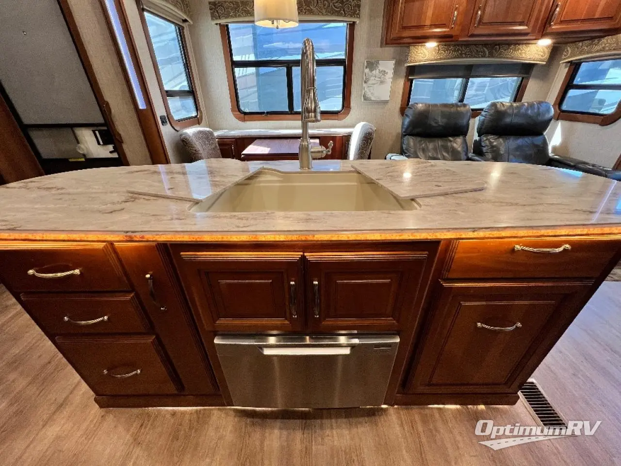 The slide opposite the door side features an entertainment center with pull-out desk including overhead cabinets, and all the kitchen appliances that you would need to create meals and snacks easily for your family like; a pantry,a three burner range with microwave, counter area, and refrigerator. The center kitchen island features additional storage with cupboards and drawers, a large kitchen sink for easy cleanup, and more.