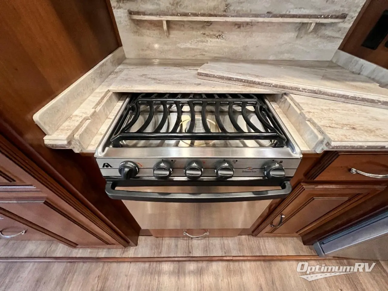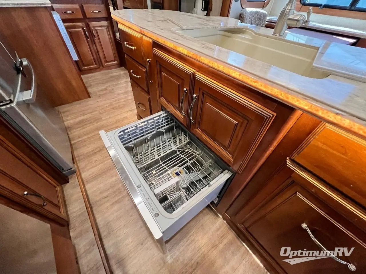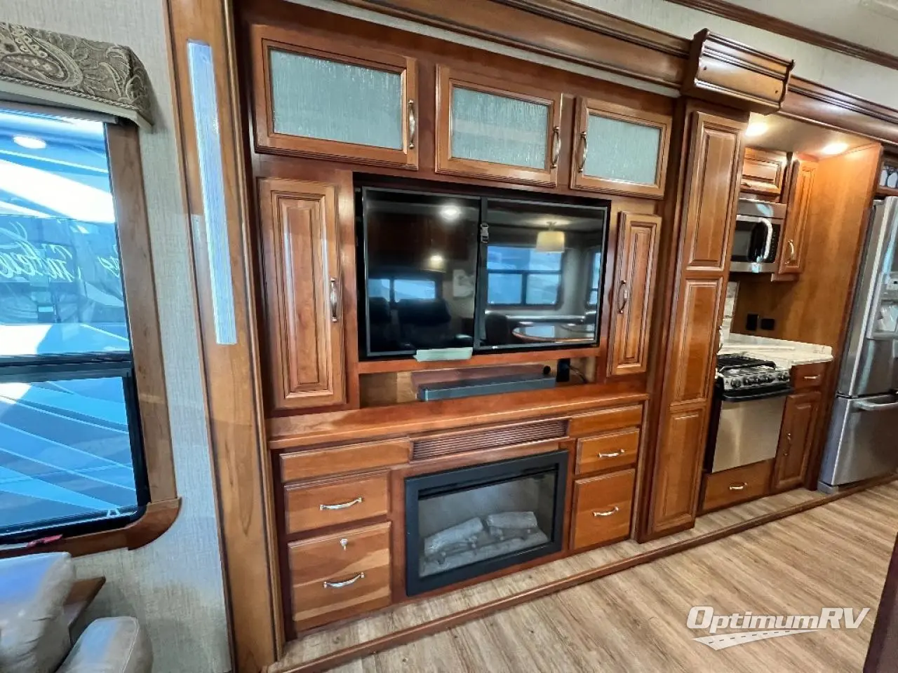 The slide opposite the door side features an entertainment center with pull-out desk including overhead cabinets, and all the kitchen appliances that you would need to create meals and snacks easily for your family like; a pantry,a three burner range with microwave, counter area, and refrigerator. The center kitchen island features additional storage with cupboards and drawers, a large kitchen sink for easy cleanup, and more.