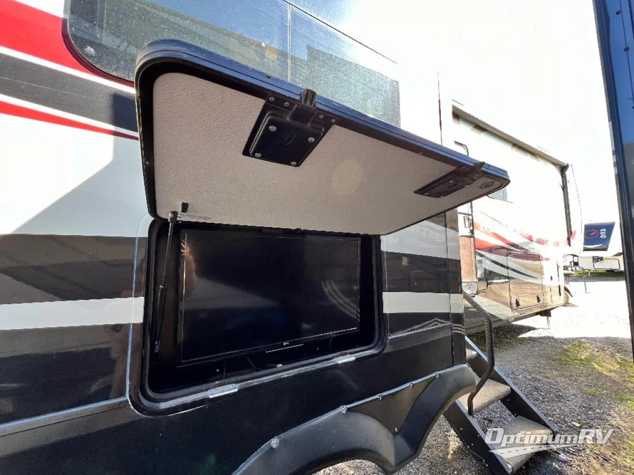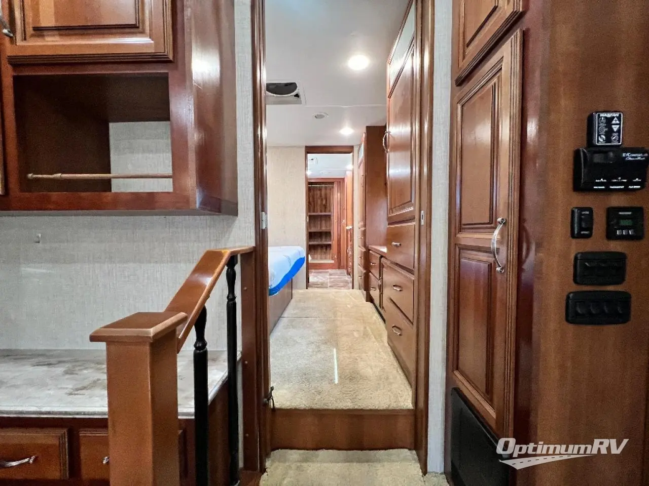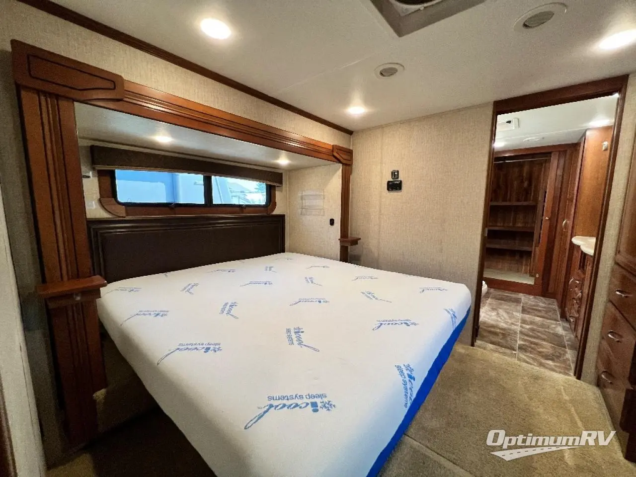 As you enter notice the handy closet just to the right of the door. As you continue right heading up the steps you will see a King bed slide with nightstands on your left, and an entertainment center with 39" LED TV with a dresser on either side along the curb side wall on your right.