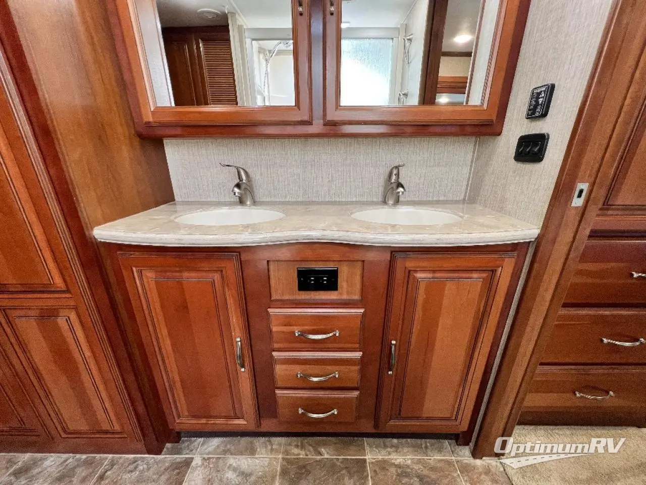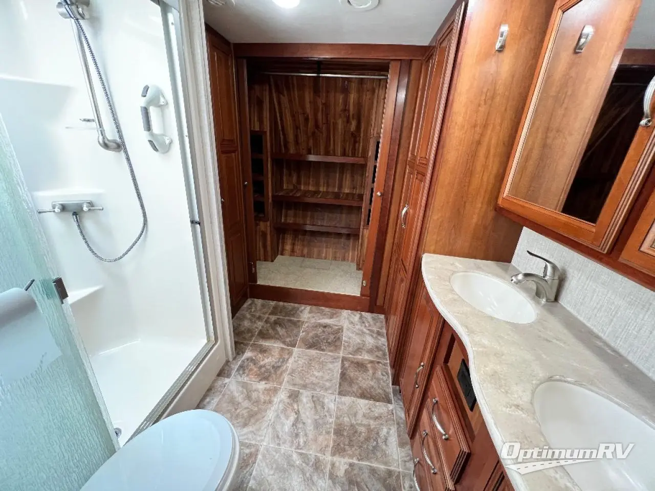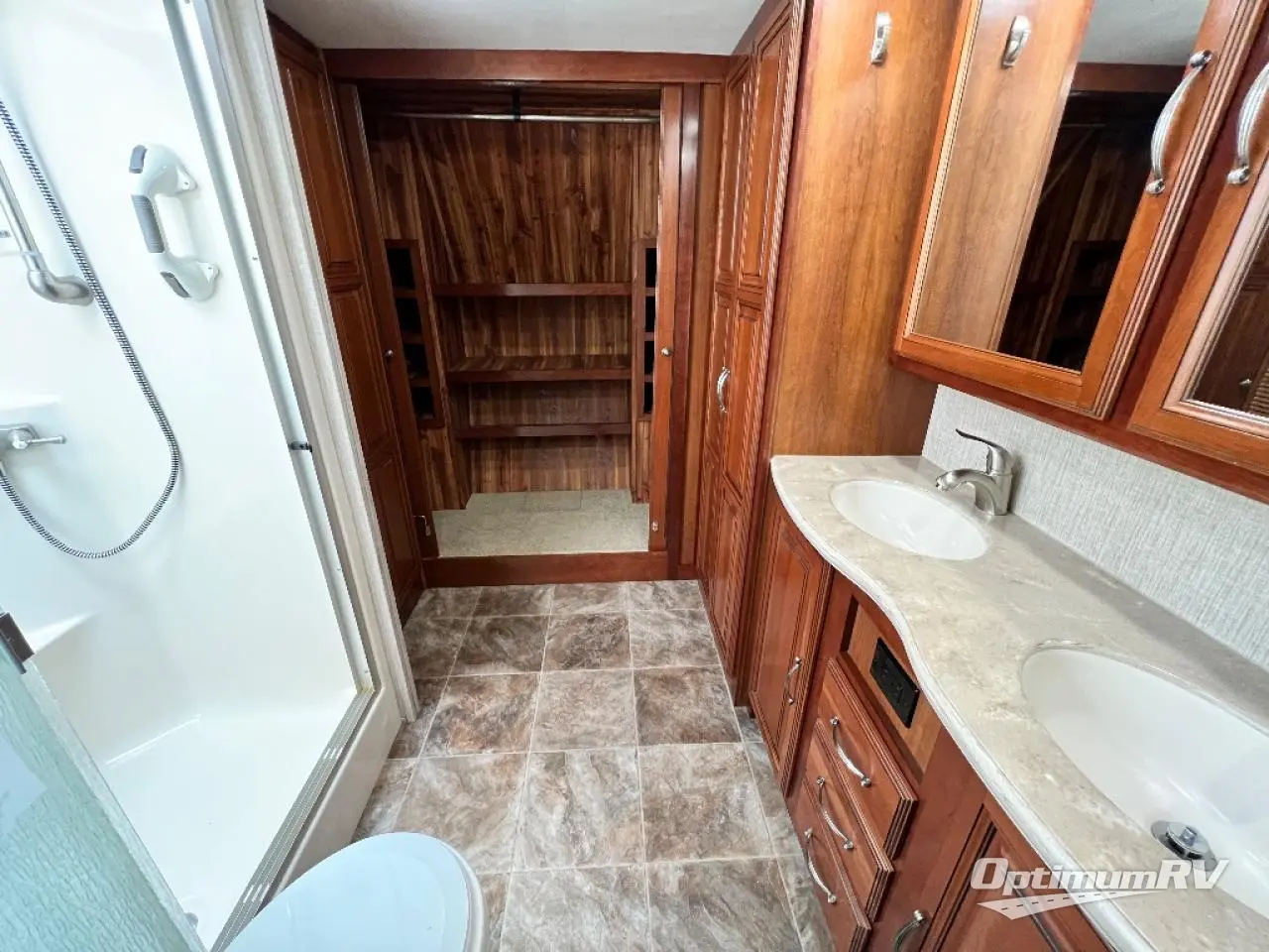 Continuing toward the front through a sliding pocket door leads to a spacious front master bath which features a large vanity with dual sinks, a medicine cabinet, a double door linen cabinet, a full front wall wardrobe, optional washer/dryer closet, plus tub/shower, and a toilet.
