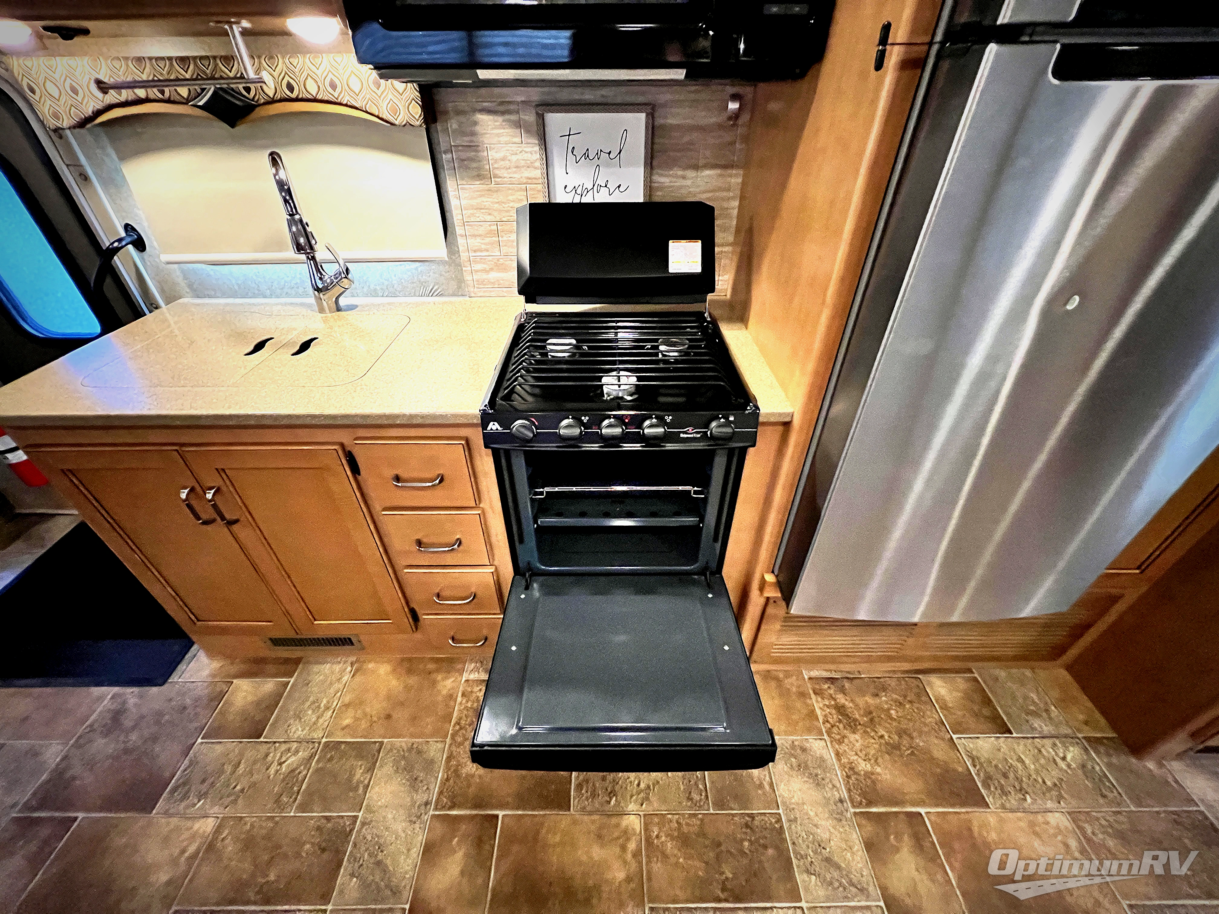 To the left of the entry door find a kitchen with all the amenities needed to create gourmet meals and snacks on the go. There is a double kitchen sink, a three burner range with overhead microwave oven, residential refrigerator, and a pull-out pantry. The pull-out pantry offers plenty of storage for dry and canned food items you wish to take along.